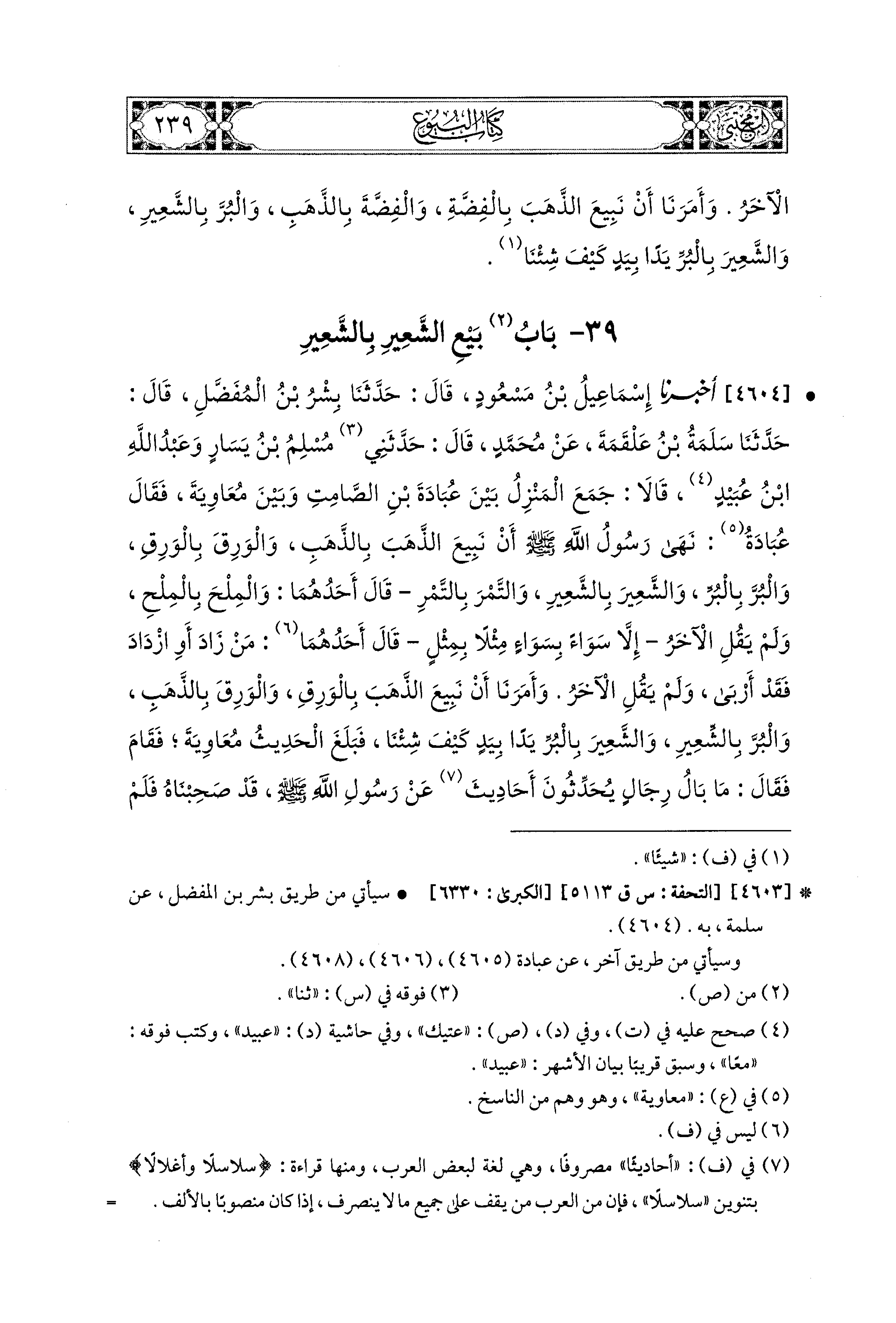 4604- أَخبَرَنا إِسماعِيلُ بْنُ مَسْعُودٍ، قال: حَدثنا بِشْرُ بْنُ المُفَضَّلِ، قال: حَدثنا سَلَمَةُ بْنُ عَلْقَمَةَ، عَن مُحَمدٍ، قَالَ: حَدَّثَني مُسْلِمُ بْنُ يَسَارٍ، وَعَبدُ اللهِ بْنُ عُبَيدٍ قَالاَ: جَمَعَ المَنْزِلُ بَيْنَ عُبَادَةَ بْنِ الصَّامِتِ وَبَيْنَ مُعَاوِيَةَ، فَقَالَ عُبَادَةُ: نَهَى رَسُولُ اللهِ صَلى الله عَليه وسَلم أَنْ نَبِيعَ الذَّهَبَ بِالذَّهَبِ، وَالوَرِقَ بِالوَرِقِ، وَالبُرَّ بِالبُرِّ، وَالشَّعِيرَ بِالشَّعِيرِ، وَالتَّمْرَ بِالتَّمْرِ، قَالَ أَحَدُهُمَا: وَالمِلْحَ بِالمِلْحِ، وَلَمْ يَقُلِ الآخَرُ: إِلاَّ سَوَاءً بِسَوَاءٍ مِثْلاً بِمِثْلٍ، قَالَ أَحَدُهُمَا: مَنْ زَادَ أَوِ ازْدَادَ فَقَدْ أَرْبَى، وَلَمْ يَقُلِ الآخَرُ، وَأَمَرَنَا أَنْ نَبِيعَ الذَّهَبَ بِالوَرِقِ، وَالوَرِقَ بِالذَّهَبِ، وَالبُرَّ بِالشَّعِيرِ، وَالشَّعِيرَ بِالبُرِّ، يَدًا بِيَدٍ كَيْفَ شِئْنَا.