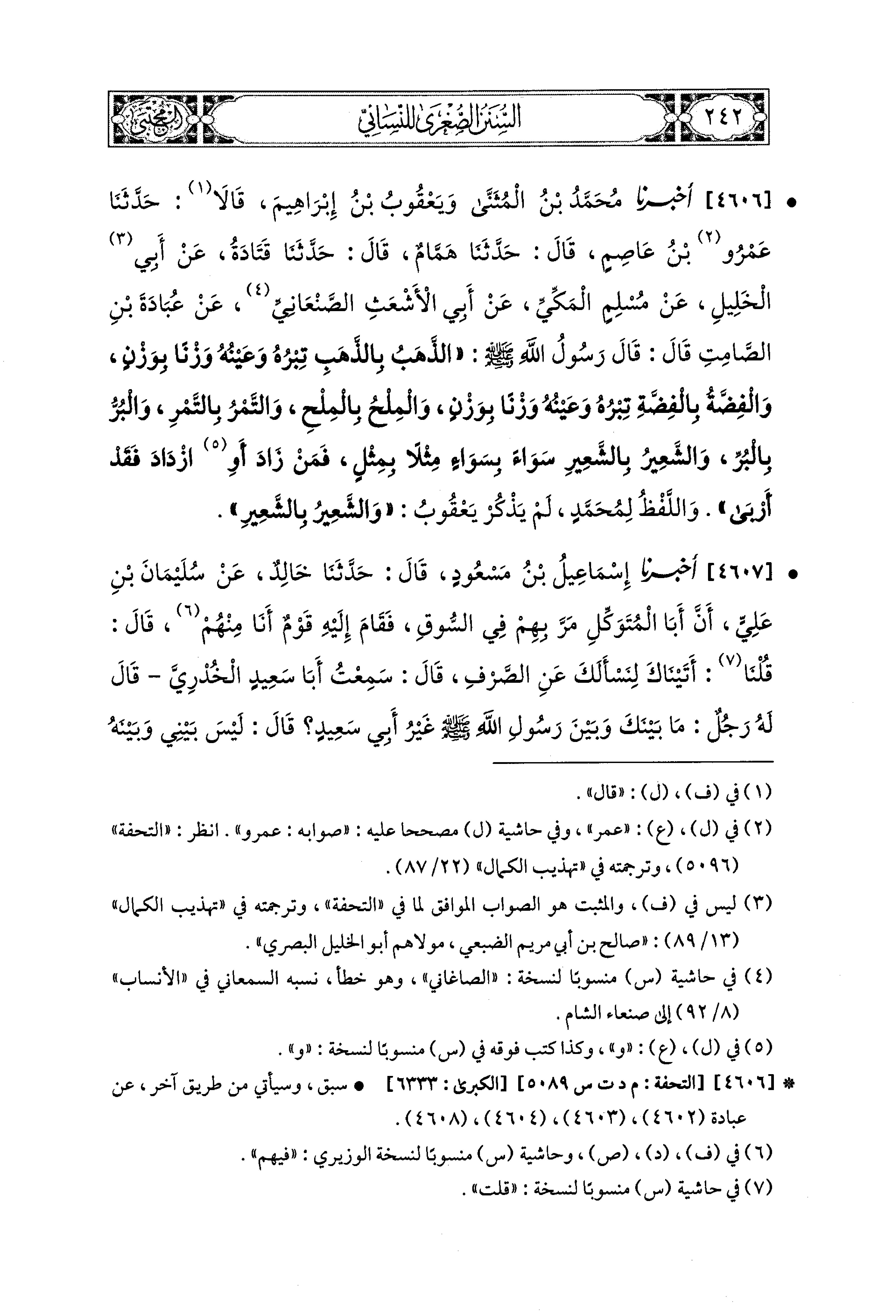 4606 - أَخبَرَنا مُحَمد بْنُ المُثَنَّى، وإِبراهِيمُ بْنُ يَعْقُوبُ (1)، قَالاَ: حَدَّثَنَا عَمْرُو بْنُ عَاصِمٍ، قال: حَدثنا هَمَّامٌ، قال: حَدثنا قَتَادَةُ، عَن أَبِي الخَلِيلِ، عَن مُسْلِمٍ المَكِّيِّ، عَن أَبِي الأَشْعَثِ الصَّنْعَانيِّ، عَن عُبَادَةَ بْنِ الصَّامِتِ قَالَ: قَالَ رَسُولُ اللهِ صَلى الله عَليه وسَلم: الذَّهَبُ بِالذَّهَبِ تِبْرُهُ وَعَيْنُهُ وَزْنًا بِوَزْنٍ، وَالفِضَّةُ بِالفِضَّةِ تِبْرُهُ وَعَيْنُهُ وَزْنًا بِوَزْنٍ، وَالمِلْحُ بِالمِلْحِ، وَالتَّمْرُ بِالتَّمْرِ، وَالبُرُّ بِالبُرِّ، وَالشَّعِيرُ بِالشَّعِيرِ، سَوَاءً بِسَوَاءٍ مِثْلاً بِمِثْلٍ، فَمَنْ زَادَ أَوِ ازْدَادَ فَقَدْ أَرْبَى.