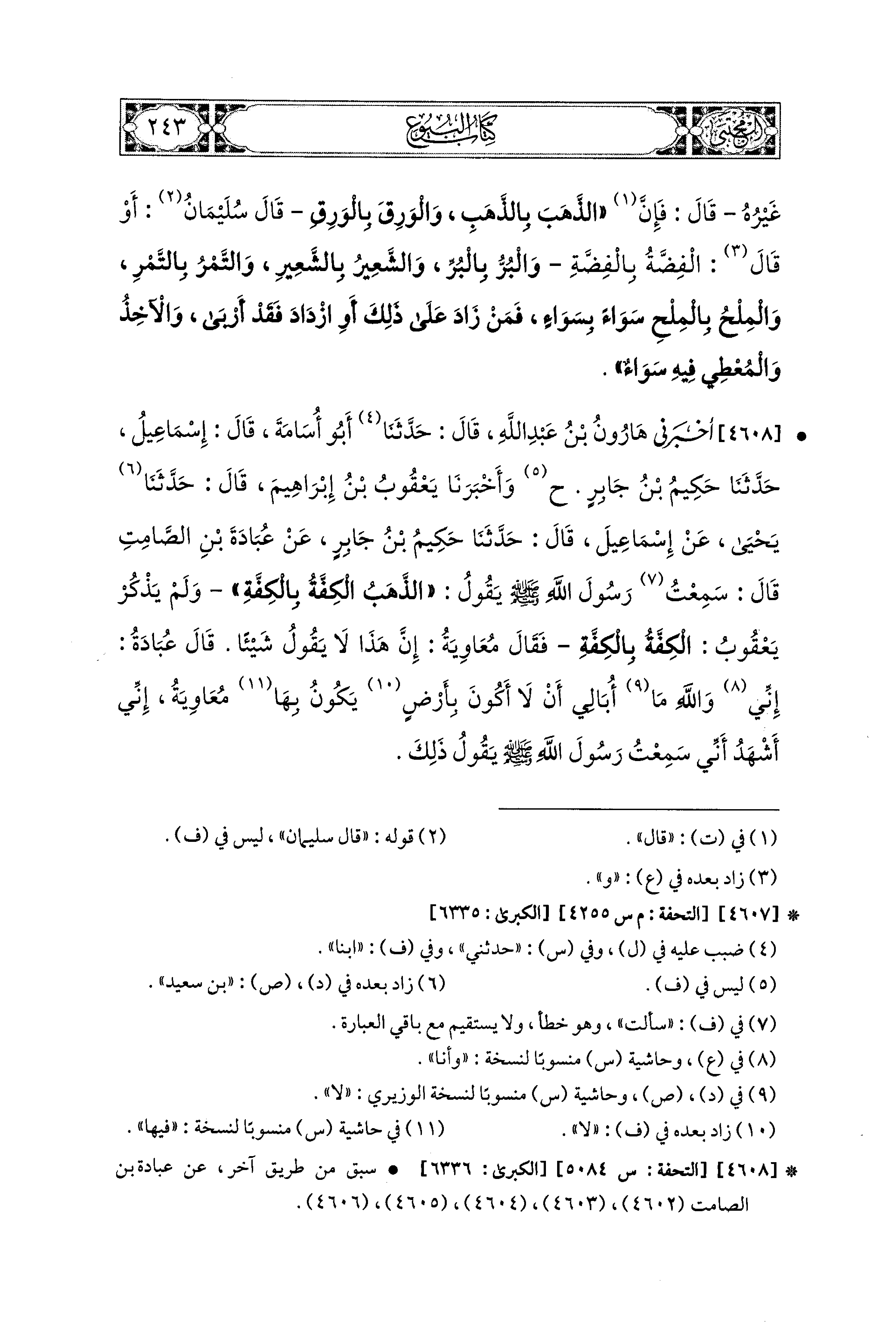 4608- أَخْبَرَني هَارُونُ بْنُ عَبدِ اللهِ، قال: حَدثنا أَبو أُسَامَةَ قَالَ: قَالَ إِسماعِيلُ: حَدَّثَنَا حَكِيمُ بْنُ جَابِرٍ (ح) وَأَخبَرنا يَعْقُوبُ بْنُ إِبراهِيمَ، قال: حَدثنا يَحيَى، عَن إِسماعِيلَ، قال: حَدثنا حَكِيمُ بْنُ جَابِرٍ، عَن عُبَادَةَ بْنِ الصَّامِتِ، قَالَ: سَمِعْتُ رَسُولَ اللهِ صَلى الله عَليه وسَلم يَقُولُ: الذَّهَبُ الكِفَّةُ بِالكِفَّةِ، وَلَمْ يَذْكُرْ يَعْقُوبُ الكِفَّةُ بِالكِفَّةِ، فَقَالَ مُعَاوِيَةُ: إِنَّ هَذَا لاَ يَقُولُ شَيْئًا، قَالَ عُبَادَةُ: إِنِّي وَالله مَا أُبَالِي أَنْ لاَ أَكُونَ بِأَرْضٍ يَكُونُ بِهَا مُعَاوِيَةُ، إِنِّي أَشْهَدُ أَنِّي سَمِعْتُ رَسُولَ اللهِ صَلى الله عَليه وسَلم يَقُولُ ذَلِكَ.