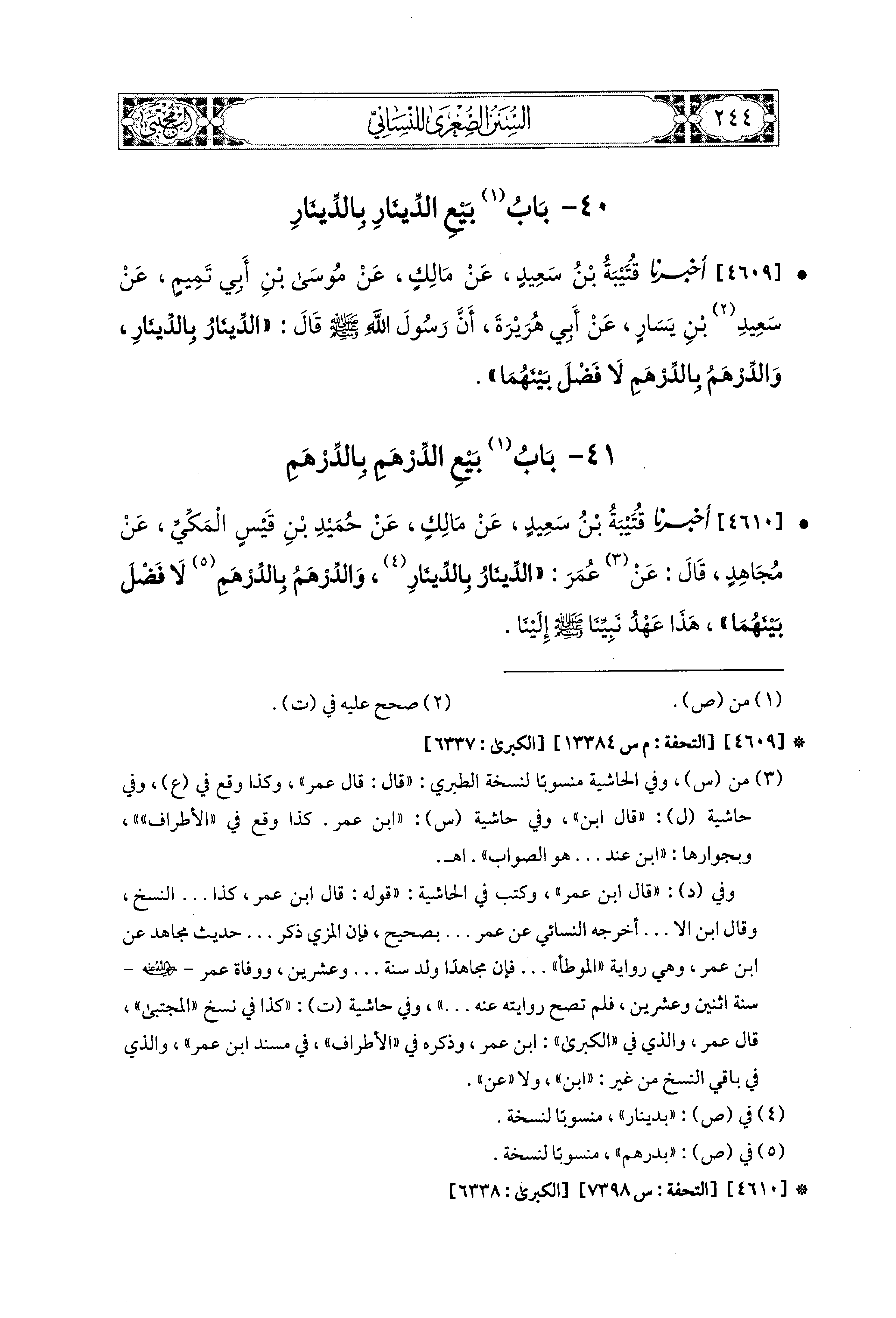 4610- أَخبَرَنا قُتَيبَةُ بْنُ سَعيدٍ، عَن مَالِكٍ، عَن حُمَيْدِ بْنِ قَيْسٍ المَكِّيِّ، عَن مُجَاهِدٍ، قَالَ: قَالَ ابْنُ عُمَرُ (1): الدِّينَارُ بِالدِّينَارِ، وَالدِّرْهَمُ بِالدِّرْهَمِ، لاَ فَضْلَ بَيْنَهُمَا، هَذَا عَهْدُ نَبِيِّنَا صَلى الله عَليه وسَلم إِلَيْنَا.