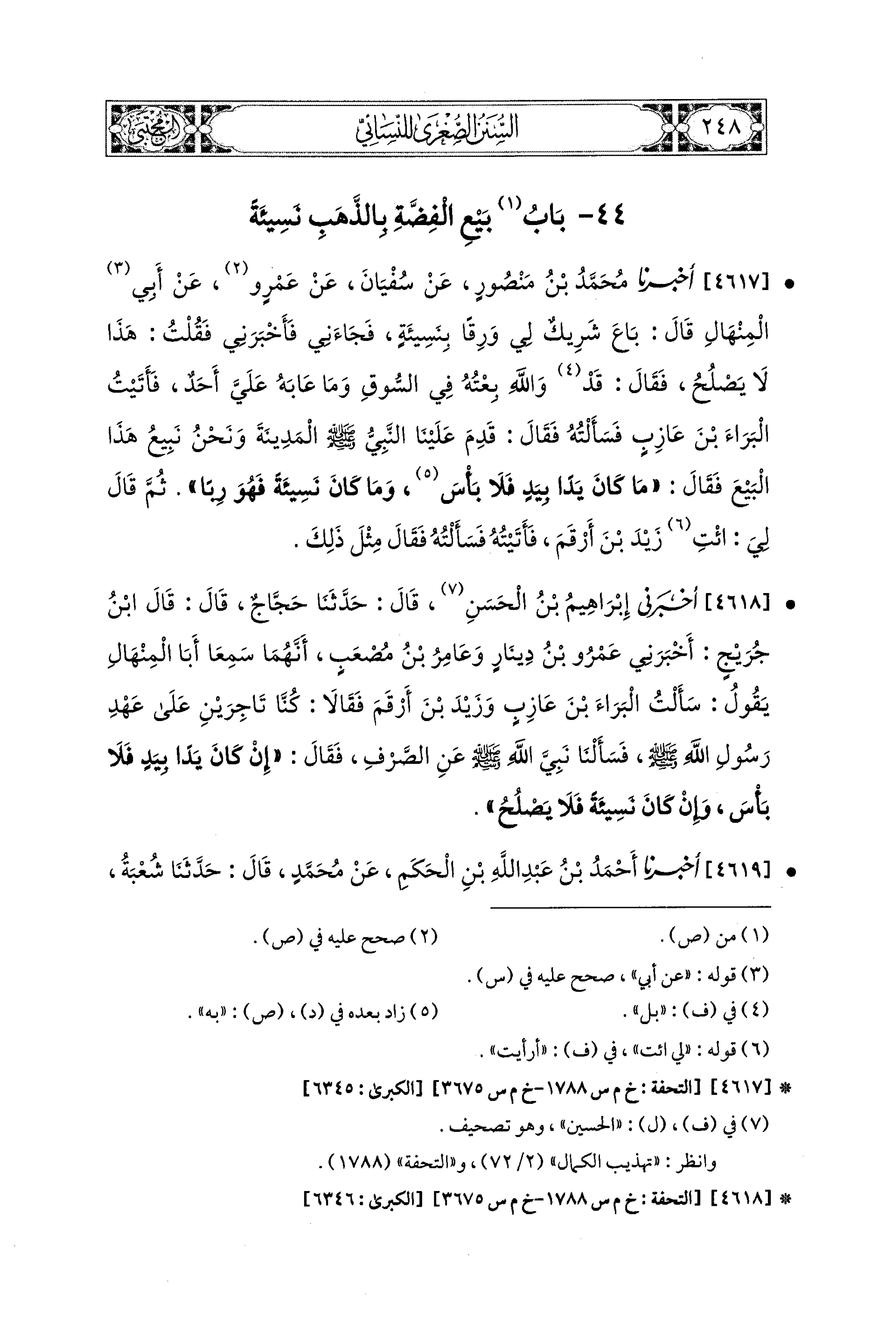 4618- أَخْبَرَني إِبراهِيمُ بْنُ الحَسَنِ، قال: حَدثنا حَجَّاجٌ قَالَ: قَالَ ابْنُ جُرَيْجٍ: أَخْبَرَني عَمْرُو بْنُ دِينَارٍ، وَعَامِرُ بْنُ مُصْعَبٍ، أَنَّهُمَا سَمِعَا أَبَا المِنْهَالِ يَقُولُ: سَأَلْتُ البَرَاءَ بْنَ عَازِبٍ، وَزَيْدَ بْنَ أَرْقَمَ فَقَالاَ: كُنَّا تَاجِرَيْنِ عَلَى عَهْدِ رَسُولِ اللهِ صَلى الله عَليه وسَلم، فَسَأَلْنَا نَبِيَّ اللهِ صَلى الله عَليه وسَلم عَنِ الصَّرْفِ فَقَالَ: إِنْ كَانَ يَدًا بِيَدٍ فَلاَ بَأْسَ، وَإِنْ كَانَ نَسِيئَةً فَلاَ يَصْلُحُ.