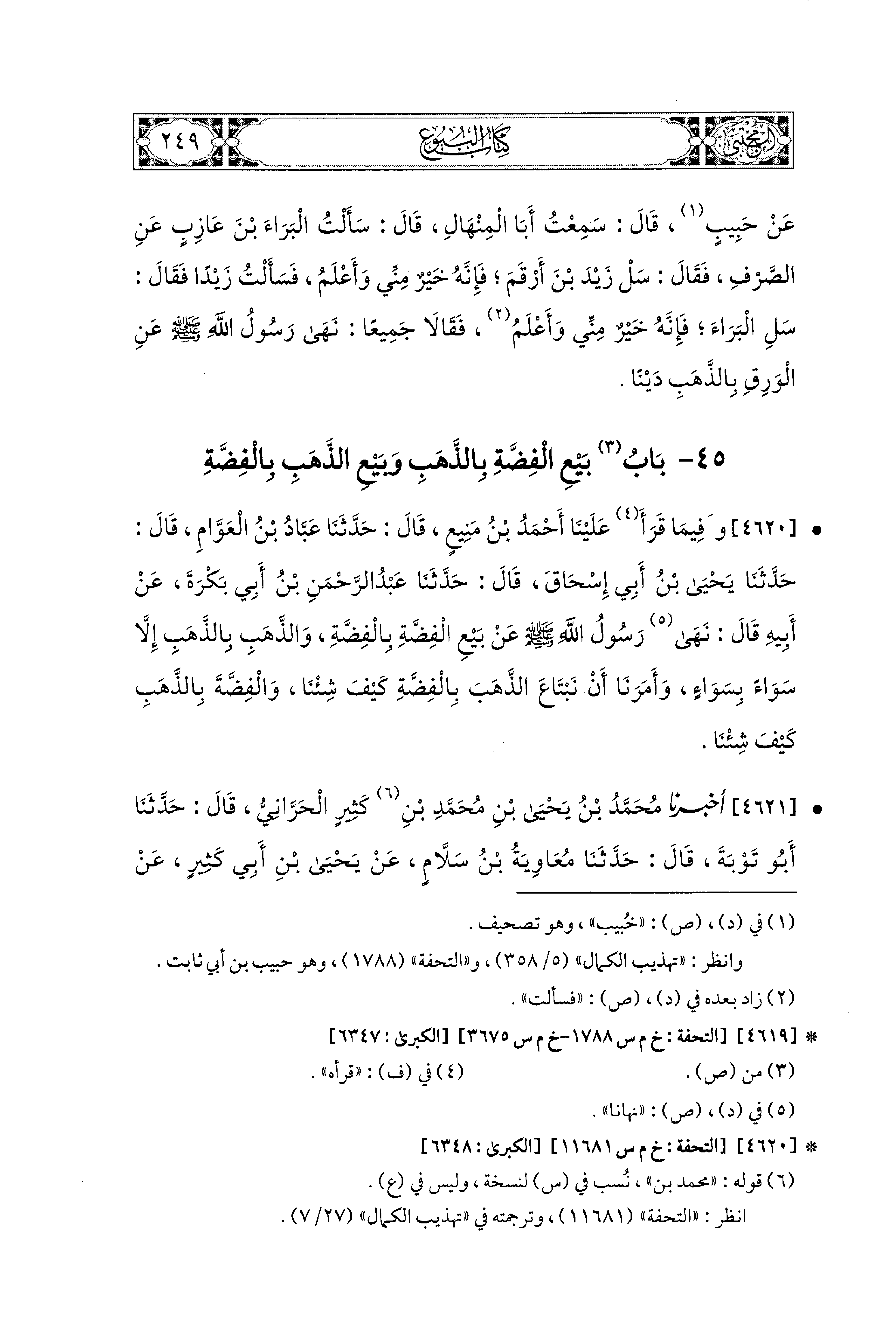 4621- أَخبَرَنا مُحَمد بْنُ يَحيَى بْنِ مُحَمدِ بْنِ كَثِيرٍ الحَرَّانيُّ، قال: حَدثنا أَبو تَوْبَةَ، قال: حَدثنا مُعَاوِيَةُ بْنُ سَلاَّمٍ، عَن يَحيَى بْنِ أَبِي كَثِيرٍ، عَن عَبدِ الرَّحمَنِ بْنِ أَبِي بَكْرَةَ، عَن أَبِيهِ، قَالَ: نَهَانَا رَسُولُ اللهِ صَلى الله عَليه وسَلم أَنْ نَبِيعَ الفِضَّةَ بِالفِضَّةِ إِلاَّ عَيْنًا بِعَيْنٍ سَوَاءً بِسَوَاءٍ، وَلاَ نَبِيعَ الذَّهَبَ بِالذَّهَبِ إِلاَّ عَيْنًا بِعَيْنٍ سَوَاءً بِسَوَاءٍ، قَالَ رَسُولُ اللهِ صَلى الله عَليه وسَلم: تَبَايَعُوا الذَّهَبَ بِالفِضَّةِ كَيْفَ شِئْتُمْ، وَالفِضَّةَ بِالذَّهَبِ كَيْفَ شِئْتُمْ.