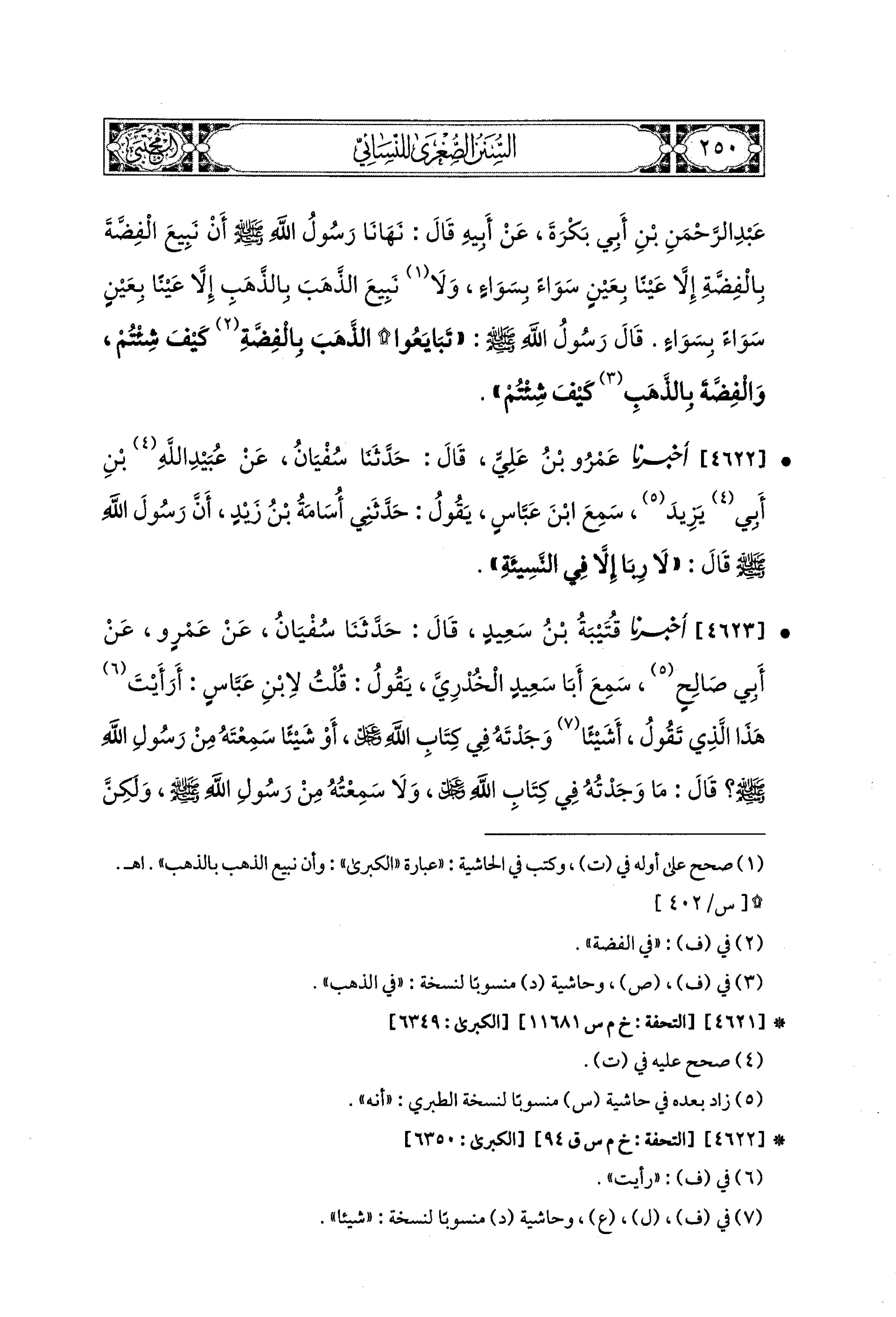 4623 - أَخبَرَنا قُتَيبَةُ بْنُ سَعيدٍ، قال: حَدثنا سُفْيَانُ، عَن عَمْرٍو، عَن أَبِي صَالِحٍ، سَمِعَ أَبَا سَعيدٍ الخُدْرِيَّ يَقُولُ: قُلْتُ لاِبْنِ عَبَّاسٍ: أَرَأَيْتَ هَذَا الَّذِي تَقُولُ أَشَيْئًا وَجَدْتَهُ فِي كِتَابِ اللهِ عَزَّ وَجَلَّ، أَوْ شَيْئًا سَمِعْتَهُ مِنْ رَسُولِ اللهِ صَلى الله عَليه وسَلم؟ قَالَ: مَا وَجَدْتُهُ فِي كِتَابِ اللهِ عَزَّ وَجَلَّ، وَلاَ سَمِعْتُهُ مِنْ رَسُولِ اللهِ صَلى الله عَليه وسَلم، وَلَكِنْ أُسَامَةُ بْنُ زَيْدٍ أَخْبَرَني، أَنَّ رَسُولَ اللهِ صَلى الله عَليه وسَلم قَالَ: إِنَّمَا الرِّبَا فِي النَّسِيئَةِ.