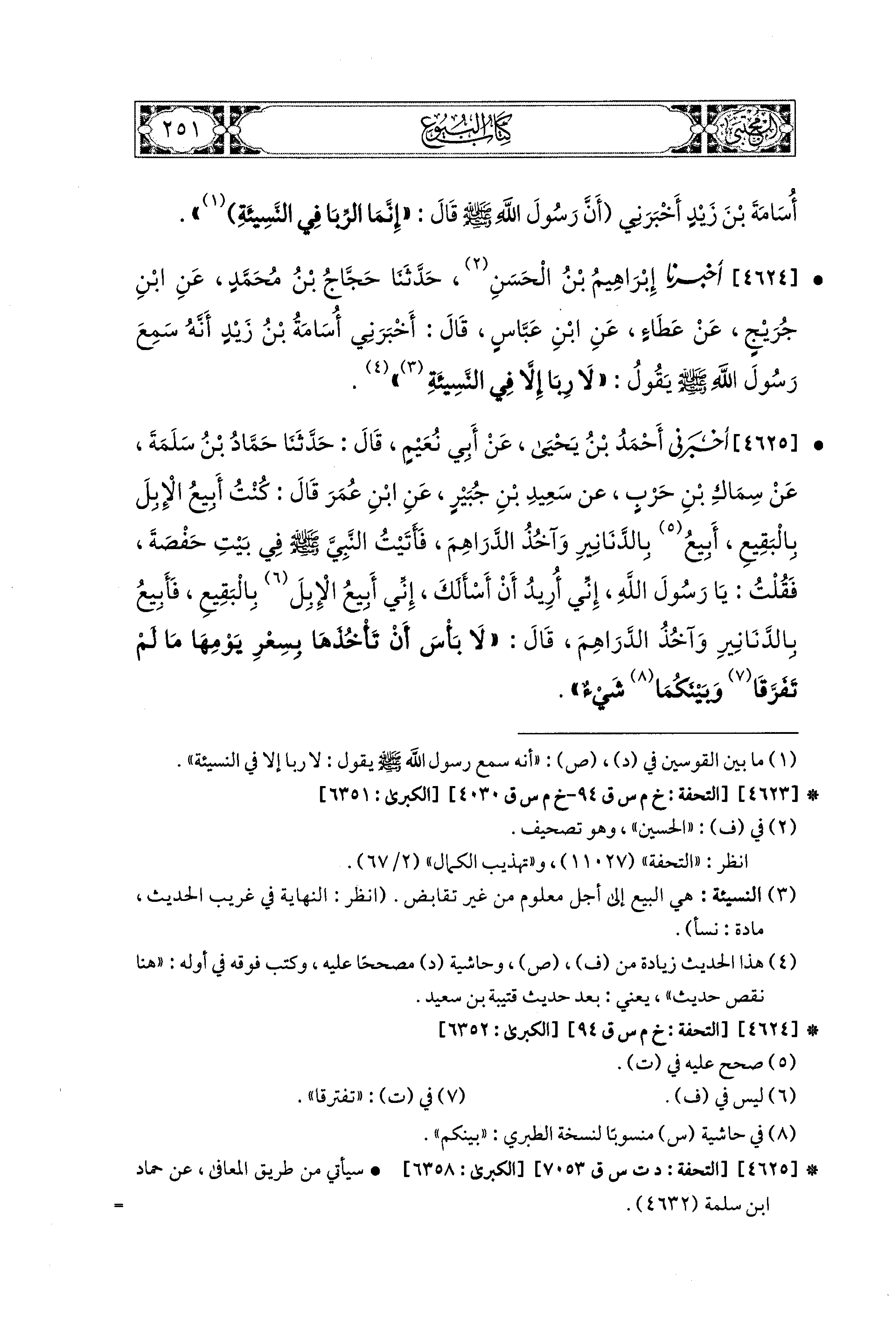 4624- أخبرنا إبراهيم بن الحسن, حدثنا حجاج بن محمد, عن ابن جريج, عن عطاء, عن ابن عباس, قال: أخبرني أسامة بن زيد أنه سمع رَسُولِ اللهِ صَلى الله عَليه وسَلم يقول: لا ربا إلا فِي النَّسِيئَةِ.