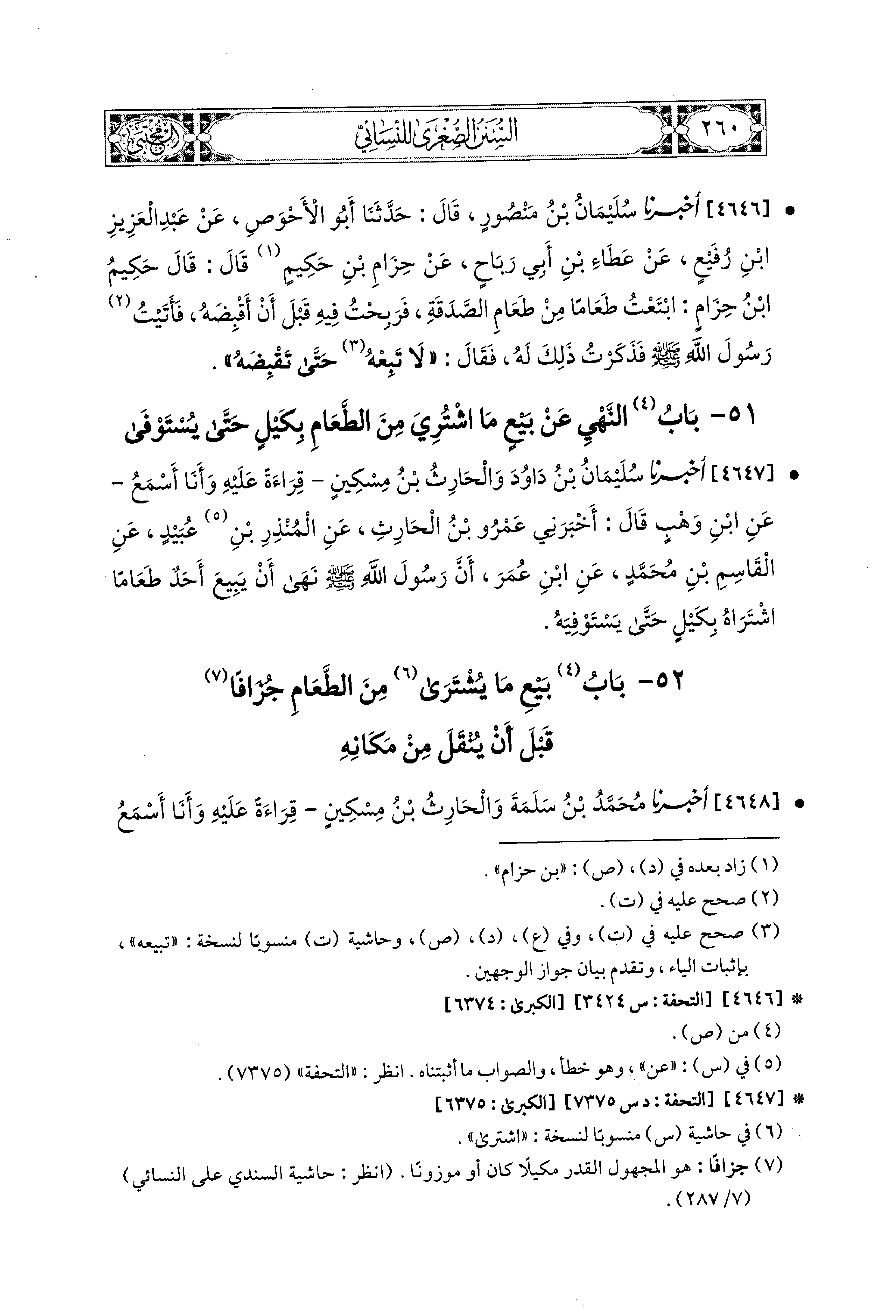 4646- أَخبَرَنا سُلَيمَانُ بْنُ مَنْصُورٍ، قال: حَدثنا أَبو الأَحْوَصِ، عَن عَبدِ العَزِيزِ بْنِ رُفَيْعٍ، عَن عَطَاءِ بْنِ أَبِي رَبَاحٍ، عَن حِزَامِ بْنِ حَكِيمٍ قَالَ: قَالَ حَكِيمُ بْنُ حِزَامٍ: ابْتَعْتُ طَعَامًا مِنْ طَعَامِ الصَّدَقَةِ، فَرَبِحْتُ فِيهِ قَبْلَ أَنْ أَقْبِضَهُ، فَأَتَيْتُ رَسُولَ اللهِ صَلى الله عَليه وسَلم، فَذَكَرْتُ ذَلِكَ لَهُ، فَقَالَ: لاَ تَبِعْهُ حَتَّى تَقْبِضَهُ.