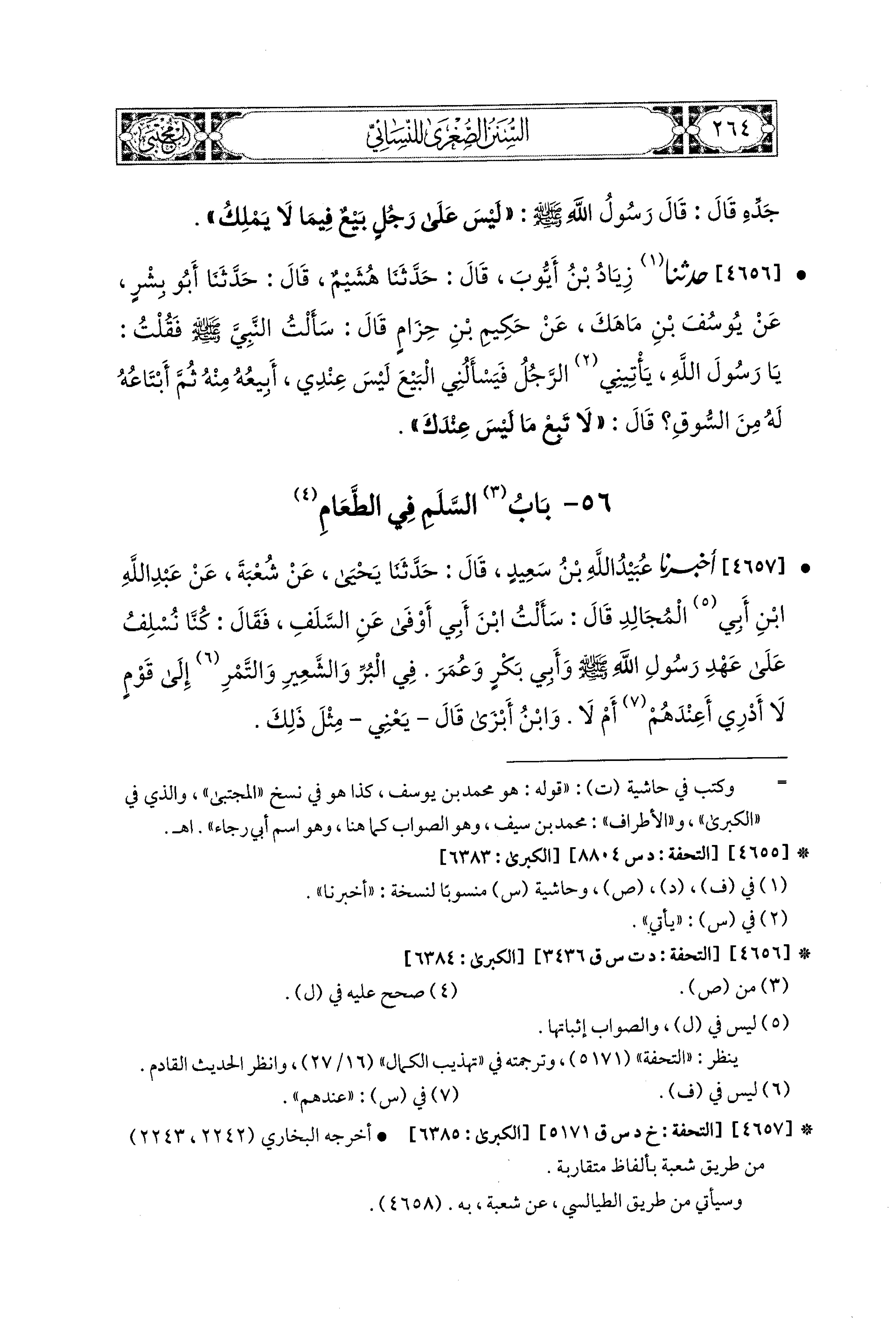 4657- أَخبَرَنا عُبَيدُ اللهِ بْنُ سَعيدٍ، قال: حَدثنا يَحيَى، عَن شُعْبَةَ، عَن عَبد اللهِ بن أَبِي المُجَالِدِ قَالَ: سَأَلْتُ ابْنَ أَبِي أَوْفَى عَنِ السَّلَفِ فقَالَ: كُنَّا نُسْلِفُ عَلَى عَهْدِ رَسُولِ اللهِ صَلى الله عَليه وسَلم، وَأَبِي بَكْرٍ، وَعُمَرَ فِي البُرِّ وَالشَّعِيرِ وَالتَّمْرِ إِلَى قَوْمٍ لاَ أَدْرِي أَعِنْدَهُمْ أَمْ لاَ، وَابْنُ أَبْزَى قَالَ: يعني, مِثْلَ ذَلِكَ.