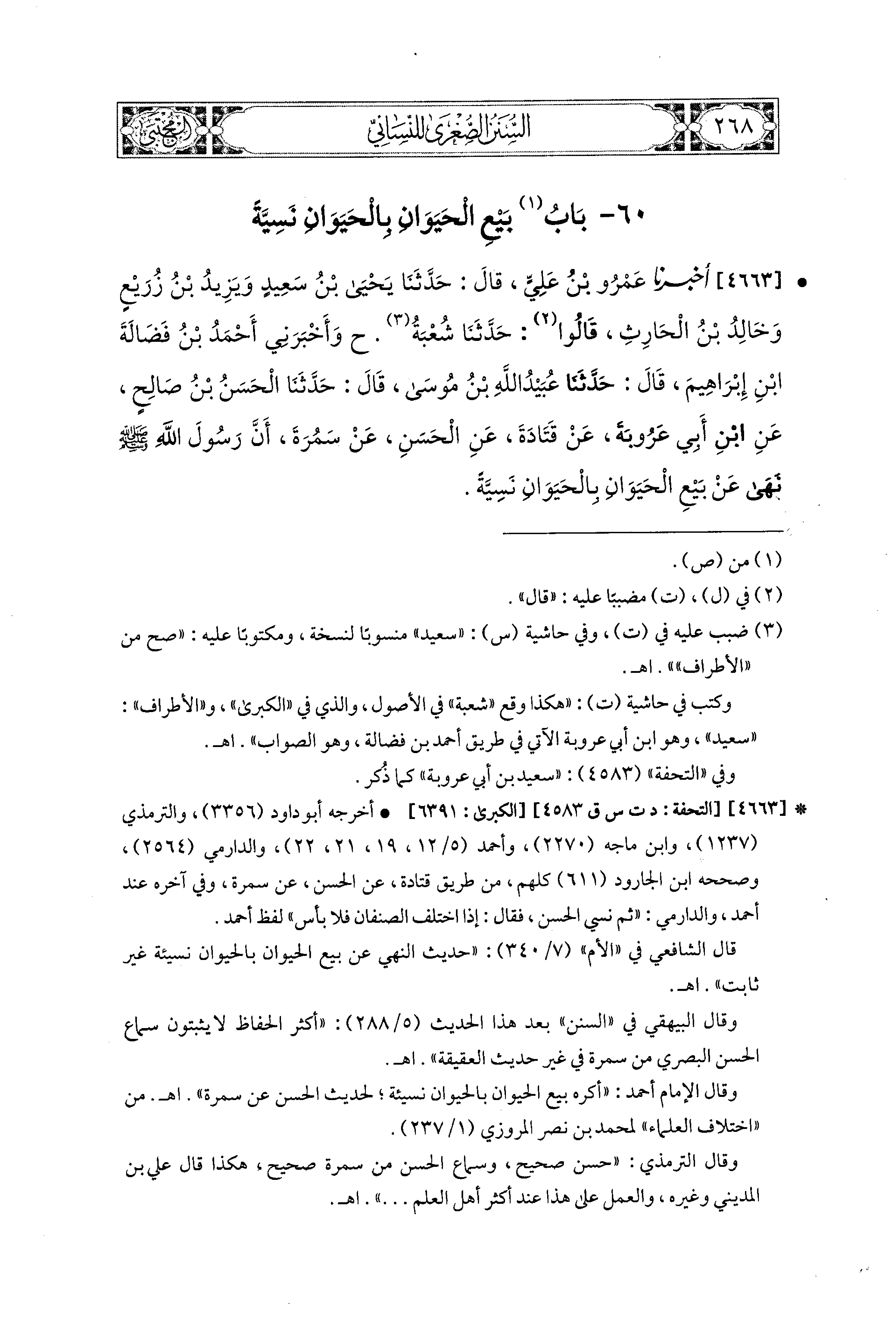 4663- أَخبَرَنا عَمْرُو بْنُ عَلِيٍّ، قال: حَدثنا يَحيَى بْنُ سَعيدٍ، وَيَزِيدُ بْنُ زُرَيْعٍ، وَخَالِدُ بْنُ الحَارِثِ قَالُوا: حَدَّثَنَا شُعْبَةُ (ح) وَأَخْبَرَني أَحْمَدُ بْنُ فَضَالَةَ بْنِ إِبراهِيمَ، قال: حَدثنا عُبَيدُ اللهِ بْنُ مُوسَى، قال: حَدثنا الحَسَنُ بْنُ صَالِحٍ، عَنِ ابنِ أَبِي عَرُوبَةَ، عَن قَتَادَةَ، عَنِ الحَسَنِ، عَن سَمُرَةَ، أَنَّ رَسُولَ اللهِ صَلى الله عَليه وسَلم نَهَى عَن بَيْعِ الحَيَوَانِ بِالحَيَوَانِ نَسِيئَةً (1).