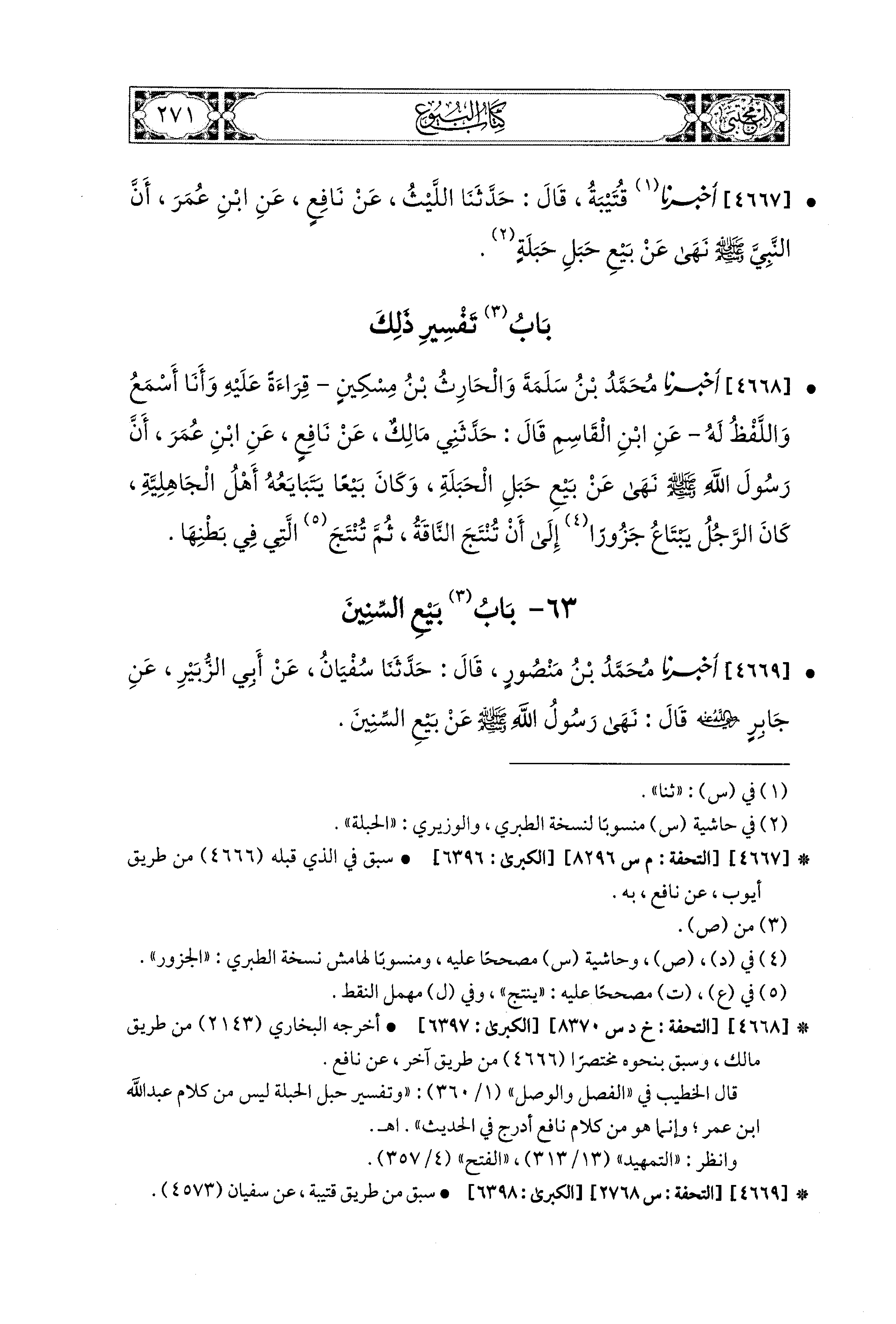 4667- أَخبَرَنا قُتَيبَةُ، قال: حَدثنا اللَّيْثُ، عَن نَافِعٍ، عَنِ ابنِ عُمَرَ، أَنَّ النَّبيَّ صَلى الله عَليه وسَلم نَهَى عَن بَيْعِ حَبَلِ الحَبَلَةِ.