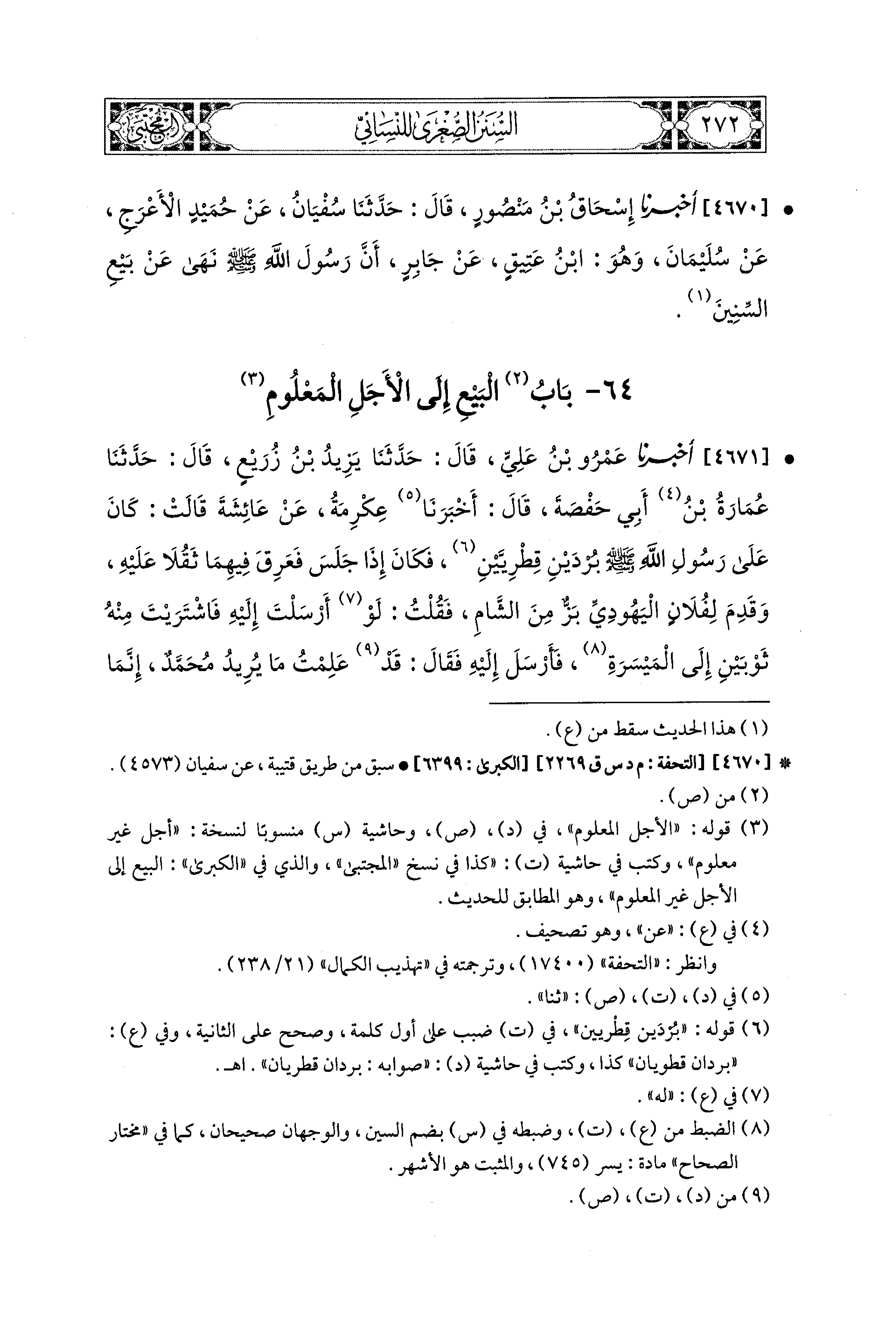 4670- أَخبَرَنا إِسحَاقُ بْنُ مَنْصُورٍ، قال: حَدثنا سُفْيَانُ، عَن حُمَيْدٍ الأَعْرَجِ، عَن سُلَيمَانَ، وَهُوَ ابْنُ عَتِيقٍ، عَن جَابِرٍ، أَنَّ رَسُولَ اللهِ صَلى الله عَليه وسَلم نَهَى عَن بَيْعِ السِّنينَ.