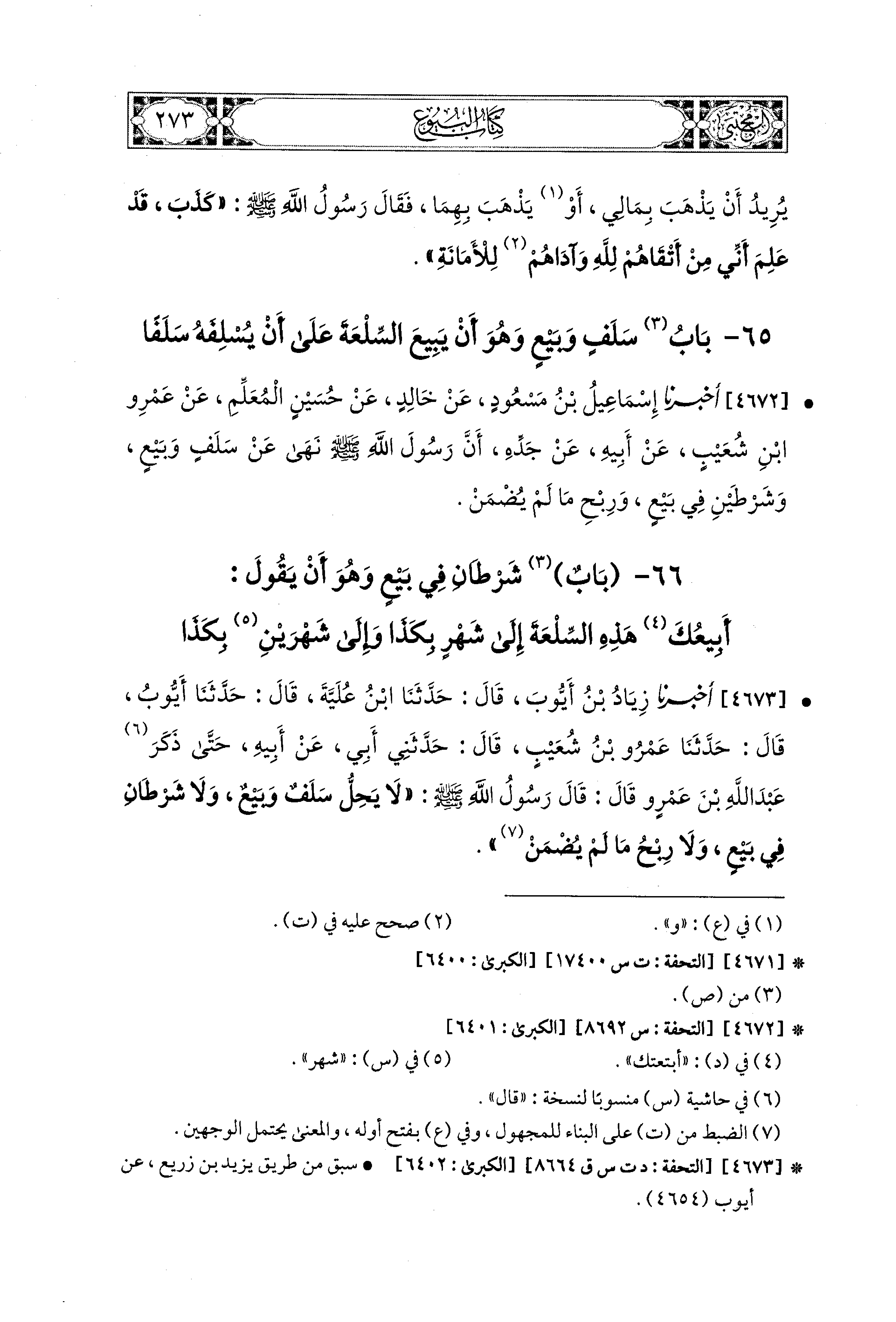 4672- أَخبَرَنا إِسماعِيلُ بْنُ مَسْعُودٍ، عَن خَالِدٍ، عَن حُسَيْنٍ المُعَلِّمِ، عَن عَمْرِو بْنِ شُعَيبٍ، عَن أَبِيهِ، عَن جَدِّهِ، أَنَّ رَسُولَ اللهِ صَلى الله عَليه وسَلم نَهَى عَن سَلَفٍ وَبَيْعٍ، وَشَرْطَيْنِ فِي بَيْعٍ، وَرِبْحِ مَا لَمْ يُضْمَنْ.