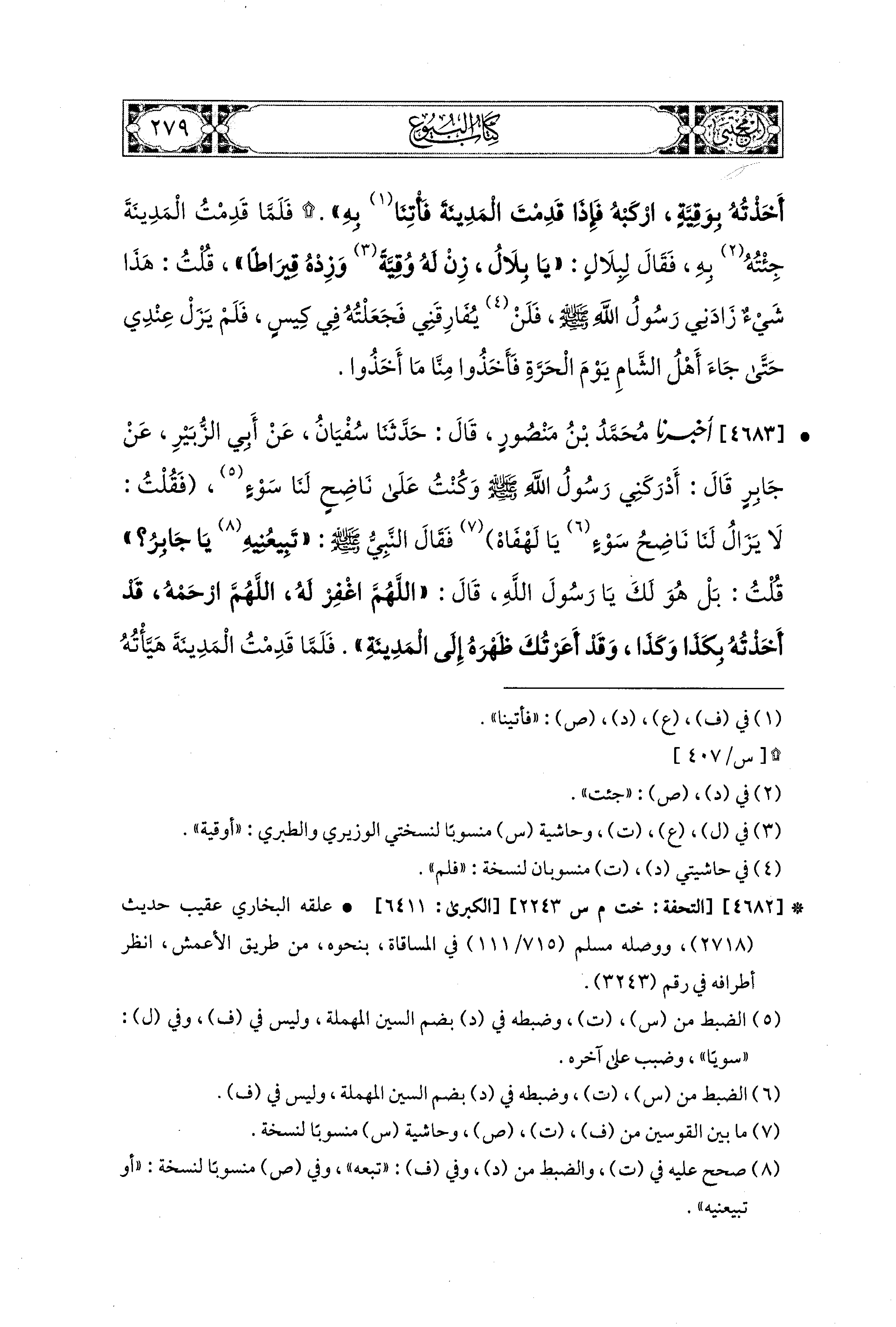 4683- أَخبَرَنا مُحَمد بْنُ مَنْصُورٍ، قال: حَدثنا سُفْيَانُ، عَن أَبِي الزُّبَيْرِ، عَن جَابِرٍ قَالَ: أَدْرَكَني رَسُولُ اللهِ صَلى الله عَليه وسَلم وَكُنْتُ عَلَى نَاضِحٍ لَنَا سَوْءٍ، فَقُلْتُ: لاَ يَزَالُ لَنَا نَاضِحُ سَوْءٍ يَا لَهْفَاهُ، فَقَالَ النَّبيُّ صَلى الله عَليه وسَلم: تَبِيعُنيهِ يَا جَابِرُ؟ قُلْتُ: بَلْ هُوَ لَكَ يَا رَسُولَ اللهِ، قَالَ: اللهُمَّ اغْفِرْ لَهُ، اللهُمَّ ارْحَمْهُ، قَدْ أَخَذْتُهُ بِكَذَا وَكَذَا، وَقَدْ أَعَرْتُكَ ظَهْرَهُ إِلَى المَدِينَةِ، فَلَمَّا قَدِمْتُ المَدِينَةَ، هَيَّأْتُهُ، فَذَهَبْتُ بِهِ إِلَيْهِ، فَقَالَ: يَا بِلاَلُ، أَعْطِهِ ثَمَنَهُ فَلَمَّا أَدْبَرْتُ، دَعَاني، فَخِفْتُ أَنْ يَرُدَّهُ، فَقَالَ: هُوَ لَكَ.