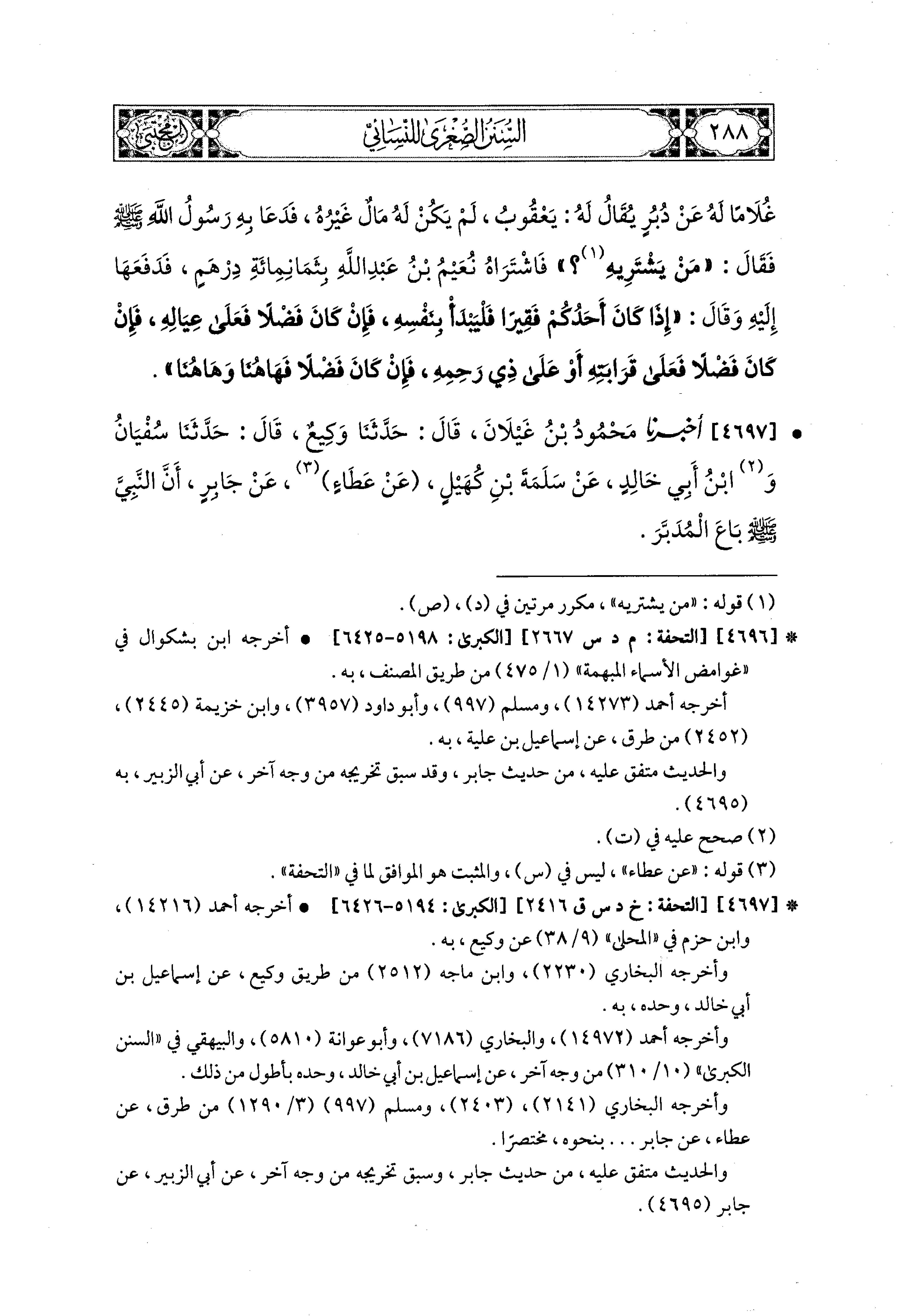 4697- أَخبَرَنا مَحْمُودُ بْنُ غَيْلاَنَ، قال: حَدثنا وَكِيعٌ، قال: حَدثنا سُفْيَانُ، وَابْنُ أَبِي خَالِدٍ، عَن سَلَمَةَ بْنِ كُهَيْلٍ، عَن عَطَاءٍ، عَن جَابِرٍ، أَنَّ النَّبيَّ صَلى الله عَليه وسَلم بَاعَ المُدَبَّرَ.