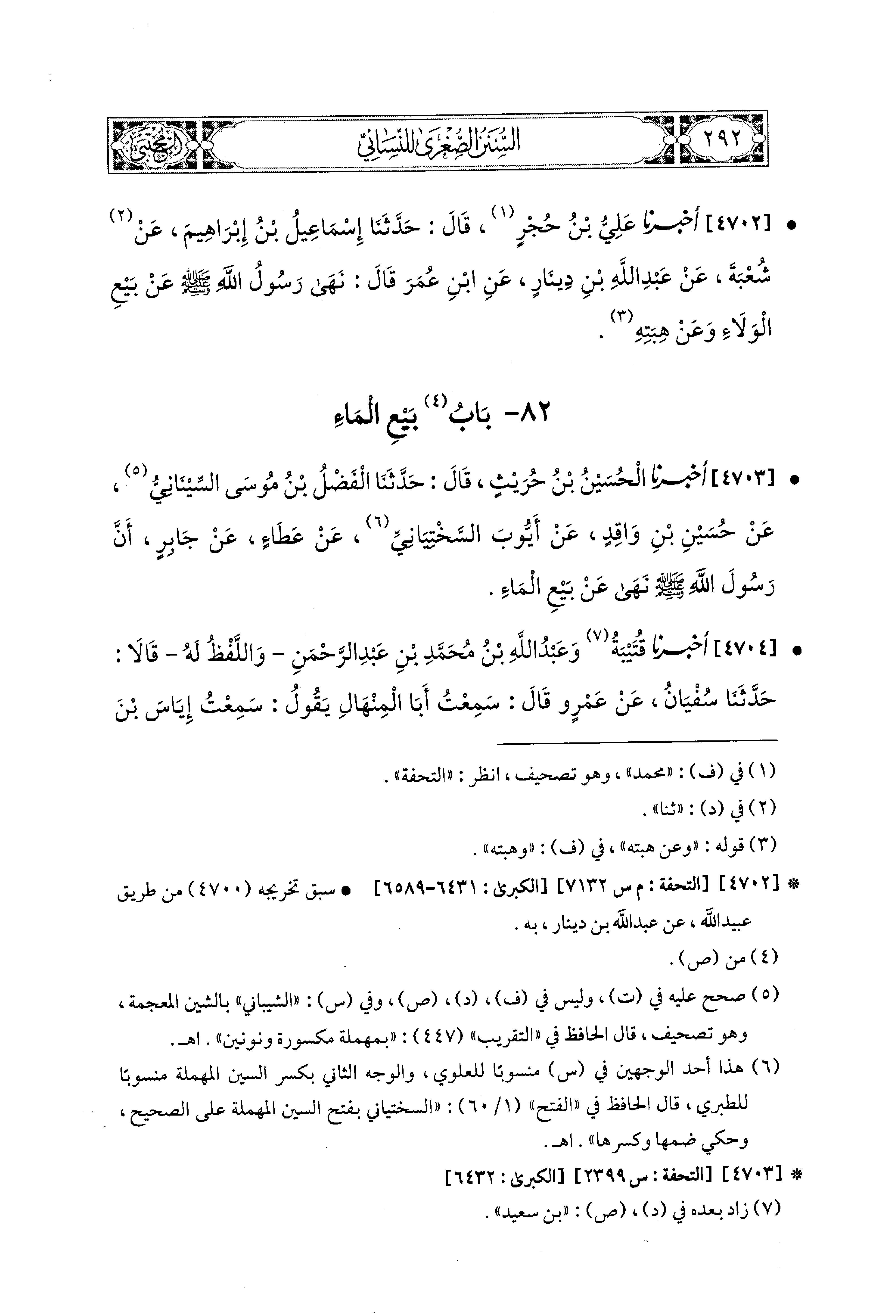 4704- أَخبَرَنا قُتَيبَةُ، وَعَبدُ اللهِ بْنُ مُحَمدِ بْنِ عَبدِ الرَّحمَنِ، وَاللَّفْظُ لَهُ، قَالاَ: حَدثنا سُفيان، عَن عَمرِو بن دِينارٍ(1)، قَالَ: سَمِعْتُ أَبَا المِنْهَالِ يَقُولُ: سَمِعْتُ إِيَاسَ بْنَ عُمَرَ، وَقَالَ مَرَّةً: ابْنَ عَبدٍ، يَقُولُ: سَمِعْتُ رَسُولَ اللهِ صَلى الله عَليه وسَلم: يَنْهَى عَن بَيْعِ المَاءِ.
