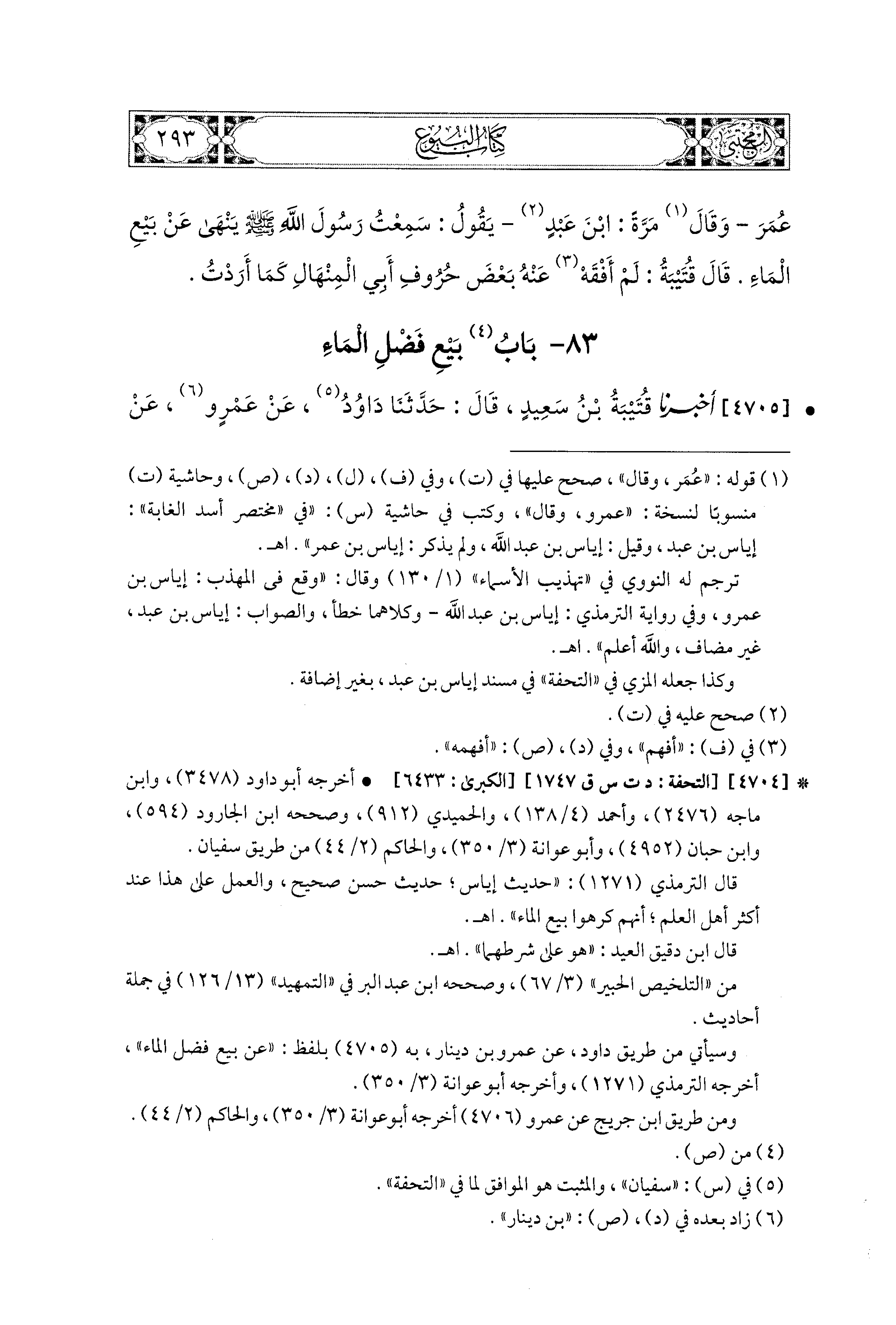 4705- أَخبَرَنا قُتَيبَةُ بْنُ سَعيدٍ، قال: حَدثنا دَاوُدُ، عَن عَمْرٍو، عَن أَبِي المِنْهَالِ، عَن إِيَاسٍ، أَنَّ رَسُولَ اللهِ صَلى الله عَليه وسَلم نَهَى عَن بَيْعِ فَضْلِ المَاءِ، قال: وَبَاعَ قَيِّمُ الوَهَطِ فَضْلَ مَاءِ الوَهَطِ فَكَرِهَهُ عَبدُ اللهِ بْنُ عَمْرٍو.