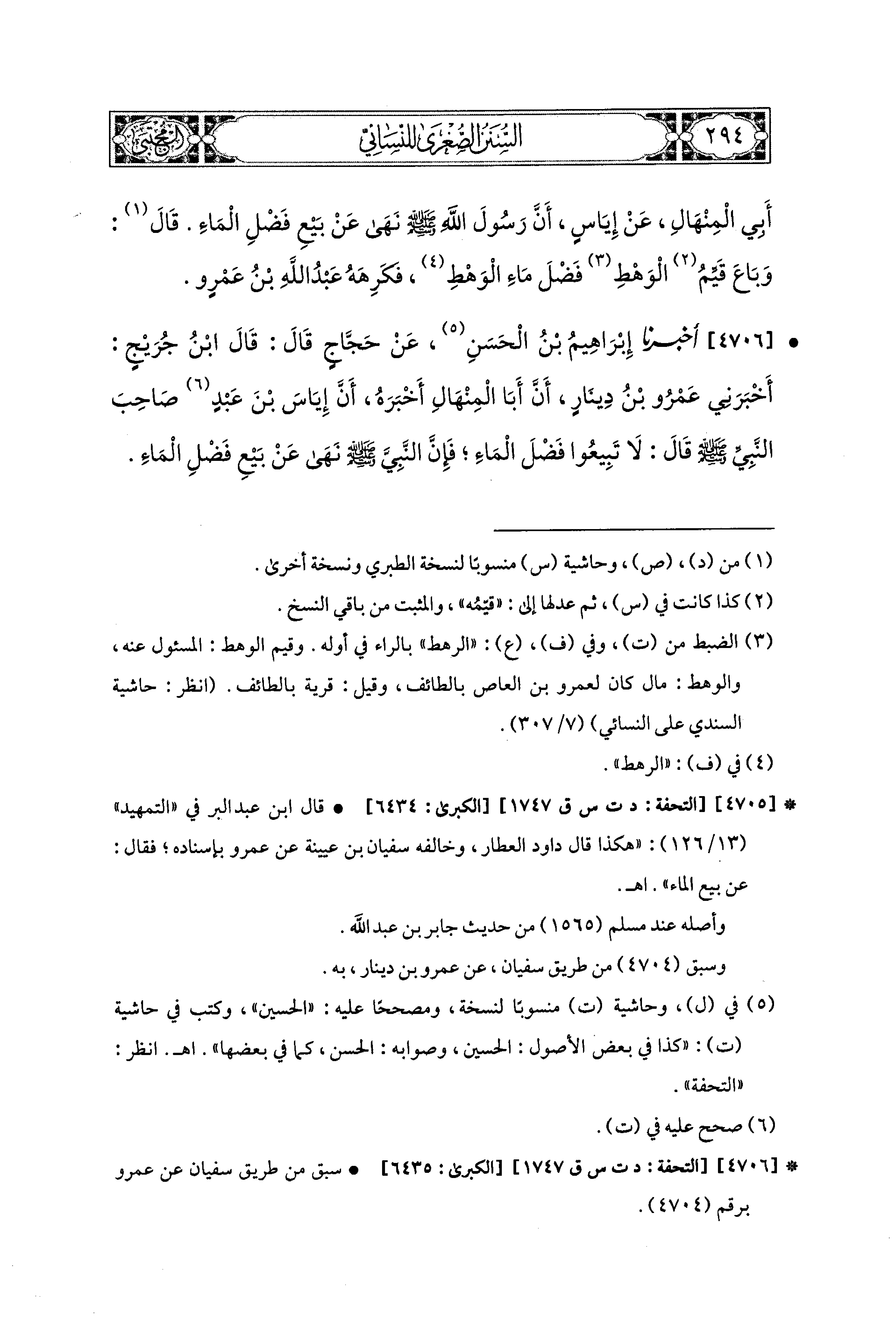 4706- أَخبَرَنا إِبراهِيمُ بْنُ الحَسَنِ، عَن حَجَّاجٍ قَالَ: قَالَ ابْنُ جُرَيْجٍ: أَخْبَرَني عَمْرُو بْنُ دِينَارٍ، أَنَّ أَبَا المِنْهَالِ، أَخْبَرَهُ، أَنَّ إِيَاسَ بْنَ عَبدٍ صَاحِبَ النَّبيِّ صَلى الله عَليه وسَلم قَالَ: لاَ تَبِيعُوا فَضْلَ المَاءِ فَإِنَّ النَّبيَّ صَلى الله عَليه وسَلم نَهَى عَن بَيْعِ فَضْلِ المَاءِ.