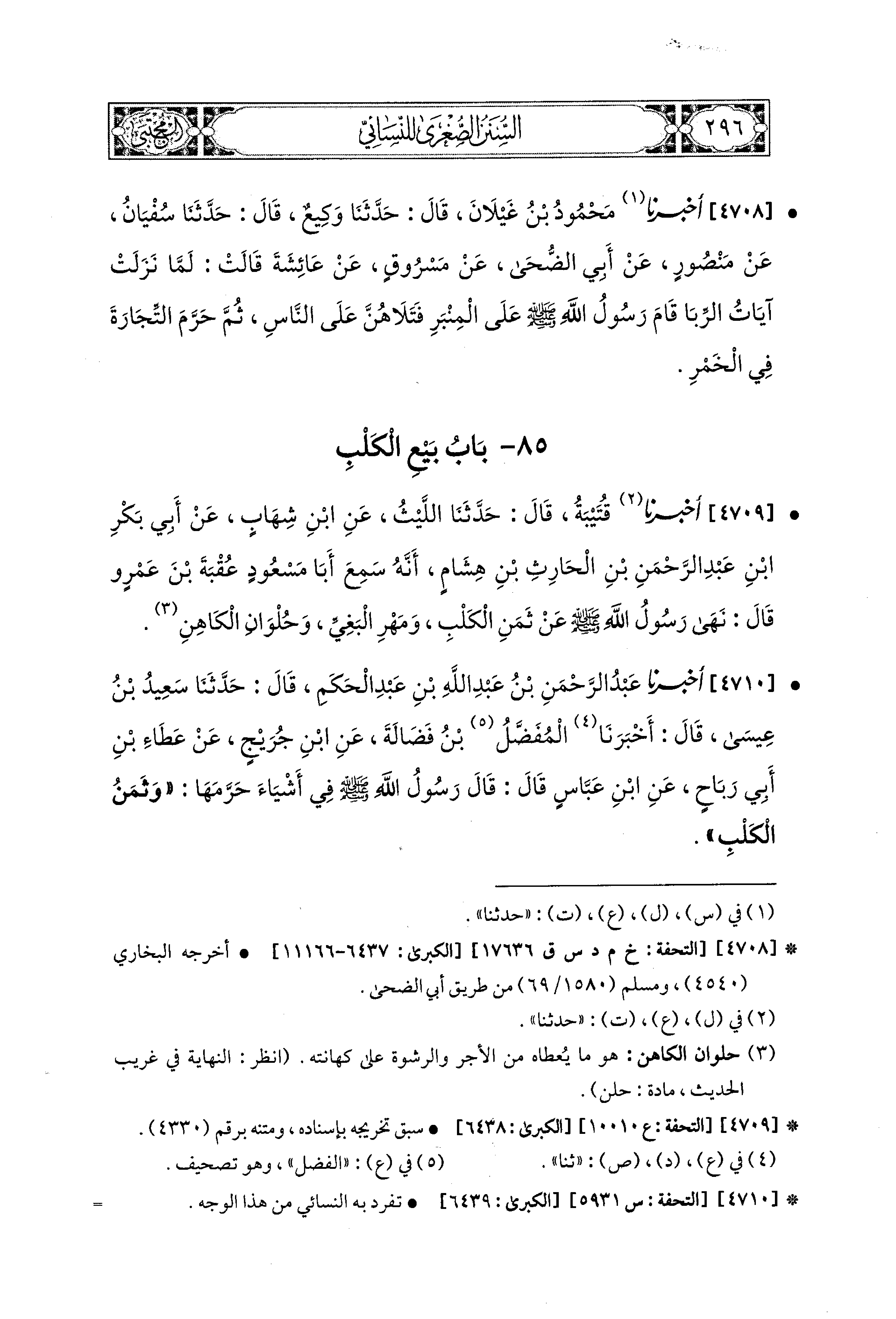 4709- أخبرنا قُتَيبَةُ، قال: حَدثنا اللَّيْثُ، عَنِ ابنِ شِهَابٍ، عَن أَبِي بَكْرِ بْنِ عَبدِ الرَّحمَنِ بْنِ الحَارِثِ بْنِ هِشَامٍ أَنَّهُ سَمِعَ أَبَا مَسْعُودٍ عُقْبَةَ بْنَ عَمْرٍو قَالَ: نَهَى رَسُولُ اللهِ صَلى الله عَليه وسَلم عَن ثَمَنِ الكَلْبِ، وَمَهْرِ البَغِيِّ، وَحُلْوَانِ الكَاهِنِ.