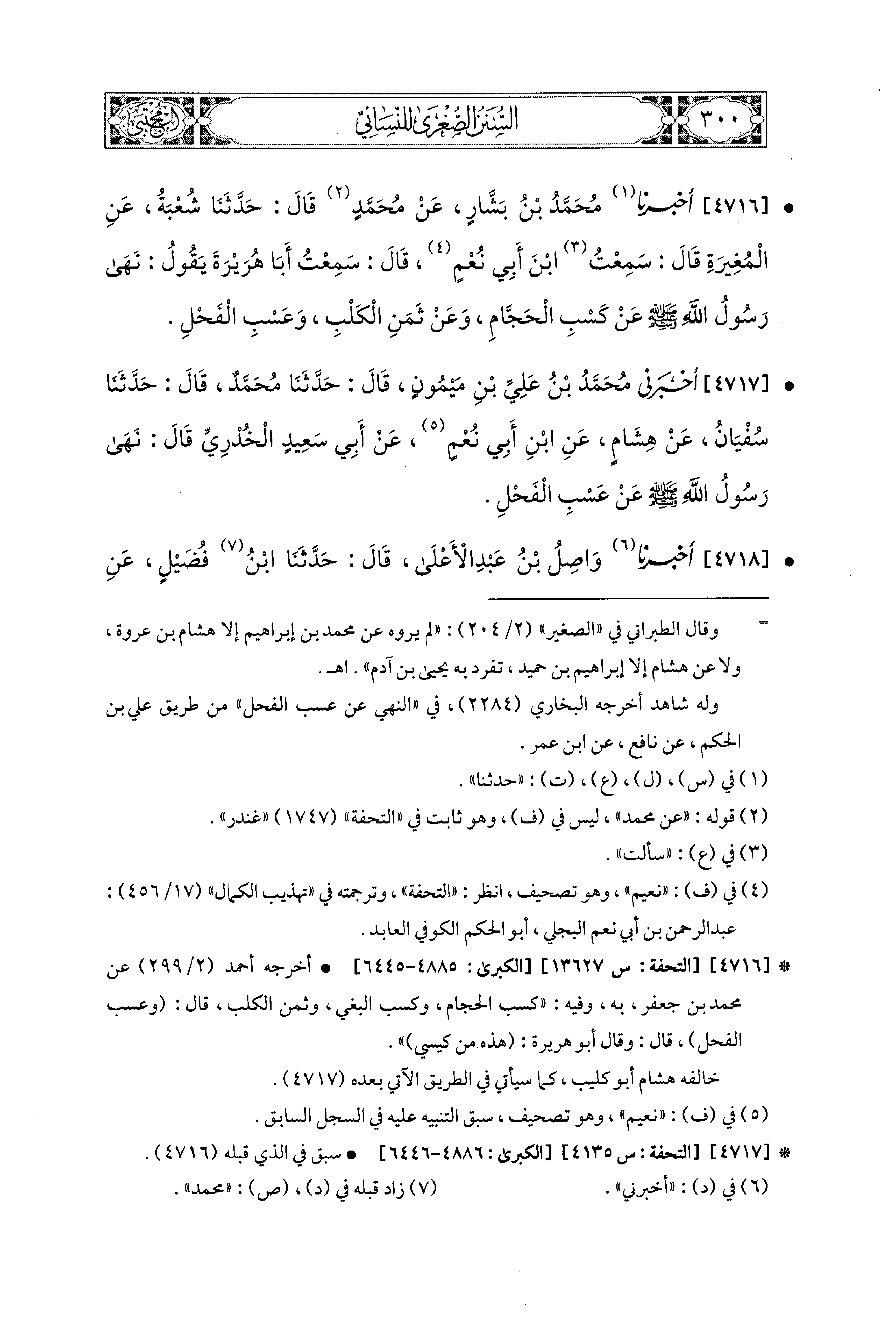 4716- أخبرنا مُحَمدُ بْنُ بَشَّارٍ، عَن مُحَمدٍ، قال: حَدثنا شُعْبَةُ، عَنِ المُغِيرَةِ، قَالَ: سَمِعْتُ ابْنَ أَبِي نُعْمٍ، قَالَ: سَمِعْتُ أَبَا هُرَيرَةَ يَقُولُ: نَهَى رَسُولُ اللهِ صَلى الله عَليه وسَلم عَن كَسْبِ الحَجَّامِ، وَعَنْ ثَمَنِ الكَلْبِ، وَعَسْبِ الفَحْلِ.