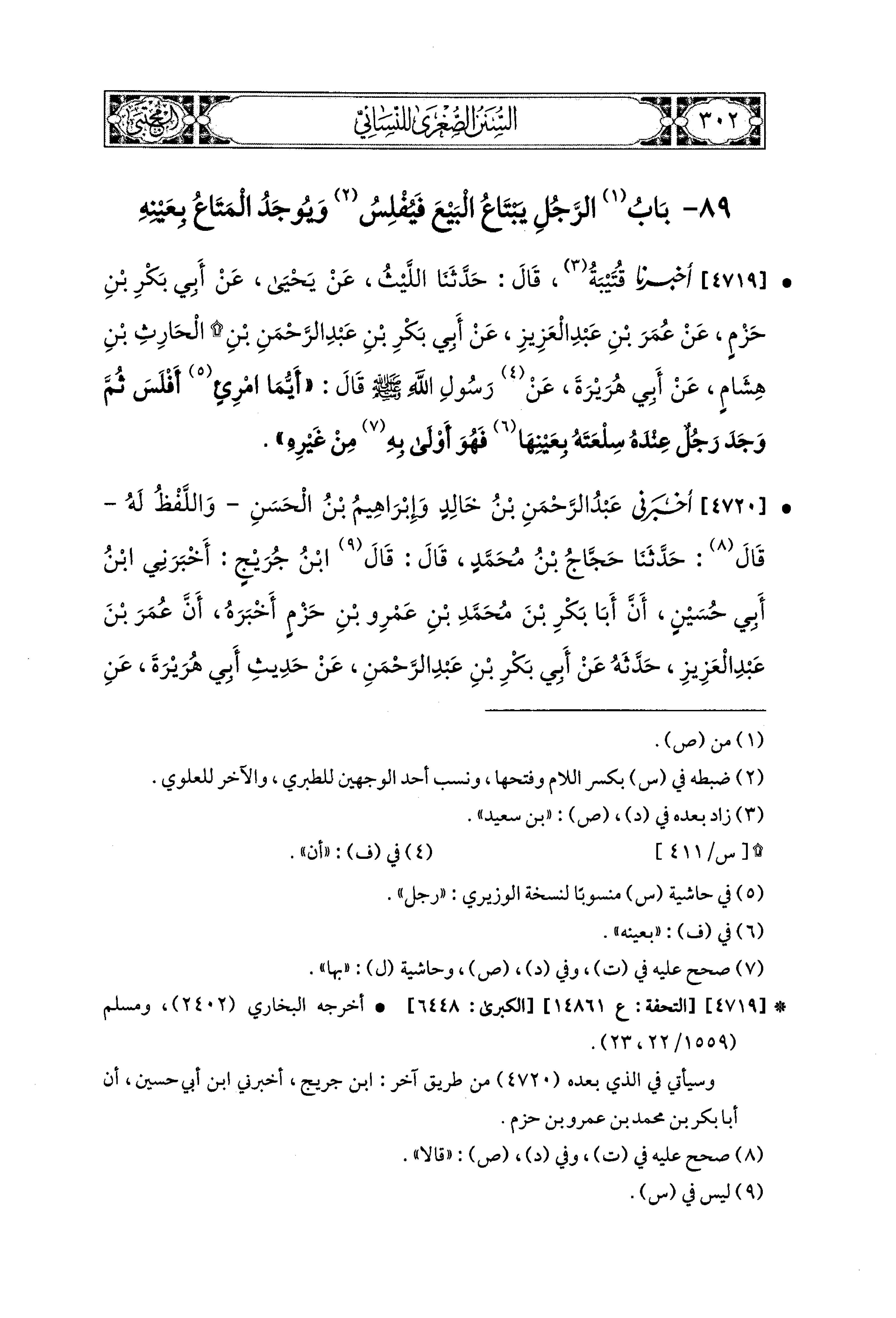 4719- أَخبَرَنا قُتَيبَةُ، قال: حَدثنا اللَّيْثُ، عَن يَحيَى، عَن أَبِي بَكْرِ بْنِ حَزْمٍ، عَن عُمَرَ بْنِ عَبدِ العَزِيزِ، عَن أَبِي بَكْرِ بْنِ عَبدِ الرَّحمَنِ بْنِ الحَارِثِ بْنِ هِشَامٍ، عَن أَبِي هُرَيرَةَ، عَن رَسُولِ اللهِ صَلى الله عَليه وسَلم قَالَ: أَيُّمَا امْرِئٍ أَفْلَسَ ثُمَّ وَجَدَ رَجُلٌ عِنْدَهُ سِلْعَتَهُ بِعَيْنِهَا، فَهُوَ أَوْلَى بِهِ مِنْ غَيْرِهِ.