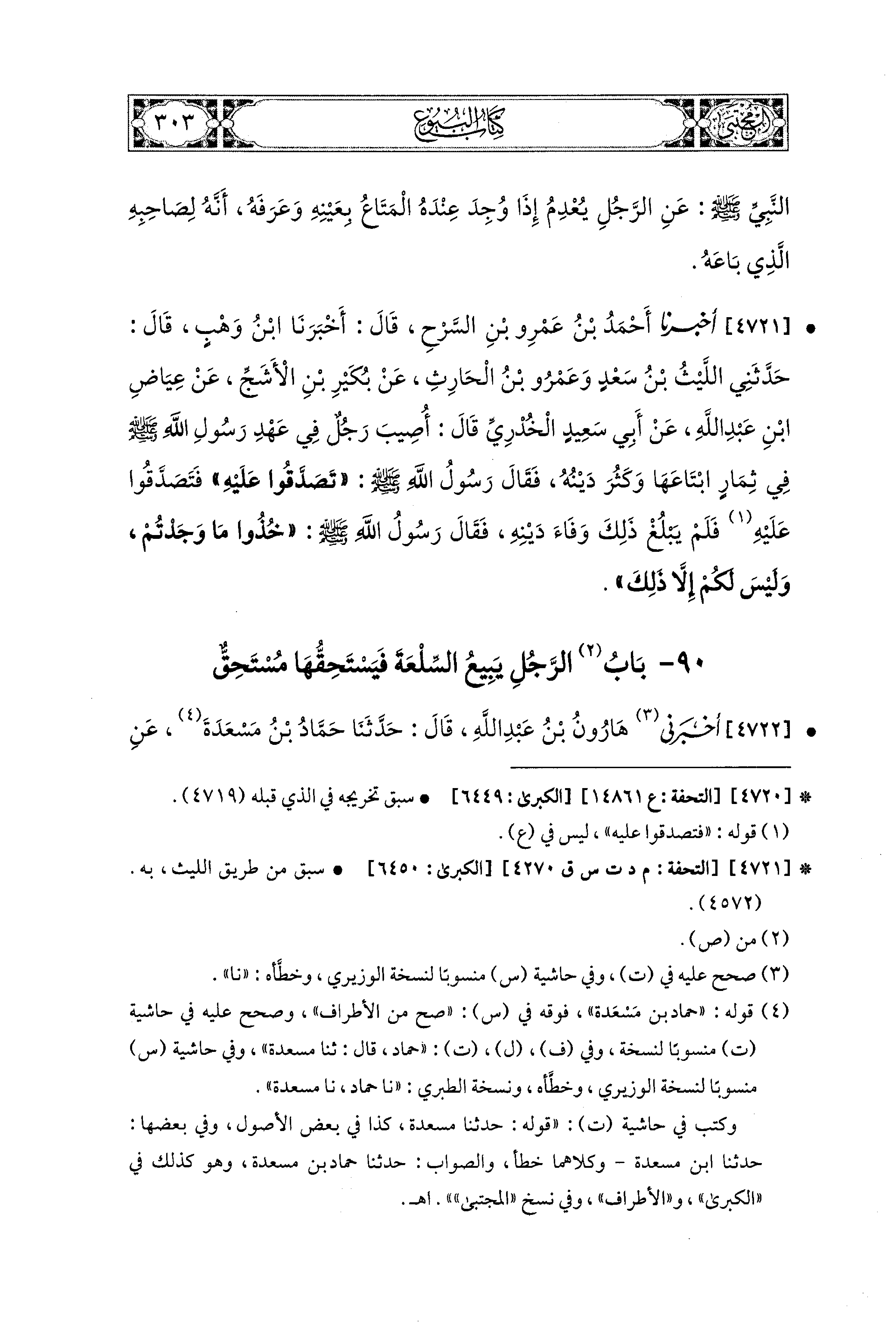 4722- أَخْبَرَني هَارُونُ بْنُ عَبدِ اللهِ، قال: حَدثنا حَمَّادُ بْنُ مَسْعَدَةَ، عَنِ ابنِ جُرَيْجٍ، عَن عِكْرِمَةَ بْنِ خَالِدٍ، قَالَ: حَدَّثَني أُسَيْدُ بْنُ حُضَيْرِ بْنِ سِمَاكٍ؛ أَنَّ رَسُولَ اللهِ صَلى الله عَليه وسَلم قَضَى أَنَّهُ إِذَا وَجَدَهَا فِي يَدِ الرَّجُلِ غَيْرِ المُتَّهَمِ، فَإِنْ شَاءَ أَخَذَهَا بِمَا اشْتَرَاهَا، وَإِنْ شَاءَ اتَّبَعَ سَارِقَهُ، وَقَضَى بِذَلِكَ أَبو بَكْرٍ وَعُمَرُ.