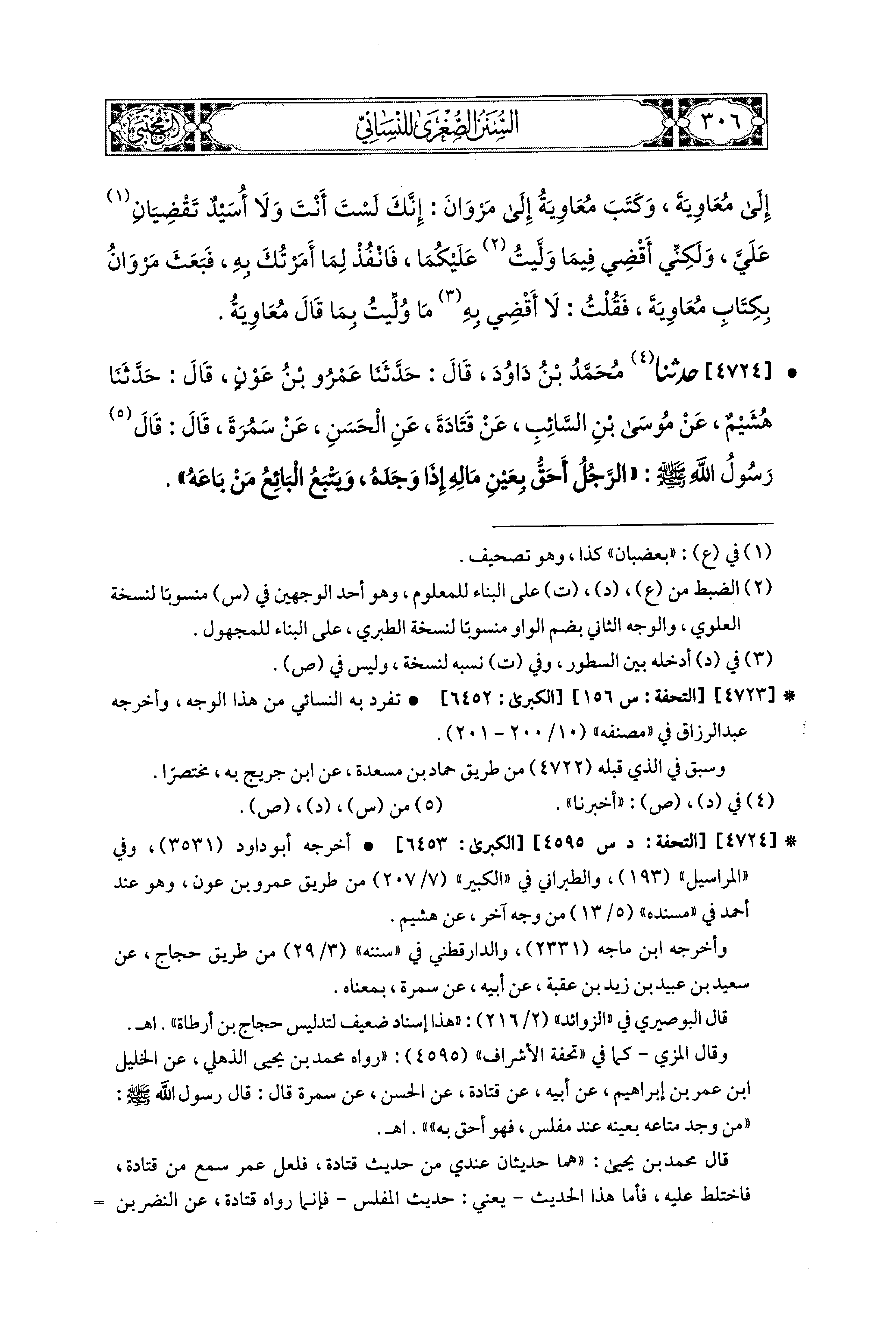4724- حَدَّثَنَا مُحَمدُ بْنُ دَاوُدَ، قال: حَدثنا عَمْرُو بْنُ عَوْنٍ، قال: حَدثنا هُشَيْمٌ، عَن مُوسَى بْنِ السَّائِبِ، عَن قَتَادَةَ، عَنِ الحَسَنِ، عَن سَمُرَةَ، قال: قَالَ رَسُولُ اللهِ صَلى الله عَليه وسَلم: الرَّجُلُ أَحَقُّ بِعَيْنِ مَالِهِ إِذَا وَجَدَهُ وَيَتْبَعُ البَائِعُ مَنْ بَاعَهُ.