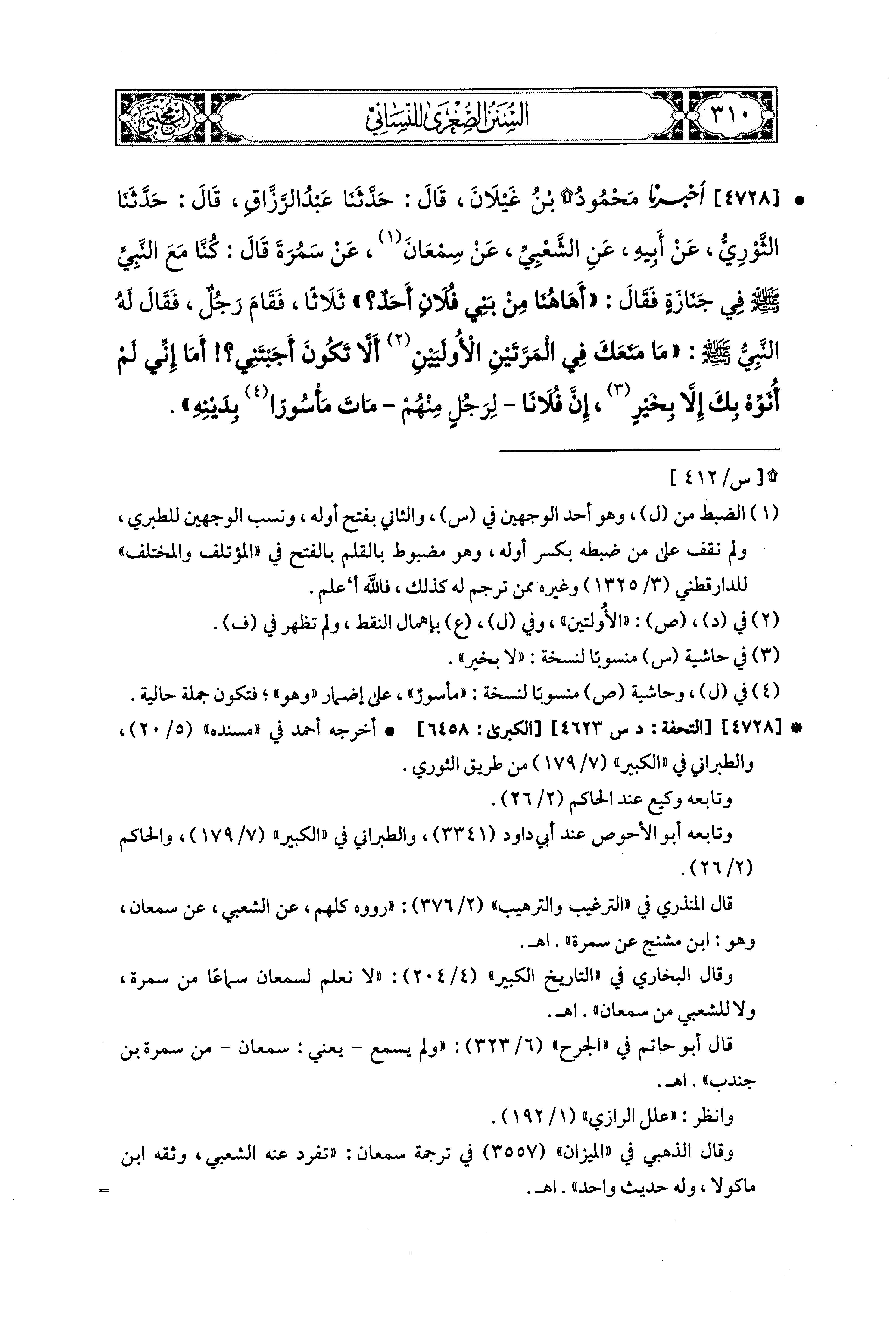 4728- أَخبَرَنا مَحْمُودُ بْنُ غَيْلاَنَ، قال: حَدثنا عَبدُ الرَّزَّاقِ، قال: حَدثنا الثَّوْرِيُّ، عَن أَبِيهِ، عَنِ الشَّعْبِيِّ، عَن سَمْعَانَ، عَن سَمُرَةَ قَالَ: كُنَّا مَعَ النَّبيِّ صَلى الله عَليه وسَلم فِي جِنَازَةٍ، فَقَالَ: أَهَاهُنَا مِنْ بَني فُلاَنٍ أَحَدٌ؟ ثَلاَثًا، فَقَامَ رَجُلٌ، فَقَالَ لَهُ النَّبيُّ صَلى الله عَليه وسَلم: مَا مَنَعَكَ فِي المَرَّتَيْنِ الأُولَيَيْنِ أَنْ لاَ تَكُونَ أَجَبْتَني؟ أَمَا إِنِّي لَمْ أُنَوِّهْ بِكَ إِلاَّ بِخَيْرٍ، إِنَّ فُلاَنًا لِرَجُلٍ مِنْهُمْ مَاتَ مَأْسُورًا بِدَيْنِهِ.