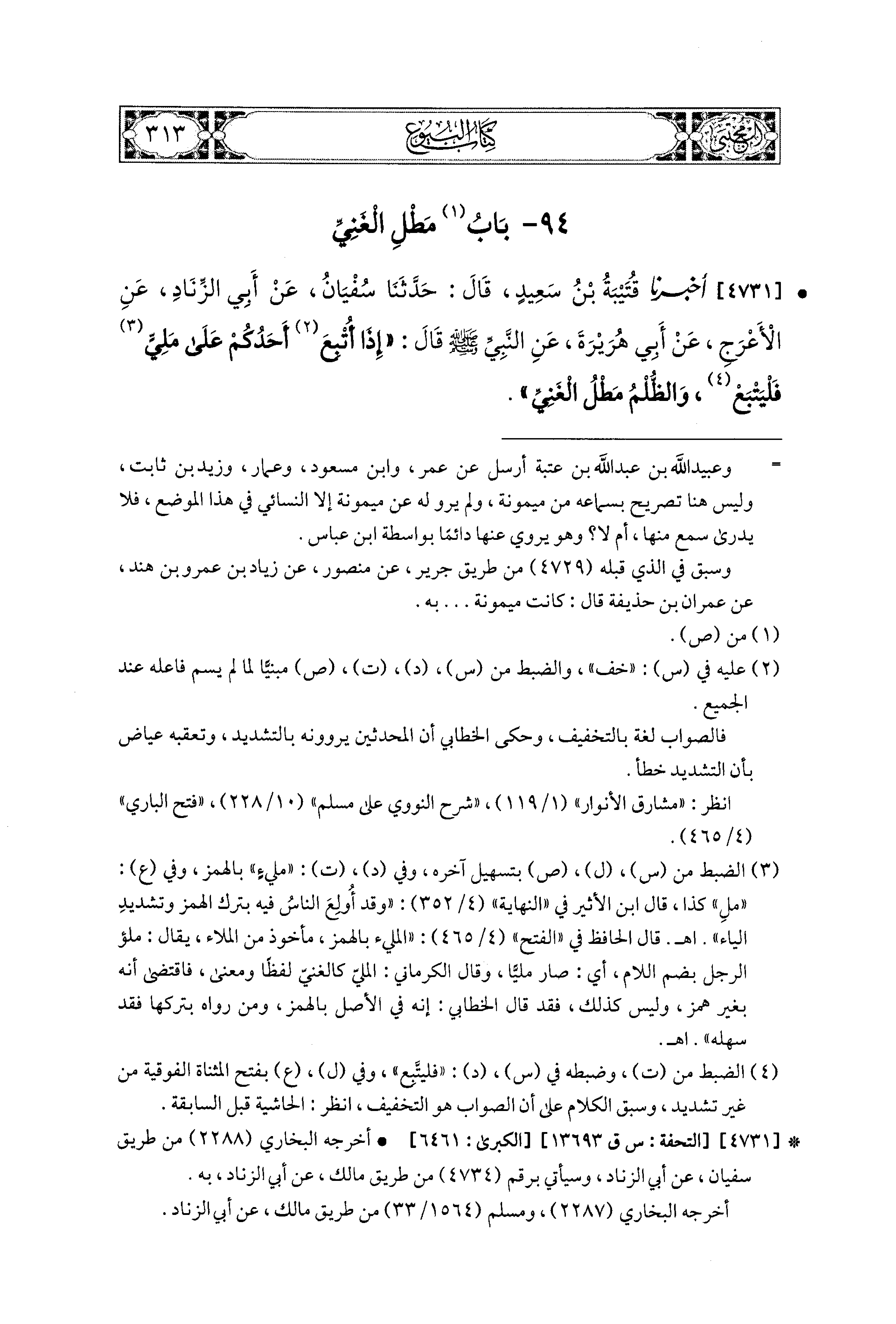 4731- أَخبَرَنا قُتَيبَةُ بْنُ سَعيدٍ، قال: حَدثنا سُفْيَانُ، عَن أَبِي الزِّنَادِ، عَنِ الأَعْرَجِ، عَن أَبِي هُرَيرَةَ، عَنِ النَّبيِّ صَلى الله عَليه وسَلم قَالَ: إِذَا أُتْبِعَ أَحَدُكُمْ عَلَى مَلِيءٍ(1) فَلْيَتْبَعْ، وَالظُّلْمُ مَطْلُ الغَنيِّ.