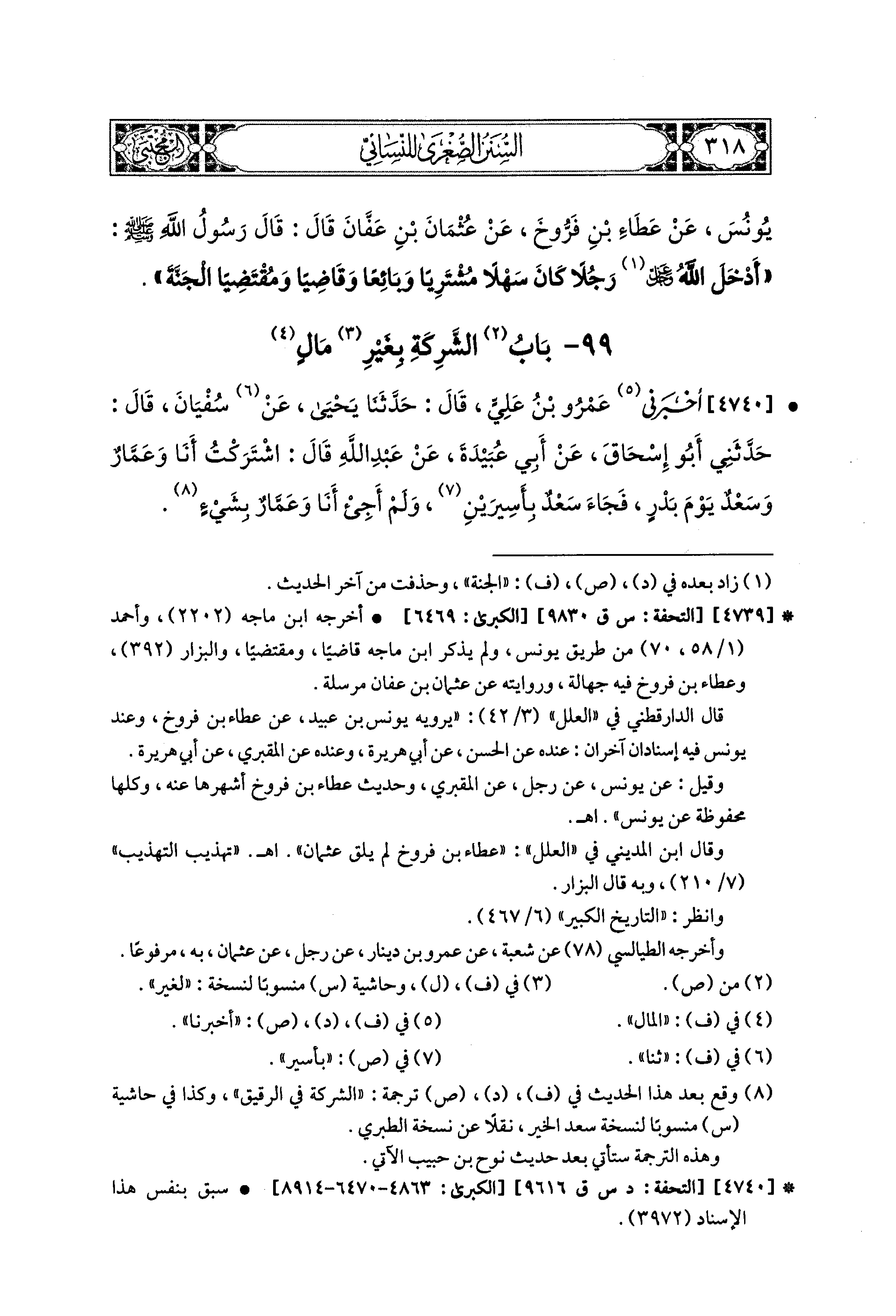 4740- أَخْبَرَني عَمْرُو بْنُ عَلِيٍّ، قال: حَدثنا يَحيَى، عَن سُفْيَانَ، قَالَ: حَدَّثَني أَبو إِسحَاقَ، عَن أَبِي عُبَيدَةَ، عَن عَبدِ اللهِ، قَالَ: اشْتَرَكْتُ أَنَا وَعَمَّارٌ، وَسَعْدٌ يَوْمَ بَدْرٍ، فَجَاءَ سَعْدٌ بِأَسِيرَيْنِ، وَلَمْ أَجِئْ أَنَا وَعَمَّارٌ بِشَيْءٍ.