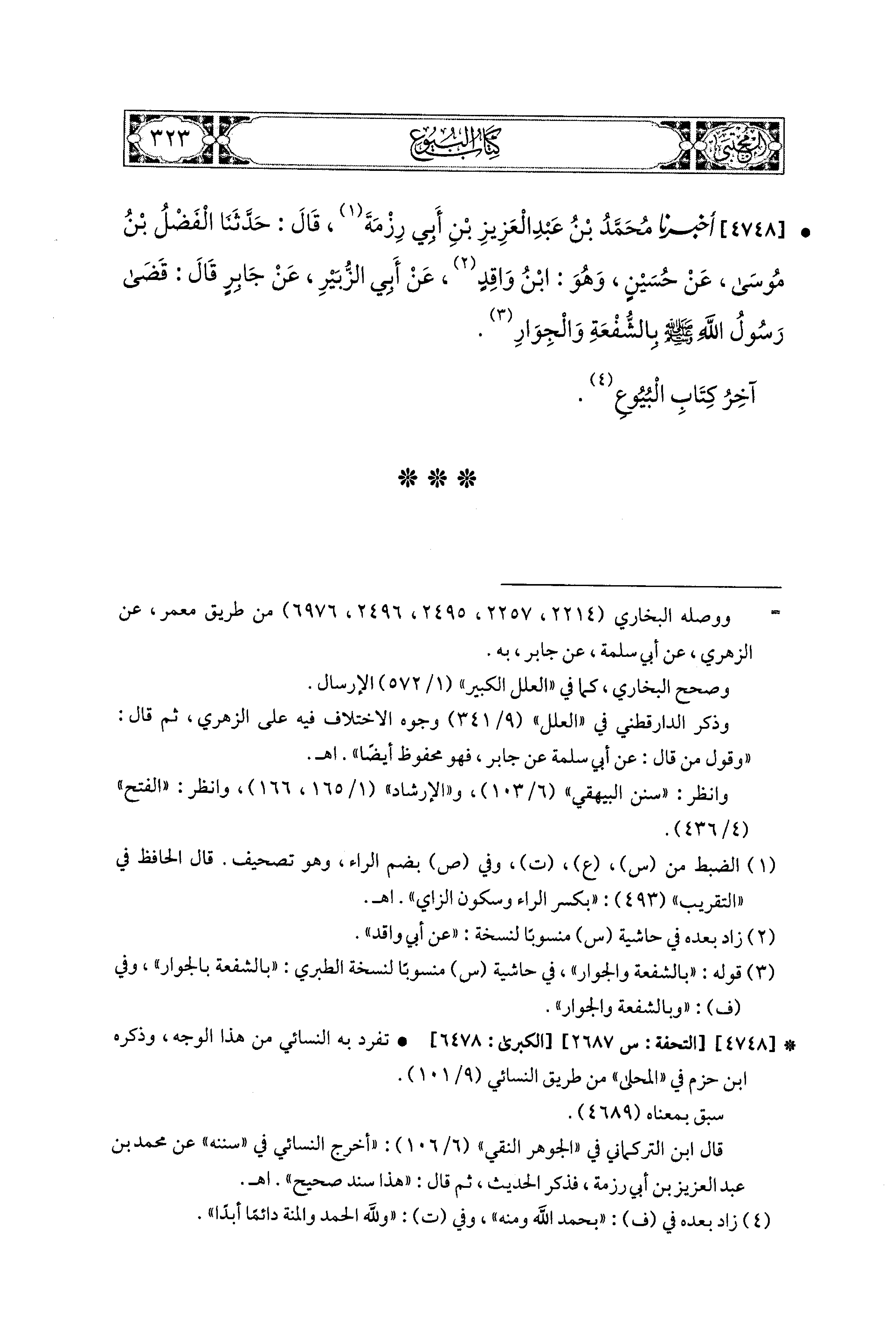4748- أَخبَرَنا مُحَمد بْنُ عَبدِ العَزِيزِ بْنِ أَبِي رِزْمَةَ، قال: حَدثنا الفَضْلُ بْنُ مُوسَى، عَن حُسَيْنٍ، وَهُوَ ابْنُ وَاقِدٍ، عَن أَبِي الزُّبَيْرِ، عَن جَابِرٍ قَالَ: قَضَى رَسُولُ اللهِ صَلى الله عَليه وسَلم بِالشُّفْعَةِ وَالجِوَارِ.