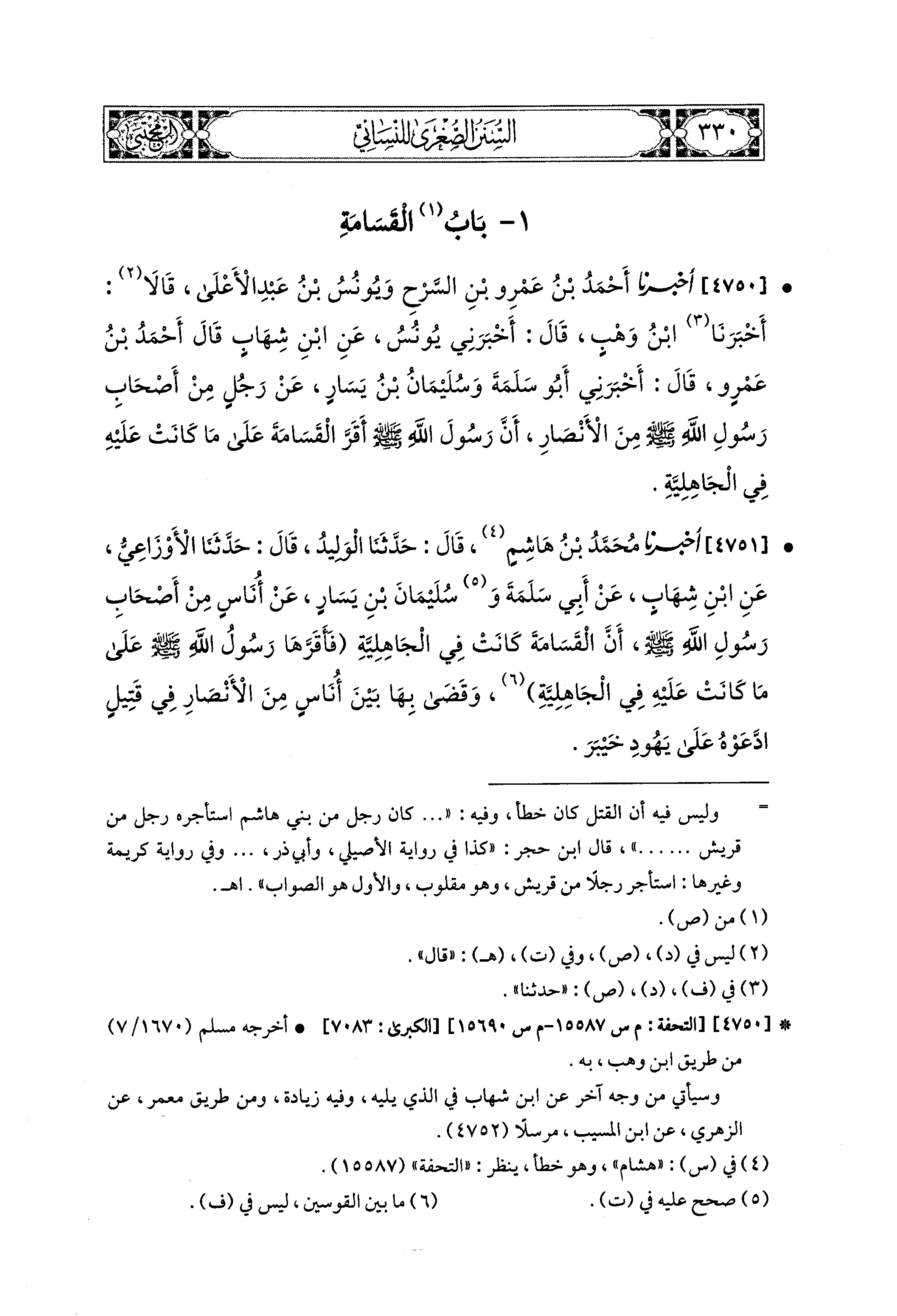4750- أَخبَرَنا أَحْمَدُ بْنُ عَمْرِو بْنِ السَّرْحِ، وَيُونُسُ بن عَبدِ الأَعلَى، قَالَا(1): أَخبَرنا ابْنُ وَهْبٍ، قَالَ: أَخْبَرَني يُونُسُ، عَنِ ابنِ شِهَابٍ، قَالَ: أَحْمَدُ بْنُ عَمْرٍو، قَالَ: أَخْبَرَني أَبو سَلَمَةَ، وَسُلَيمَانُ بْنُ يَسَارٍ، عَن رَجُلٍ، مِنْ أَصْحَابِ رَسُولِ اللهِ صَلى الله عَليه وسَلم مِنَ الأَنصَارِ، أَنَّ رَسُولَ اللهِ صَلى الله عَليه وسَلم: أَقَرَّ القَسَامَةَ عَلَى مَا كَانَتْ عَلَيْهِ فِي الجَاهِلِيَّةِ.
