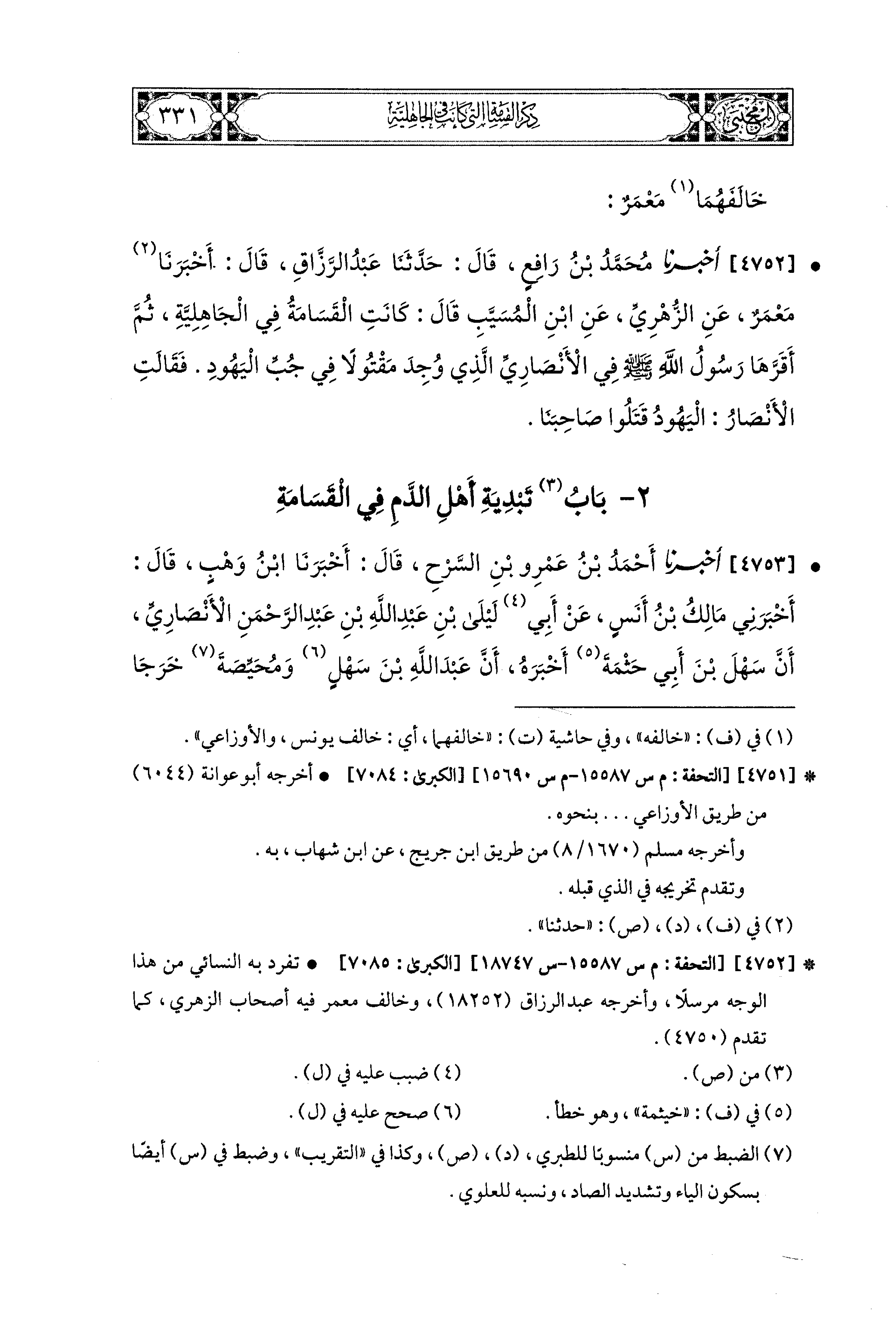 4752- أَخبَرَنا مُحَمد بْنُ رَافِعٍ، قال: حَدثنا عَبدُ الرَّزَّاقِ، قَالَ: أَخبَرنا مَعْمَرٌ، عَنِ الزُّهْرِيِّ، عَنِ ابنِ المُسَيَّبِ قَالَ: كَانَتِ القَسَامَةُ فِي الجَاهِلِيَّةِ، ثُمَّ أَقَرَّهَا رَسُولُ اللهِ صَلى الله عَليه وسَلم فِي الأَنصَارِيِّ الَّذِي وُجِدَ مَقْتُولاً فِي جُبِّ اليَهُودِ، فَقَالَتِ الأَنصَارُ: اليَهُودُ قَتَلُوا صَاحِبَنَا.