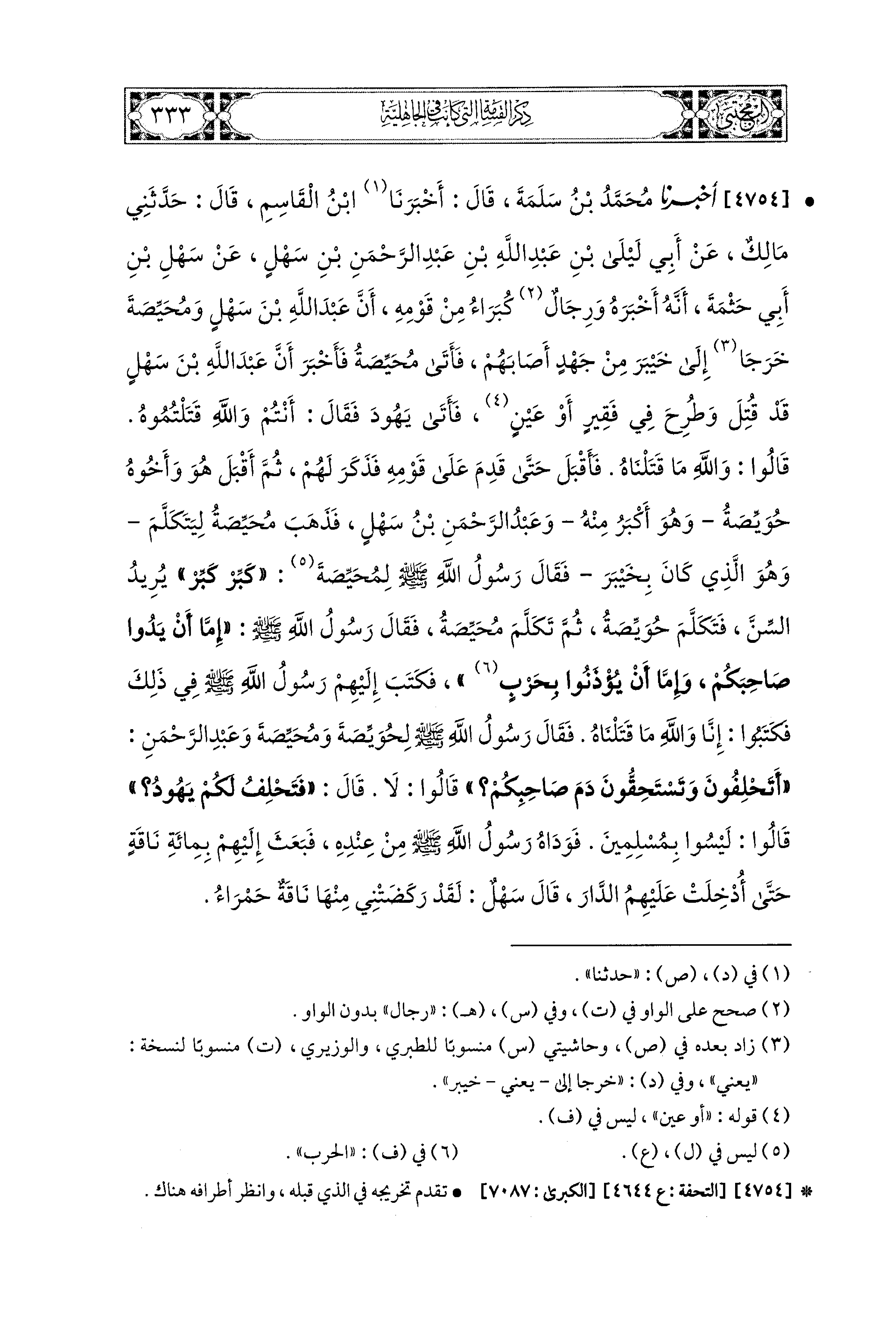 4754- أَخبَرَنا مُحَمد بْنُ سَلَمَةَ، قَالَ: أَخبَرنا ابْنُ القَاسِمِ، قَالَ: حَدَّثَني مَالِكٌ، عَن أَبِي لَيْلَى بْنِ عَبدِ اللهِ بْنِ عَبدِ الرَّحمَنِ بْنِ سَهْلٍ، عَن سَهْلِ بْنِ أَبِي حَثْمَةَ، أَنَّهُ أَخْبَرَهُ وَرِجَالٌ كُبَرَاءُ مِنْ قَوْمِهِ، أَنَّ عَبدَ اللهِ بْنَ سَهْلٍ، وَمُحَيِّصَةَ خَرَجَا إِلَى خَيْبَرَ مِنْ جَهْدٍ أَصَابَهُمْ، فَأَتَى مُحَيِّصَةُ فَأَخْبَرَ أَنَّ عَبدَ اللهِ بْنَ سَهْلٍ قَدْ قُتِلَ وَطُرِحَ فِي فَقِيرٍ، أَوْ عَيْنٍ، فَأَتَى يَهُودَ، وَقَالَ: أَنْتُمْ وَالله قَتَلْتُمُوهُ، قَالُوا: وَالله مَا قَتَلْنَاهُ، فَأَقْبَلَ حَتَّى قَدِمَ عَلَى قَوْمِهِ، فَذَكَرَ لَهُمْ، ثُمَّ أَقْبَلَ هُوَ وَأَخُوهُ حُوَيِّصَةُ وَهُوَ أَكْبَرُ مِنْهُ، وَعَبدُ الرَّحمَنِ بْنُ سَهْلٍ، فَذَهَبَ مُحَيِّصَةُ لِيَتَكَلَّمَ وَهُوَ الَّذِي كَانَ بِخَيْبَرَ، فَقَالَ رَسُولُ اللهِ صَلى الله عَليه وسَلم لِمُحَيِّصَةَ: كَبِّرْ كَبِّرْ، يُرِيدُ السِّنَّ، فَتَكَلَّمَ حُوَيِّصَةُ، ثُمَّ تَكَلَّمَ مُحَيِّصَةُ، فَقَالَ رَسُولُ اللهِ صَلى الله عَليه وسَلم: إِمَّا أَنْ يَدُوا صَاحِبَكُمْ، وَإِمَّا أَنْ يُؤْذَنُوا بِحَرْبٍ، فَكَتَبَ إِلَيْهِمْ رَسُولُ اللهِ صَلى الله عَليه وسَلم فِي ذَلِكَ، فَكَتَبُوا إِنَّا وَالله مَا قَتَلْنَاهُ، فَقَالَ رَسُولُ اللهِ صَلى الله عَليه وسَلم لِحُوَيِّصَةَ وَمُحَيِّصَةَ وَعَبدِ الرَّحمَنِ: أَتَحْلِفُونَ وَتَسْتَحِقُّونَ دَمَ صَاحِبِكُمْ؟ قَالُوا: لاَ، قَالَ: فَتَحْلِفُ لَكُمْ يَهُودُ؟ قَالُوا: لَيْسُوا بِمُسْلِمينَ، فَوَدَاهُ رَسُولُ اللهِ صَلى الله عَليه وسَلم مِنْ عِنْدِهِ، فَبَعَثَ إِلَيْهِمْ بِمِئَةِ نَاقَةٍ حَتَّى أُدْخِلَتْ عَلَيْهِمُ الدَّارُ، قَالَ سَهْلٌ: لَقَدْ رَكَضَتْني مِنْهَا نَاقَةٌ حَمْرَاءُ.