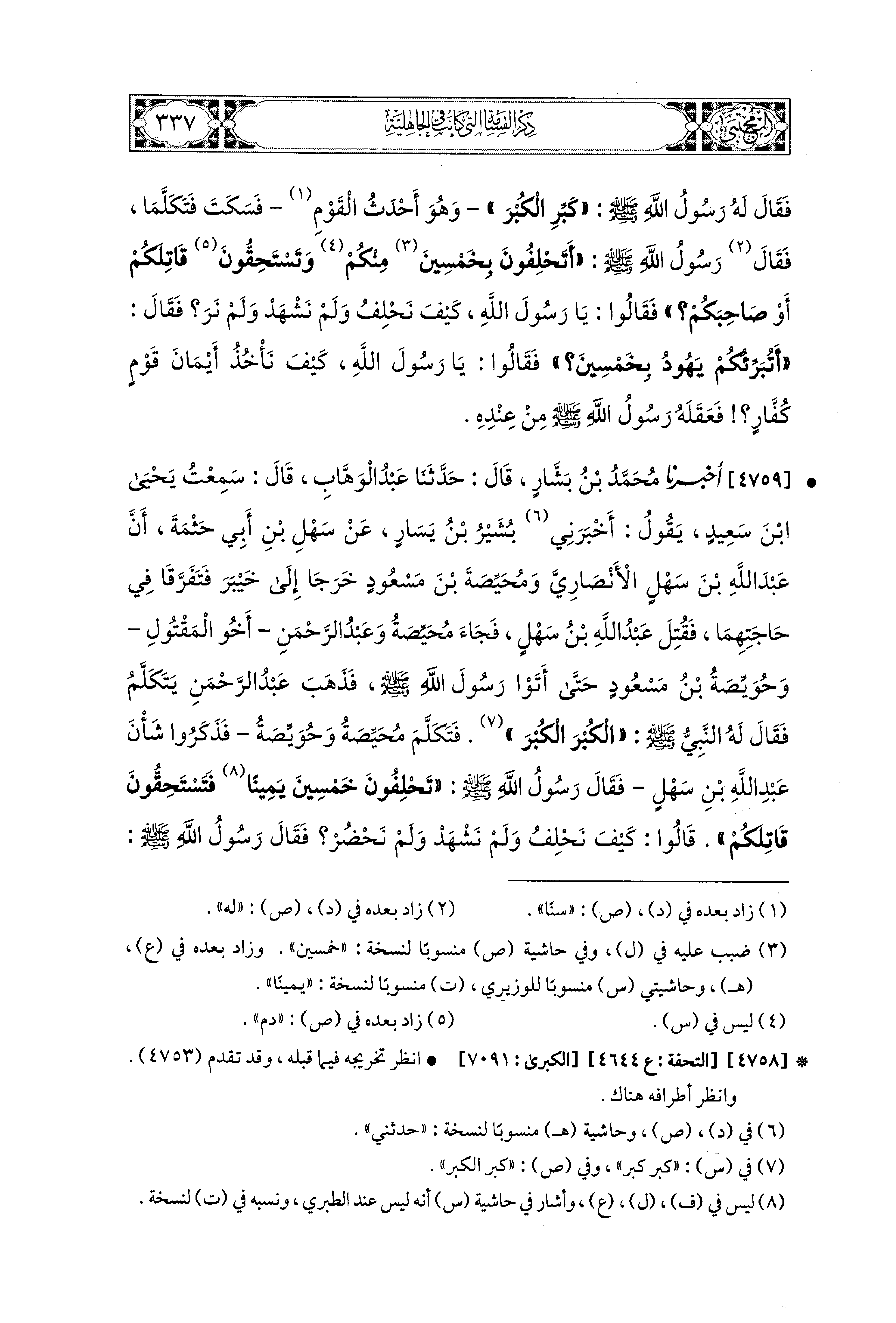 4759- أَخبَرَنا مُحَمد بْنُ بَشَّارٍ، قال: حَدثنا عَبدُ الوَهَّابِ، قَالَ: سَمِعْتُ يَحيَى بْنُ سَعيدٍ، يَقُولُ: أَخْبَرَني بُشَيْرُ بْنُ يَسَارٍ، عَن سَهْلِ بْنِ أَبِي حَثْمَةَ، أَنَّ عَبدَ اللهِ بْنَ سَهْلٍ الأَنصَارِيَّ، وَمُحَيِّصَةَ بْنَ مَسْعُودٍ، خَرَجَا إِلَى خَيْبَرَ، فَتَفَرَّقَا فِي حَاجَتِهِمَا، فَقُتِلَ عَبدُ اللهِ بْنُ سَهْلٍ، فَجَاءَ مُحَيِّصَةُ وَعَبدُ الرَّحمَنِ أَخُو المَقْتُولِ وَحُوَيِّصَةُ بْنُ مَسْعُودٍ حَتَّى أَتَوْا رَسُولَ اللهِ صَلى الله عَليه وسَلم، فَذَهَبَ عَبدُ الرَّحمَنِ يَتَكَلَّمُ، فَقَالَ لَهُ النَّبيُّ صَلى الله عَليه وسَلم: الكُبْرَ الكُبْرَ، فَتَكَلَّمَ مُحَيِّصَةُ وَحُوَيِّصَةُ، فَذَكَرُوا شَأْنَ عَبدِ اللهِ بْنِ سَهْلٍ، فَقَالَ رَسُولُ اللهِ صَلى الله عَليه وسَلم: تَحْلِفُونَ خَمْسِينَ يَمينًا، فَتَسْتَحِقُّونَ قَاتِلَكُمْ؟ قَالُوا: كَيْفَ نَحْلِفُ، وَلَمْ نَشْهَدْ، وَلَمْ نَحْضُرْ؟ فَقَالَ رَسُولُ اللهِ صَلى الله عَليه وسَلم: فَتُبْرِئُكُمْ يَهُودُ بِخَمْسِينَ يَمينًا؟ قَالُوا: يَا رَسُولَ اللهِ، كَيْفَ نَقْبَلُ أَيْمَانَ قَوْمٍ كُفَّارٍ؟ قَالَ: فَوَدَاهُ رَسُولُ اللهِ صَلى الله عَليه وسَلم، قَالَ بُشَيْرٌ: قَالَ لِي سَهْلُ بْنُ أَبِي حَثْمَةَ: لَقَدْ رَكَضَتْني فَرِيضَةٌ مِنْ تِلْكَ الفَرَائِضِ فِي مِرْبَدٍ لَنَا.