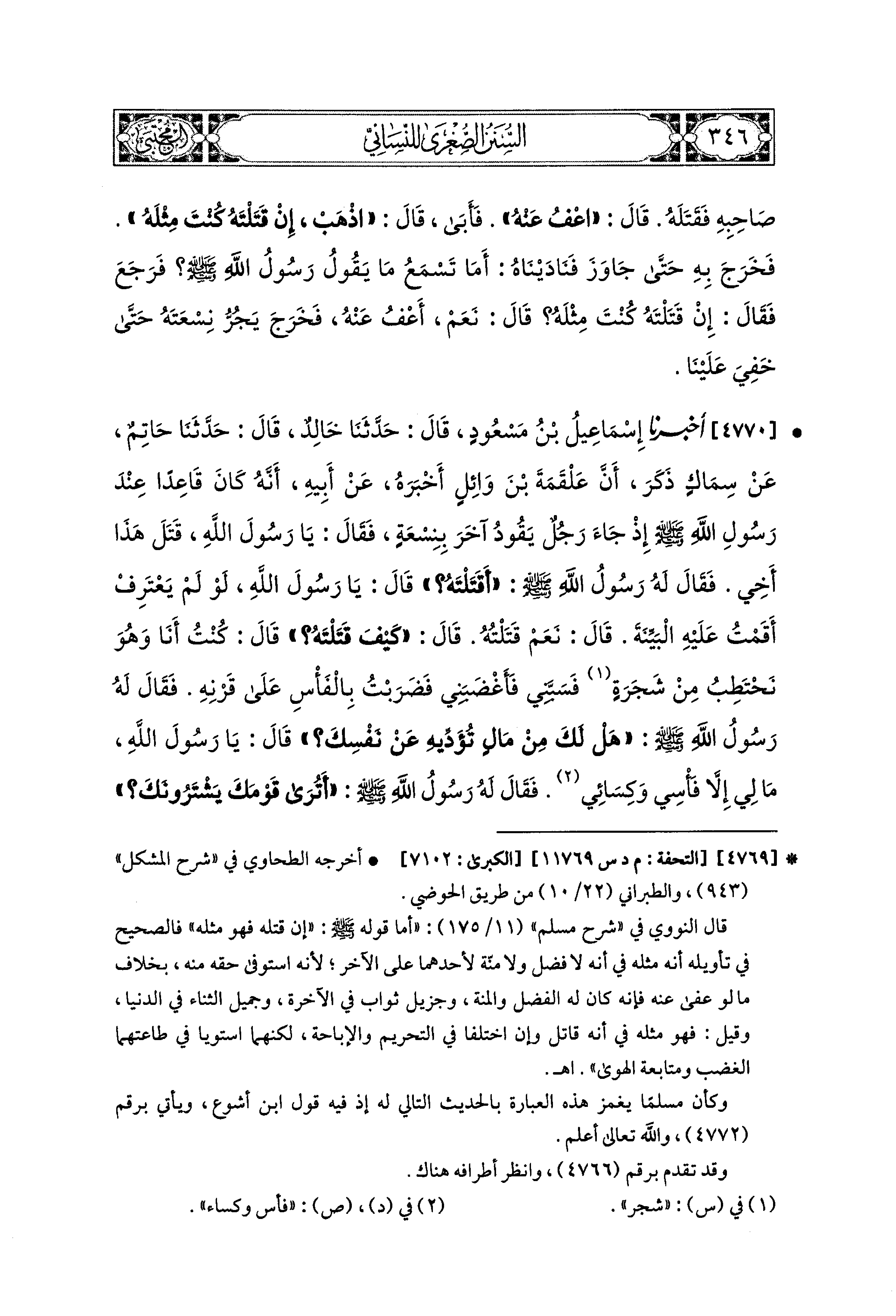 4770- أَخبَرَنا إِسماعِيلُ بْنُ مَسْعُودٍ، قال: حَدثنا خَالِدٌ، قال: حَدثنا حَاتِمٌ، عَن سِمَاكٍ، ذَكَرَ أَنَّ عَلْقَمَةَ بْنَ وَائِلٍ، أَخْبَرَهُ، عَن أَبِيهِ ؛ أَنَّهُ كَانَ قَاعِدًا عِنْدَ رَسُولِ اللهِ صَلى الله عَليه وسَلم إِذْ جَاءَ رَجُلٌ يَقُودُ آخَرَ بِنِسْعَةٍ، فَقَالَ: يَا رَسُولَ اللهِ، قَتَلَ هَذَا أَخِي، فَقَالَ لَهُ رَسُولُ اللهِ صَلى الله عَليه وسَلم: أَقَتَلْتَهُ؟ قَالَ: يَا رَسُولَ اللهِ، لَوْ لَمْ يَعْتَرِفْ، أَقَمْتُ عَلَيْهِ البَيِّنَةَ؟ قَالَ: نَعَمْ قَتَلْتُهُ، قَالَ: كَيْفَ قَتَلْتَهُ؟ قَالَ: كُنْتُ أَنَا وَهُوَ نَحْتَطِبُ مِنْ شَجَرَةٍ، فَسَبَّني، فَأَغْضَبَني، فَضَرَبْتُ بِالفَأْسِ عَلَى قَرْنِهِ، فَقَالَ لَهُ رَسُولُ اللهِ صَلى الله عَليه وسَلم: هَلْ لَكَ مِنْ مَالٍ تُؤَدِّيهِ عَن نَفْسِكَ؟ قَالَ: يَا رَسُولَ اللهِ، مَا لِي إِلاَّ فَأْسِي وَكِسَائِي، فَقَالَ لَهُ رَسُولُ اللهِ صَلى الله عَليه وسَلم: أَتُرَى قَوْمَكَ يَشْتَرُونَكَ؟ قَالَ: أَنَا أَهْوَنُ عَلَى قَوْمي مِنْ ذَاكَ، فَرَمَى بِالنِّسْعَةِ إِلَى الرَّجُلِ، فَقَالَ: دُونَكَ صَاحِبَكَ، فَلَمَّا وَلَّى قَالَ رَسُولُ اللهِ صَلى الله عَليه وسَلم: إِنْ قَتَلَهُ فَهُوَ مِثْلُهُ، فَأَدْرَكُوا الرَّجُلَ فَقَالُوا: وَيْلَكَ إِنَّ رَسُولَ اللهِ صَلى الله عَليه وسَلم قَالَ: إِنْ قَتَلَهُ فَهُوَ مِثْلُهُ، فَرَجَعَ إِلَى رَسُولِ اللهِ صَلى الله عَليه وسَلم فَقَالَ: يَا رَسُولَ اللهِ، حُدِّثْتُ أَنَّكَ قُلْتَ: إِنْ قَتَلَهُ فَهُوَ مِثْلُهُ، وَهَلْ أَخَذْتُهُ إِلاَّ بِأَمْرِكَ؟ فَقَالَ: مَا تُرِيدُ أَنْ يَبُوءَ بِإِثْمِكَ، وَإِثْمِ صَاحِبِكَ، قَالَ: بَلَى، قَالَ: فَإِنْ ذَاكَ، قَالَ: ذَلِكَ كَذَلِكَ.