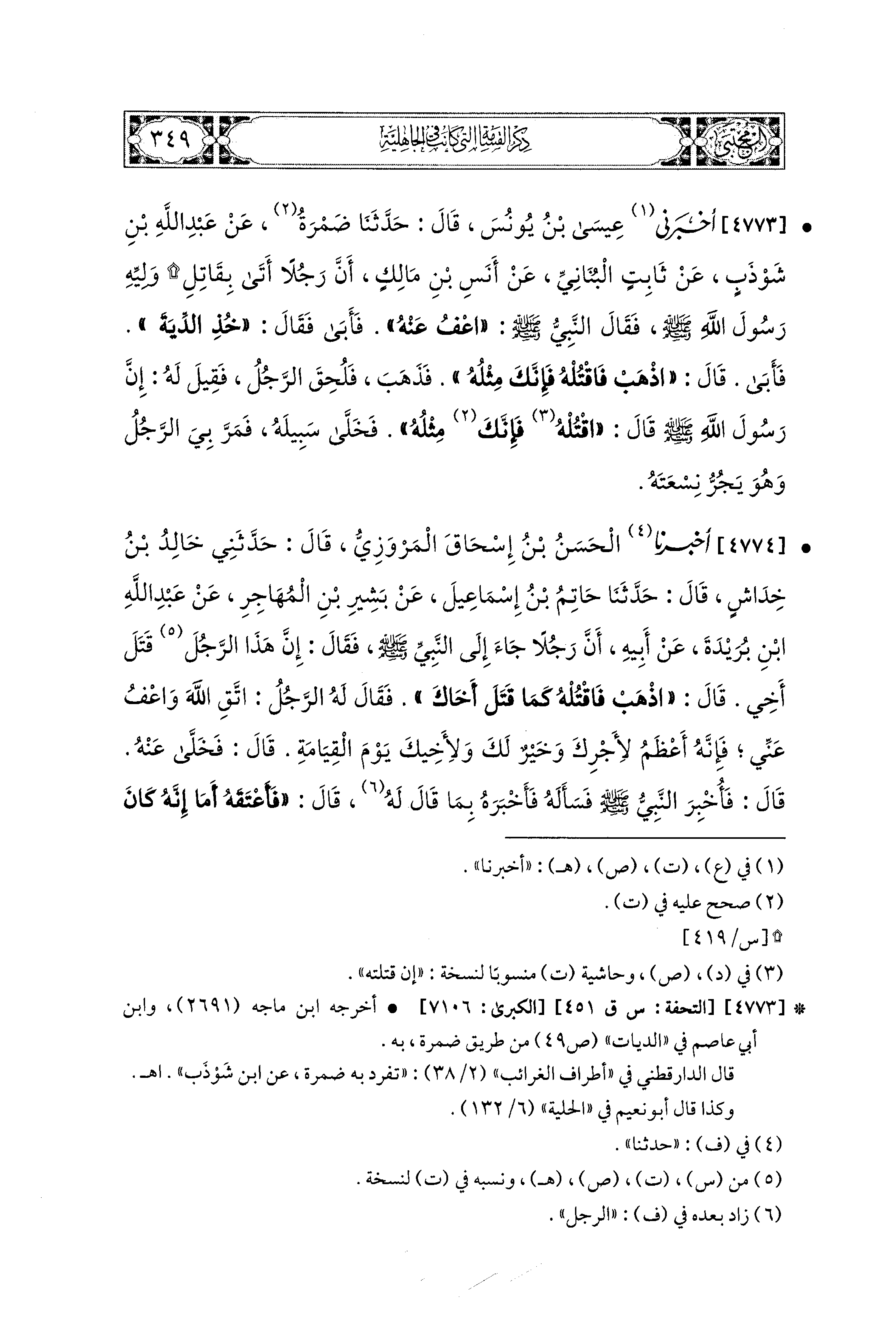 4773- أَخبَرَنا عِيسَى بْنُ يُونُسَ، قال: حَدثنا ضَمْرَةُ، عَن عَبد اللهِ بن شَوْذَبٍ، عَن ثَابِتٍ البُنَانيِّ، عَن أَنَسِ بْنِ مَالِكٍ، أَنَّ رَجُلاً أَتَى بِقَاتِلِ وَلِيِّهِ رَسُولَ اللهِ صَلى الله عَليه وسَلم، فَقَالَ النَّبيُّ صَلى الله عَليه وسَلم: اعْفُ عَنْهُ، فَأَبَى، فَقَالَ: خُذِ الدِّيَةَ، فَأَبَى، قَالَ: اذْهَبْ فَاقْتُلْهُ، فَإِنَّكَ مِثْلَهُ، فَذَهَبَ فَلُحِقَ الرَّجُلُ، فَقِيلَ لَهُ: إِنَّ رَسُولَ اللهِ صَلى الله عَليه وسَلم قَالَ: اقْتُلْهُ فَإِنَّكَ مِثْلَهُ، فَخَلَّى سَبِيلَهُ، فَمَرَّ بِي الرَّجُلُ وَهُوَ يَجُرُّ نِسْعَتَهُ.