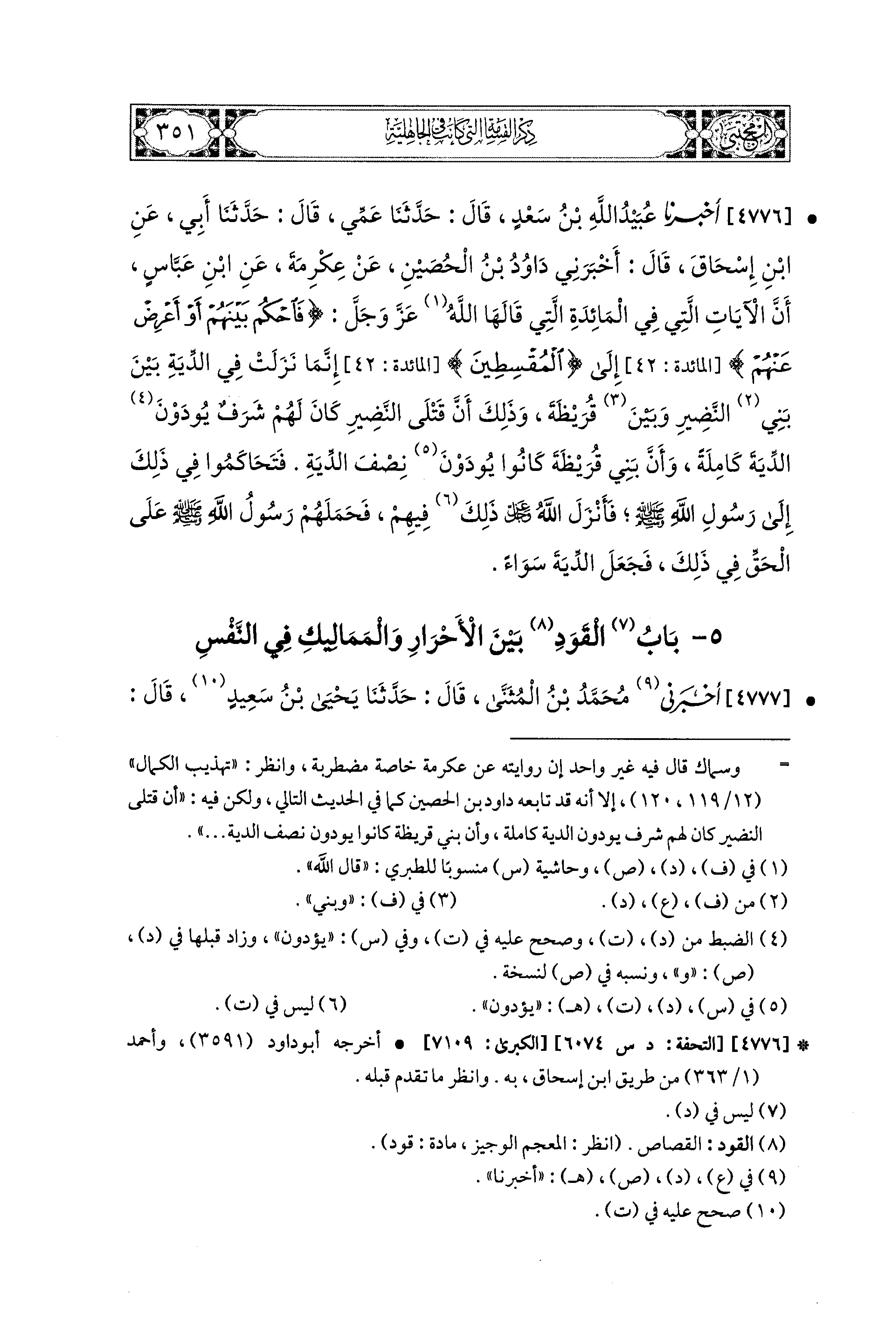 4776- أَخبَرَنا عُبَيدُ اللهِ بْنُ سَعْدٍ، قال: حَدثنا عَمِّي، قال: حَدثنا أَبِي، عَنِ ابنِ إِسحَاقَ، أَخْبَرَني دَاوُدُ بْنُ الحُصَيْنِ، عَن عِكْرِمَةَ، عَنِ ابنِ عَبَّاسٍ؛ أَنَّ الآيَاتِ الَّتِي فِي المَائِدَةِ الَّتِي قَالَهَا اللهُ عَزَّ وَجَلَّ: {فَاحْكُمْ بَيْنَهُمْ، أَوْ أَعْرِضْ عَنْهُمْ} إِلَى {المُقْسِطِينَ} إِنَّمَا نَزَلَتْ فِي الدِّيَةِ بَيْنَ بَنِي النَّضِيرِ وَبَنِي قُرَيْظَةَ(1) وَذَلِكَ أَنَّ قَتْلَى النَّضِيرِ كَانَ لَهُمْ شَرَفٌ يُودَوْنَ الدِّيَةَ كَامِلَةً، وَأَنَّ بَني قُرَيْظَةَ كَانُوا يُودَوْنَ نِصْفَ الدِّيَةِ، فَتَحَاكَمُوا فِي ذَلِكَ إِلَى رَسُولِ اللهِ صَلى الله عَليه وسَلم، فَأَنْزَلَ اللهُ عَزَّ وَجَلَّ ذَلِكَ فِيهِمْ، فَحَمَلَهُمْ رَسُولُ اللهِ صَلى الله عَليه وسَلم عَلَى الحَقِّ فِي ذَلِكَ فَجَعَلَ الدِّيَةَ سَوَاءً.
