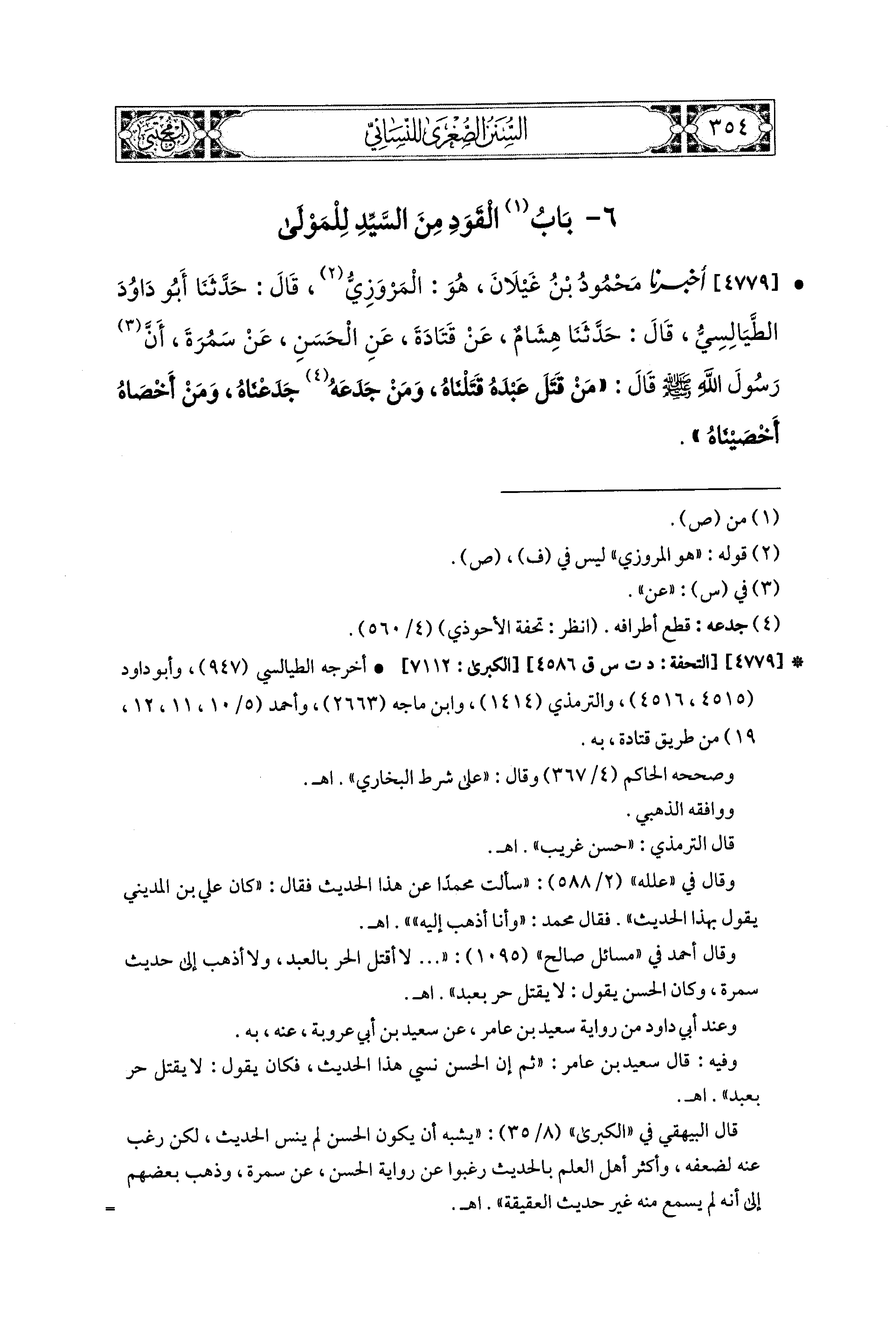 4779- أَخبَرَنا مَحْمُودُ بْنُ غَيْلاَنَ، هُوَ المَرْوَزِيُّ، قال: حَدثنا أَبو دَاوُدَ الطَّيَالِسِيُّ، قال: حَدثنا هِشَامٌ، عَن قَتَادَةَ، عَنِ الحَسَنِ، عَن سَمُرَةَ، أَنَّ رَسُولَ اللهِ صَلى الله عَليه وسَلم قَالَ: مَنْ قَتَلَ عَبدَهُ قَتَلْنَاهُ، وَمَنْ جَدَعَهُ جَدَعْنَاهُ، وَمَنْ أَخْصَاهُ أَخْصَيْنَاهُ.