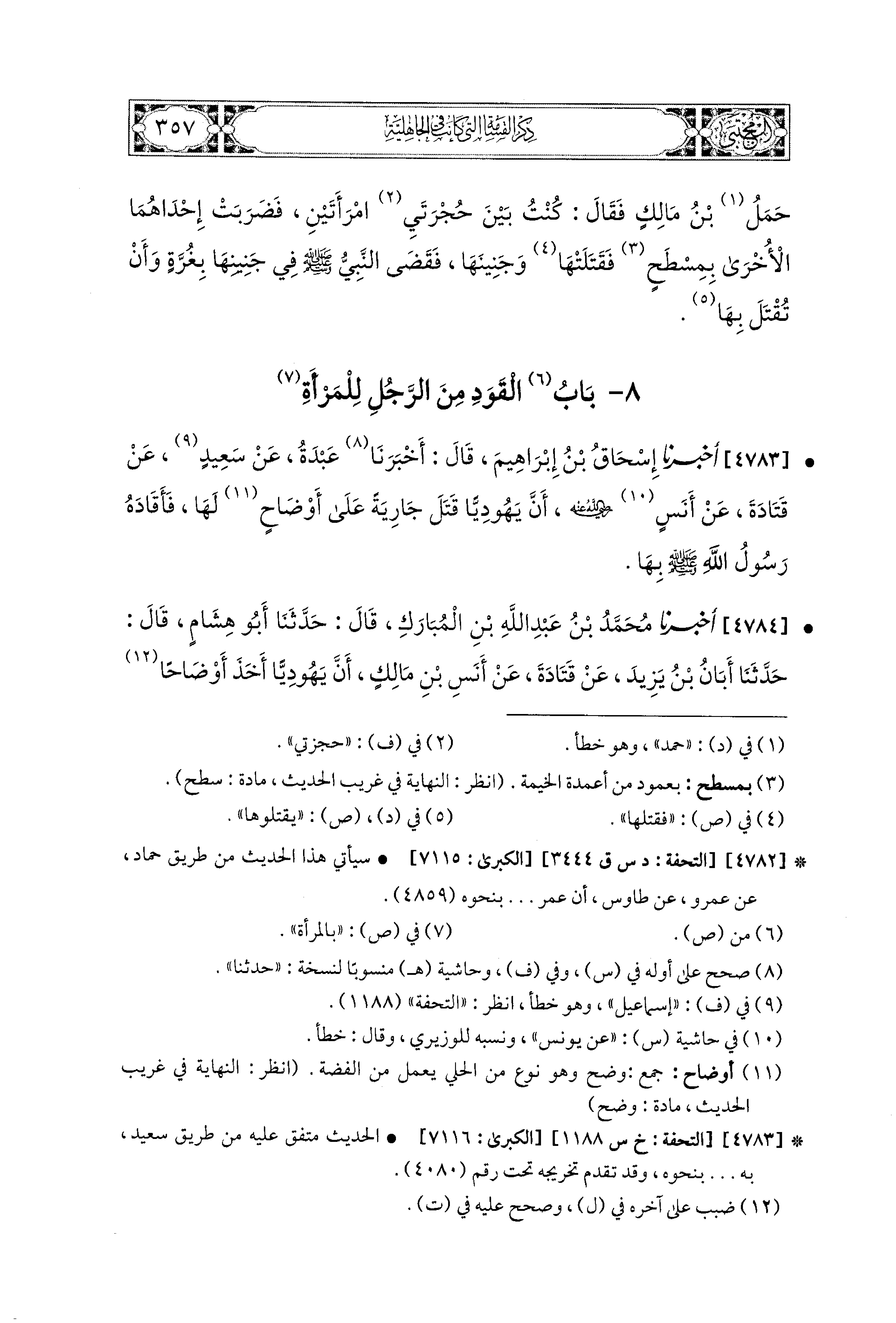 4784- أَخبَرَنا مُحَمد بْنُ عَبدِ اللهِ بْنِ المُبَارَكِ، قال: حَدثنا أَبو هِشَامٍ، قال: حَدثنا أَبَانُ بْنُ يَزِيدَ، عَن قَتَادَةَ، عَن أَنَسِ بْنِ مَالِكٍ ؛ أَنَّ يَهُودِيًّا أَخَذَ أَوْضَاحًا مِنْ جَارِيَةٍ، ثُمَّ رَضَخَ رَأْسَهَا بَيْنَ حَجَرَيْنِ، فَأَدْرَكُوهَا وَبِهَا رَمَقٌ، فَجَعَلُوا يَتَّبِعُونَ بِهَا النَّاسَ، هُوَ هَذَا، هُوَ هَذَا، قَالَتْ: نَعَمْ، فَأَمَرَ رَسُولُ اللهِ صَلى الله عَليه وسَلم فَرُضِخَ رَأْسُهُ بَيْنَ حَجَرَيْنِ.