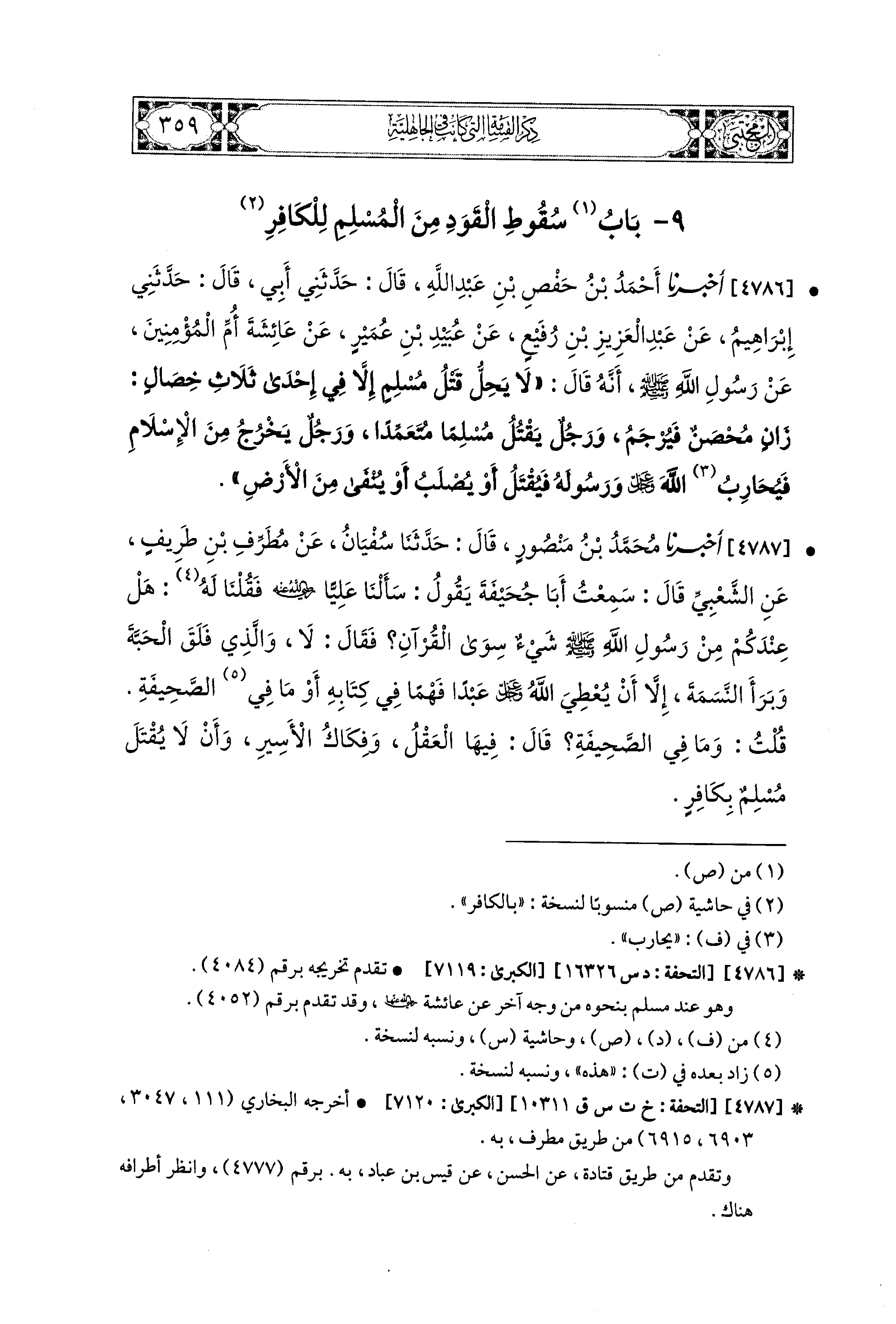 4787- أَخبَرَنا مُحَمد بْنُ مَنْصُورٍ، قال: حَدثنا سُفْيَانُ، عَن مُطَرِّفِ بْنِ طَرِيفٍ، عَنِ الشَّعْبِيِّ، قَالَ: سَمِعْتُ أَبَا جُحَيْفَةَ يَقُولُ: سَأَلْنَا عَلِيًّا رضي الله عنه, فَقُلْنَا له: هَلْ عِنْدَكُمْ مِنْ رَسُولِ اللهِ صَلى الله عَليه وسَلم شَيْءٌ سِوَى القُرْآنِ؟ فَقَالَ: لاَ، وَالَّذِي فَلَقَ الحَبَّةَ وَبَرَأَ النَّسَمَةَ، إِلاَّ أَنْ يُعْطِيَ اللهُ عَزَّ وَجَلَّ عَبدًا فَهْمًا فِي كِتَابِهِ، أَوْ مَا فِي الصَّحِيفَةِ، قُلْتُ: وَمَا فِي الصَّحِيفَةِ؟ قَالَ: فِيهَا العَقْلُ، وَفِكَاكُ الأَسِيرِ، وَأَنْ لاَ يُقْتَلَ مُسْلِمٌ بِكَافِرٍ.