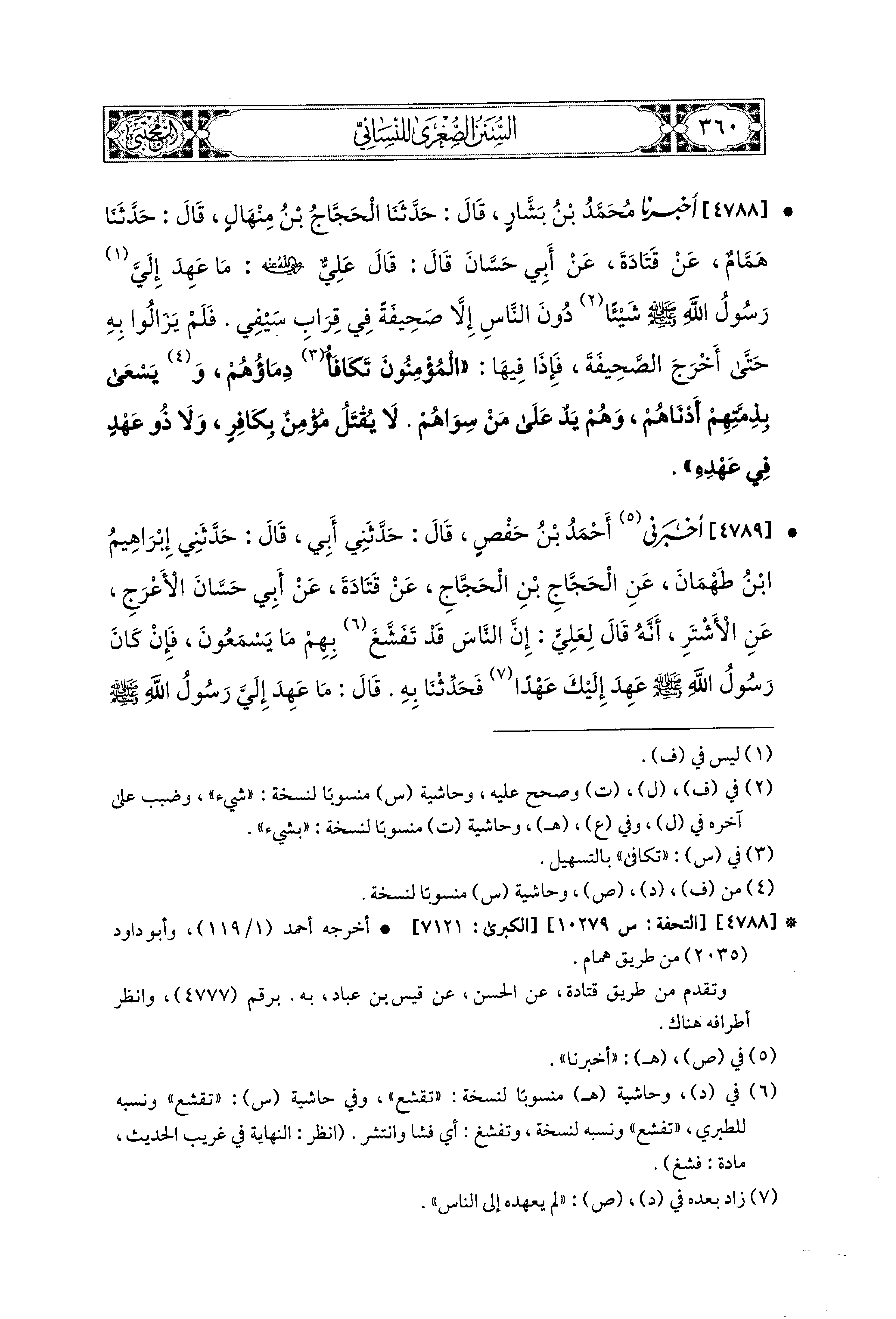 4788- أَخبَرَنا مُحَمد بْنُ بَشَّارٍ، قال: حَدثنا الحَجَّاجُ بْنُ مِنْهَالٍ، قال: حَدثنا هَمَّامٌ، عَن قَتَادَةَ، عَن أَبِي حَسَّانَ قَالَ: قَالَ عَلِيٌّ رضي الله عنه: مَا عَهِدَ إِلَيَّ رَسُولُ اللهِ صَلى الله عَليه وسَلم شَيْئًا دُونَ النَّاسِ، إِلاَّ صَحِيفَةً فِي قِرَابِ سَيْفِي، فَلَمْ يَزَالُوا بِهِ حَتَّى أَخْرَجَ الصَّحِيفَةَ، فَإِذَا فِيهَا: المُؤْمِنُونَ تَكَافَأُ دِمَاؤُهُمْ ويَسْعَى بِذِمَّتِهِمْ أَدْنَاهُمْ، وَهُمْ يَدٌ عَلَى مَنْ سِوَاهُمْ، لاَ يُقْتَلُ مُؤْمِنٌ بِكَافِرٍ، وَلاَ ذُو عَهْدٍ فِي عَهْدِهِ.
