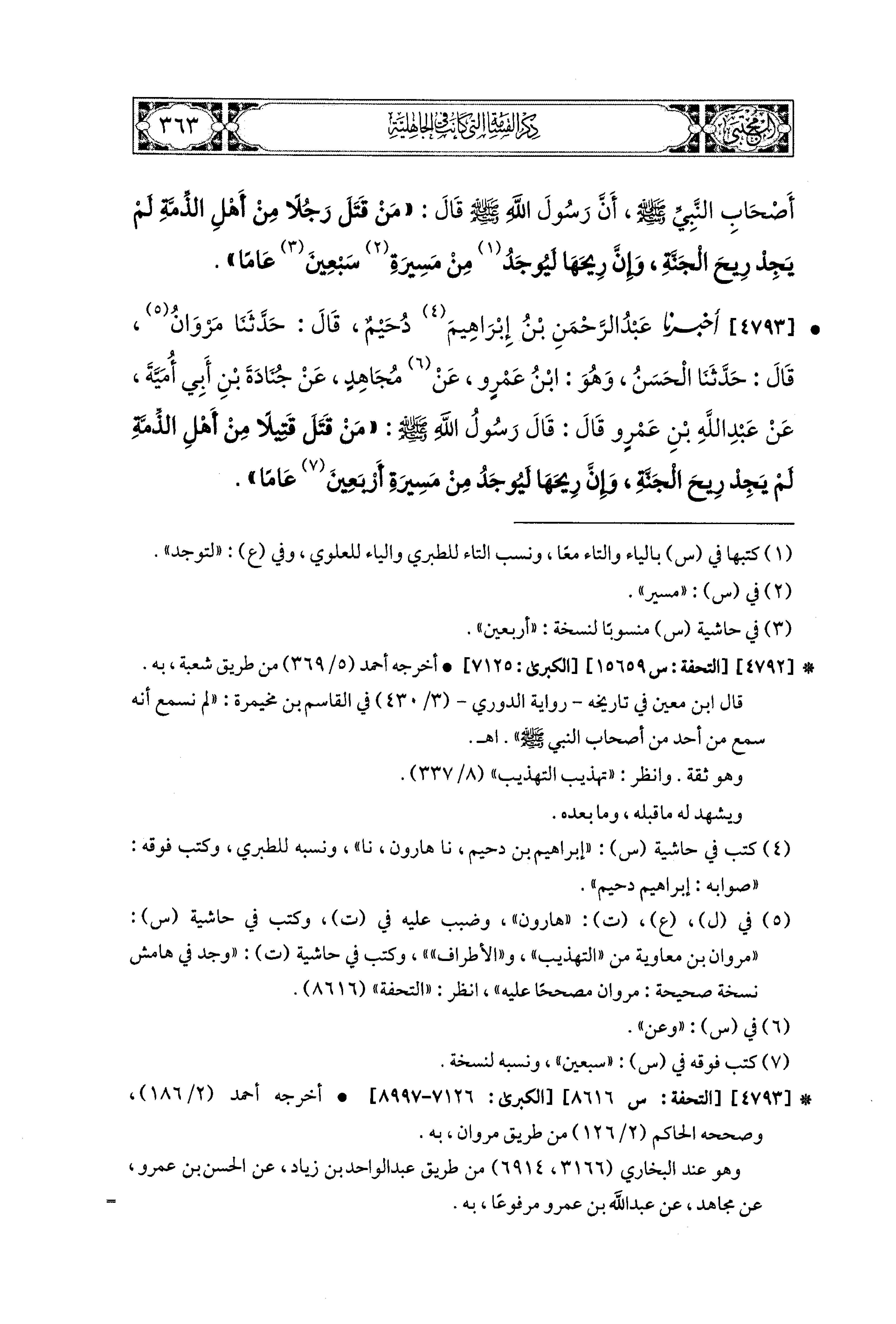 4793- أَخبَرَنا عَبدُ الرَّحمَنِ بْنُ إِبراهِيمَ دُحَيْمٌ، قال: حَدثنا مَرْوَانُ، قال: حَدثنا الحَسَنُ، وَهُوَ ابْنُ عَمْرٍو، عَن مُجَاهِدٍ، عَن جُنَادَةَ بْنِ أَبِي أُمَيَّةَ، عَن عَبد اللهِ بن عَمْرٍو قَالَ: قَالَ رَسُولُ اللهِ صَلى الله عَليه وسَلم: مَنْ قَتَلَ قَتِيلاً مِنْ أَهْلِ الذِّمَّةِ، لَمْ يَجِدْ رِيحَ الجَنَّةِ، وَإِنَّ رِيحَهَا لَيُوجَدُ مِنْ مَسِيرَةِ أَرْبَعِينَ عَامًا.