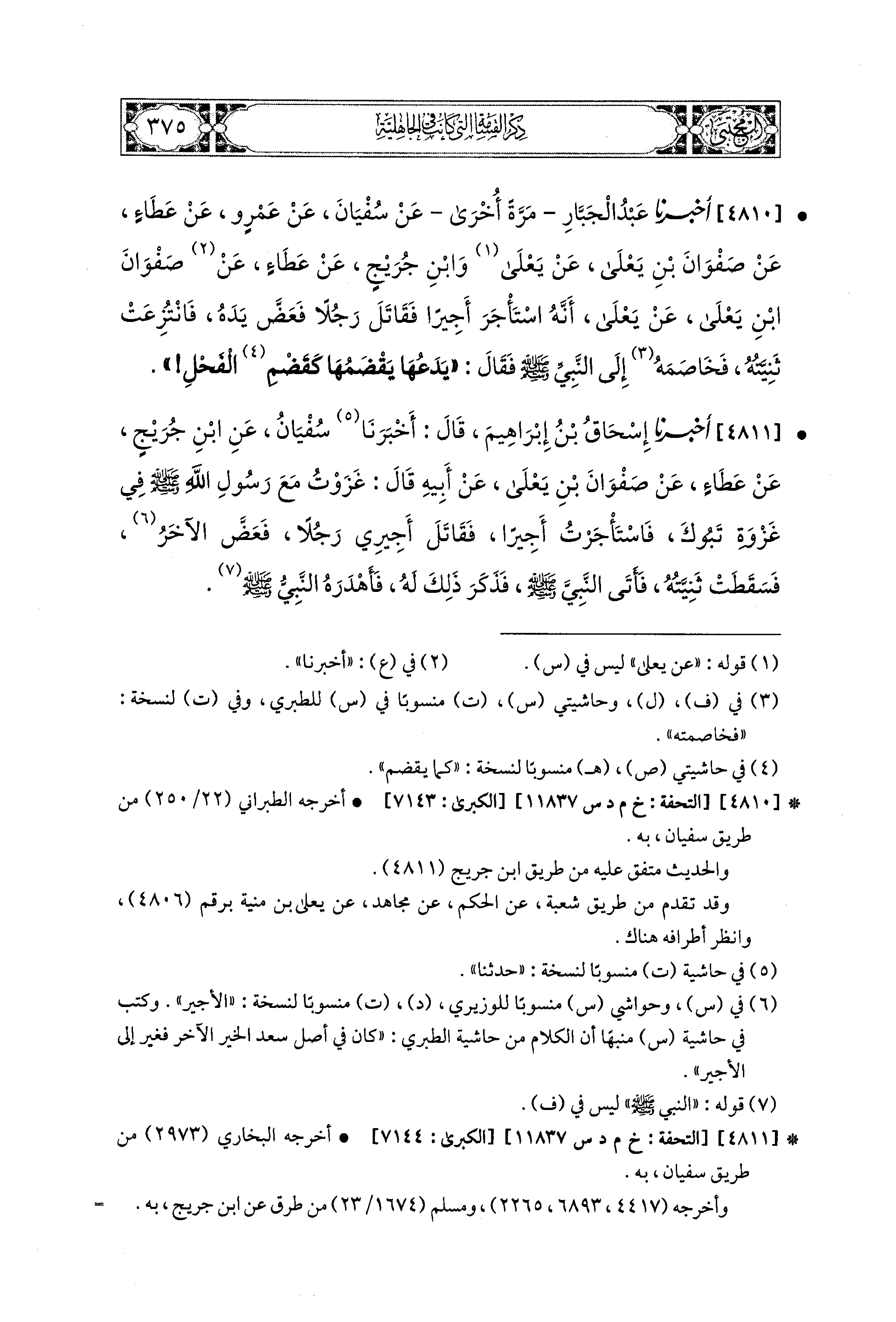 4810- أَخبَرَنا عَبدُ الجَبَّارِ مَرَّةً أُخْرَى، عَن سُفْيَانَ، عَن عَمْرٍو، عَن عَطَاءٍ، عَن صَفْوَانَ بْنِ يَعْلَى، عَن يَعْلَى، وَابْنُ جُرَيْجٍ، عَن عَطَاءٍ، عَن صَفْوَانَ بْنِ يَعْلَى، عَن يَعْلَى؛ أَنَّهُ اسْتَأْجَرَ أَجِيرًا فَقَاتَلَ رَجُلاً، فَعَضَّ يَدَهُ، فَانْتُزِعَتْ ثَنيَّتُهُ، فَخَاصَمَهُ إِلَى النَّبيِّ صَلى الله عَليه وسَلم، فَقَالَ: يَدَعُهَا يَقْضَمُهَا كَقَضْمِ الفَحْلِ؟.