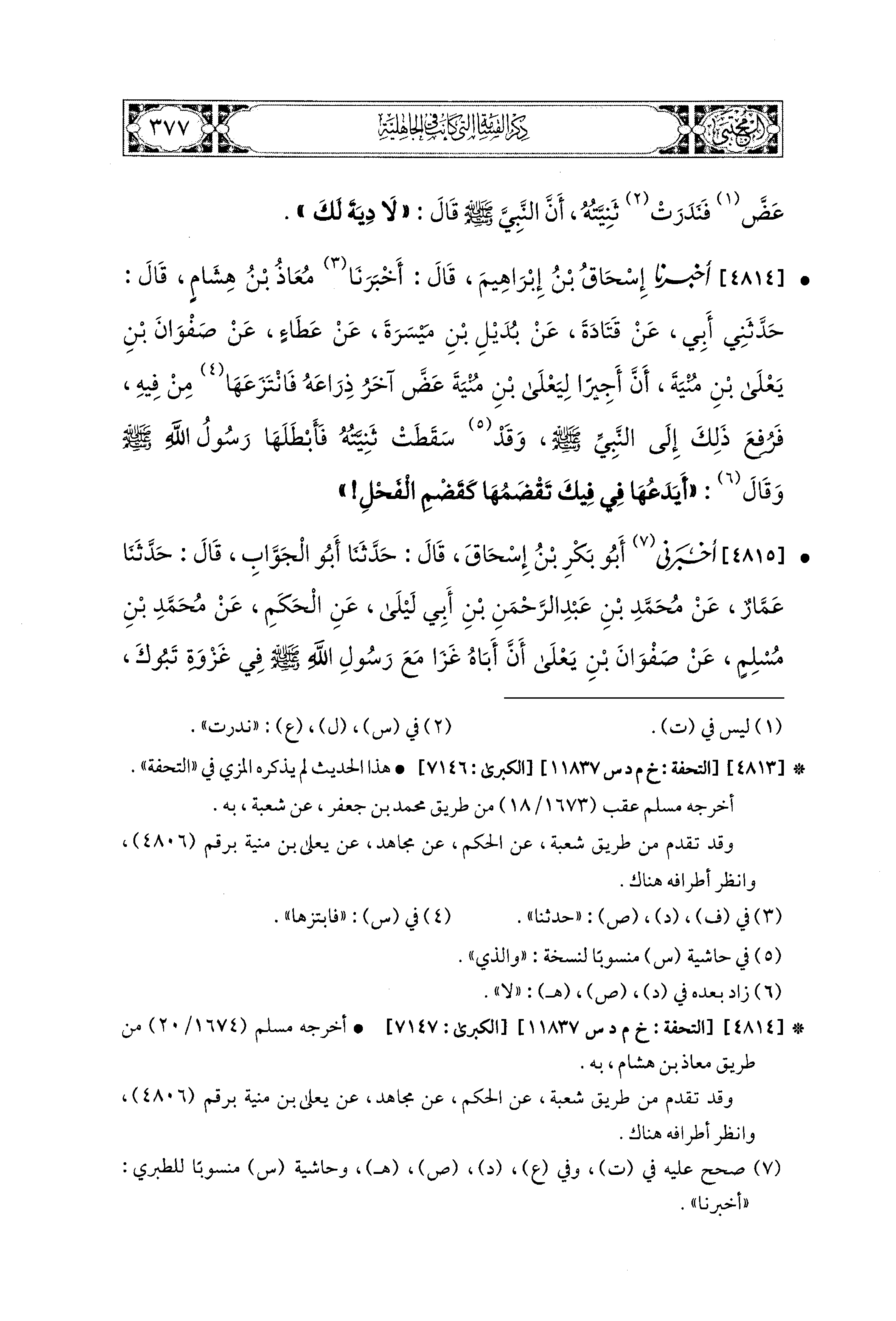 4815- أَخْبَرَني أَبو بَكْرِ بْنُ إِسحَاقَ، قال: حَدثنا أَبو الجَوَّابِ، قال: حَدثنا عَمَّارٌ، عَن مُحَمدِ بْنِ عَبدِ الرَّحمَنِ بْنِ أَبِي لَيْلَى، عَنِ الحَكَمِ، عَن مُحَمدِ بْنِ مُسْلِمٍ، عَن صَفْوَانَ بْنِ يَعْلَى؛ أَنَّ أَبَاهُ غَزَا مَعَ رَسُولِ اللهِ صَلى الله عَليه وسَلم فِي غَزْوَةِ تَبُوكَ فَاسْتَأْجَرَ أَجِيرًا، فَقَاتَلَ رَجُلاً، فَعَضَّ الرَّجُلُ ذِرَاعَهُ، فَلَمَّا أَوْجَعَهُ نَتَرَهَا فَأَنْدَرَ ثَنيَّتَهُ، فَرُفِعَ ذَلِكَ إِلَى رَسُولِ اللهِ صَلى الله عَليه وسَلم فَقَالَ: يَعْمِدُ أَحَدُكُمْ فَيَعَضُّ أَخَاهُ كَمَا يَعَضُّ الفَحْلُ، فَأَبْطَلَ ثَنيَّتَهُ.