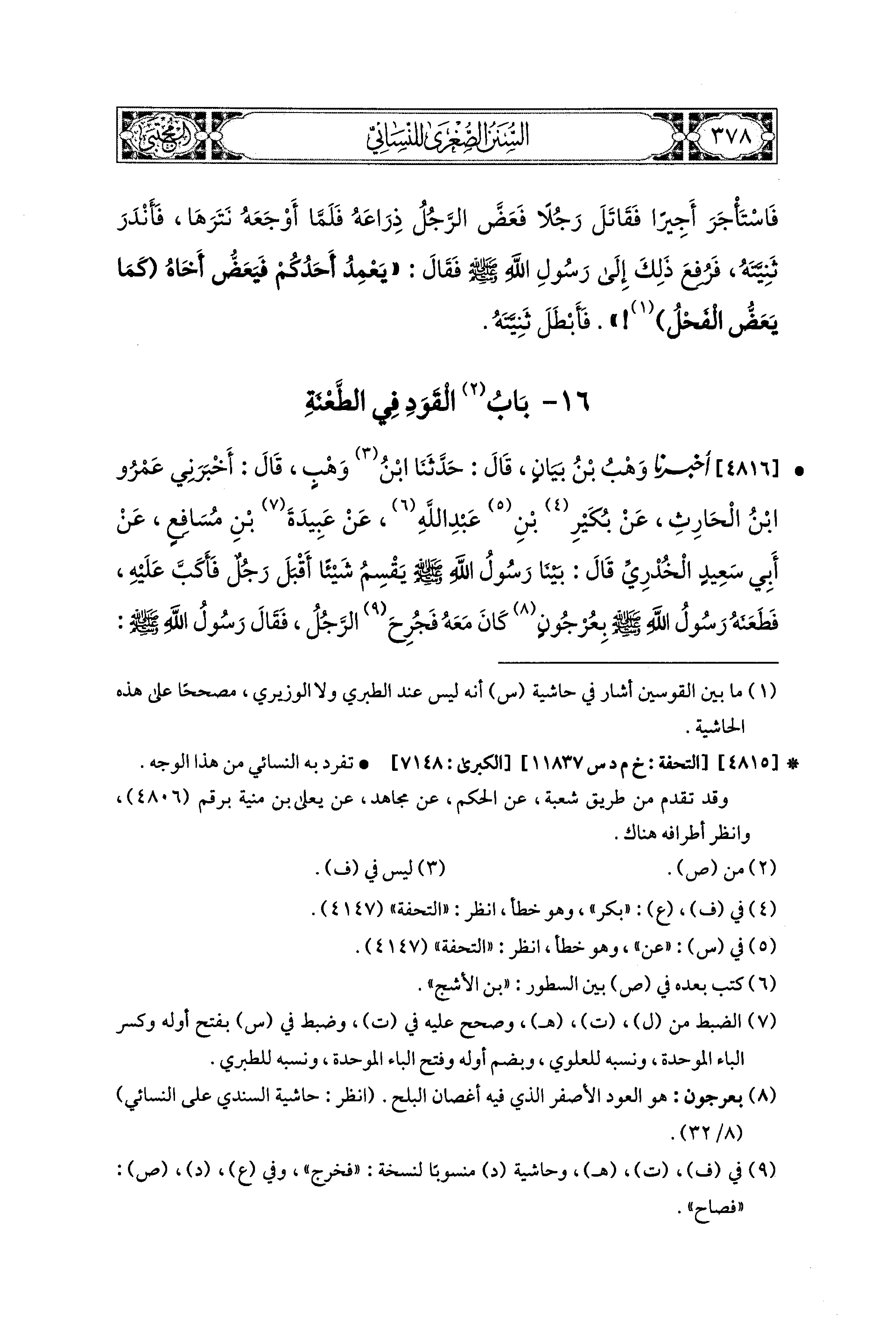 4816- أَخبَرَنا وَهْبُ بْنُ بَيَانٍ، قال: حَدثنا ابْنُ وَهْبٍ، قَالَ: أَخْبَرَني عَمْرُو بْنُ الحَارِثِ، عَن بُكَيْرِ بْنِ عَبدِ اللهِ، عَن عَبِيدَةَ بْنِ مُسَافِعٍ، عَن أَبِي سَعيدٍ الخُدْرِيِّ قَالَ: بَيْنَا رَسُولُ اللهِ صَلى الله عَليه وسَلم يَقْسِمُ شَيْئًا، أَقْبَلَ رَجُلٌ فَأَكَبَّ عَلَيْهِ فَطَعَنَهُ رَسُولُ اللهِ صَلى الله عَليه وسَلم بِعُرْجُونٍ كَانَ مَعَهُ، فَخَرَجَ (1) الرَّجُلُ، فَقَالَ رَسُولُ اللهِ صَلى الله عَليه وسَلم: تَعَالَ فَاسْتَقِدْ، قَالَ: بَلْ قَدْ عَفَوْتُ يَا رَسُولَ الله.