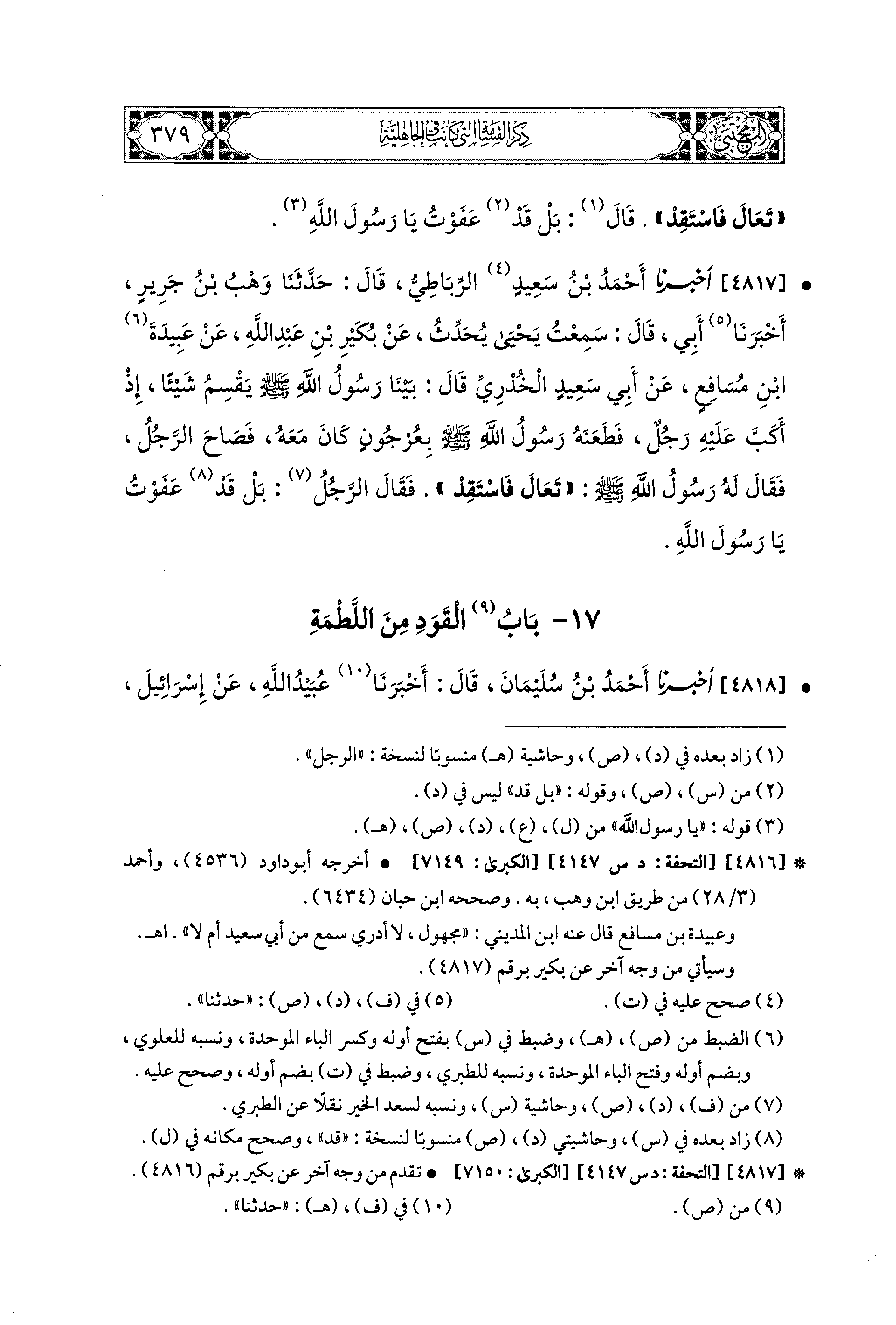 4817- أَخبَرَنا أَحْمَدُ بْنُ سَعيدٍ الرِّبَاطِيُّ، قال: حَدثنا وَهْبُ بْنُ جَرِيرٍ، أَخبَرنا أَبِي، قَالَ: سَمِعْتُ يَحيَى يُحَدِّثُ، عَن بُكَيْرِ بْنِ عَبدِ اللهِ، عَن عَبِيدَةَ بْنِ مُسَافِعٍ، عَن أَبِي سَعيدٍ الخُدْرِيِّ، قَالَ: بَيْنَا رَسُولُ اللهِ صَلى الله عَليه وسَلم يَقْسِمُ شَيْئًا إِذْ أَكَبَّ عَلَيْهِ رَجُلٌ، فَطَعَنَهُ رَسُولُ اللهِ صَلى الله عَليه وسَلم بِعُرْجُونٍ كَانَ مَعَهُ، فَصَاحَ الرَّجُلُ، فَقَالَ لَهُ رَسُولُ اللهِ صَلى الله عَليه وسَلم: تَعَالَ فَاسْتَقِدْ، فَقَالَ الرجل: بَلْ قد عَفَوْتُ يَا رَسُولَ الله.