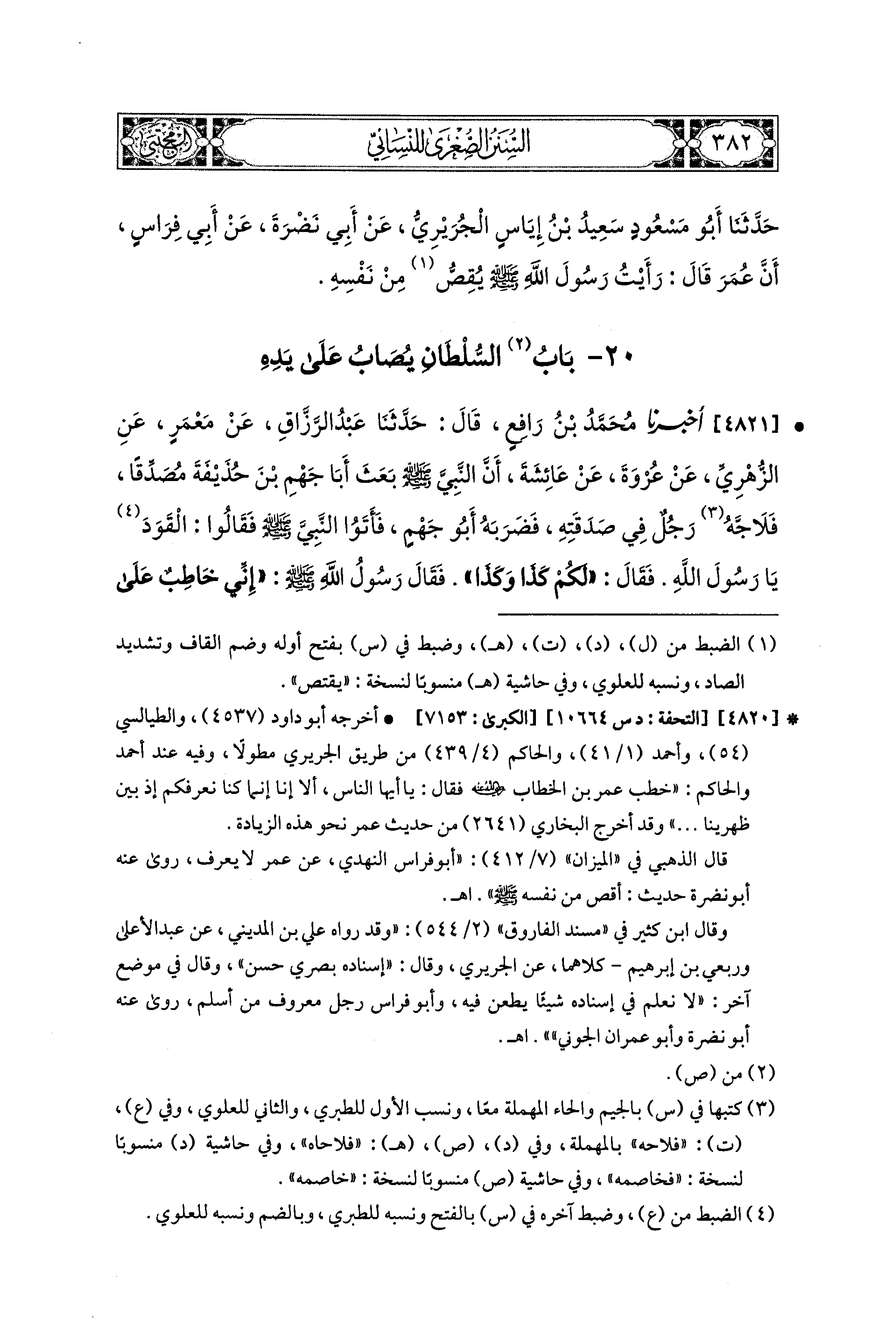 4821- أَخبَرَنا مُحَمد بْنُ رَافِعٍ، قال: حَدثنا عَبدُ الرَّزَّاقِ، عَن مَعْمَرٍ، عَنِ الزُّهْرِيِّ، عَن عُرْوَةَ، عَن عَائِشَةَ؛ أَنَّ النَّبيَّ صَلى الله عَليه وسَلم بَعَثَ أَبَا جَهْمِ بْنَ حُذَيفَةَ مُصَدِّقًا، فَلاَحَّهُ(1) رَجُلٌ فِي صَدَقَتِهِ، فَضَرَبَهُ أَبو جَهْمٍ، فَأَتَوْا النَّبيَّ صَلى الله عَليه وسَلم، فَقَالُوا: القَوَدُ يَا رَسُولَ اللهِ، فَقَالَ: لَكُمْ كَذَا وَكَذَا فَرَضُوا، فَقَالَ رَسُولُ اللهِ(2) صَلى الله عَليه وسَلم: إِنِّي خَاطِبٌ عَلَى النَّاسِ وَمُخْبِرُهُمْ بِرِضَاكُمْ، قَالُوا: نَعَمْ، فَخَطَبَ النَّبيُّ صَلى الله عَليه وسَلم، فَقَالَ: إِنَّ هَؤُلاَءِ أَتَوْني يُرِيدُونَ القَوَدَ، فَعَرَضْتُ عَلَيْهِمْ كَذَا وَكَذَا فَرَضُوا، قَالُوا: لاَ، فَهَمَّ المُهَاجِرُونَ بِهِمْ، فَأَمَرَهُمْ رَسُولُ اللهِ صَلى الله عَليه وسَلم أَنْ يَكُفُّوا، فَكَفُّوا، ثُمَّ دَعَاهُمْ، قَالَ: أَرَضِيتُمْ؟ قَالُوا: نَعَمْ، قَالَ: فَإِنِّي خَاطِبٌ عَلَى النَّاسِ وَمُخْبِرُهُمْ بِرِضَاكُمْ، قَالُوا: نَعَمْ، فَخَطَبَ النَّاسَ، ثُمَّ قَالَ: أَرَضِيتُمْ؟ قَالُوا: نَعَمْ.