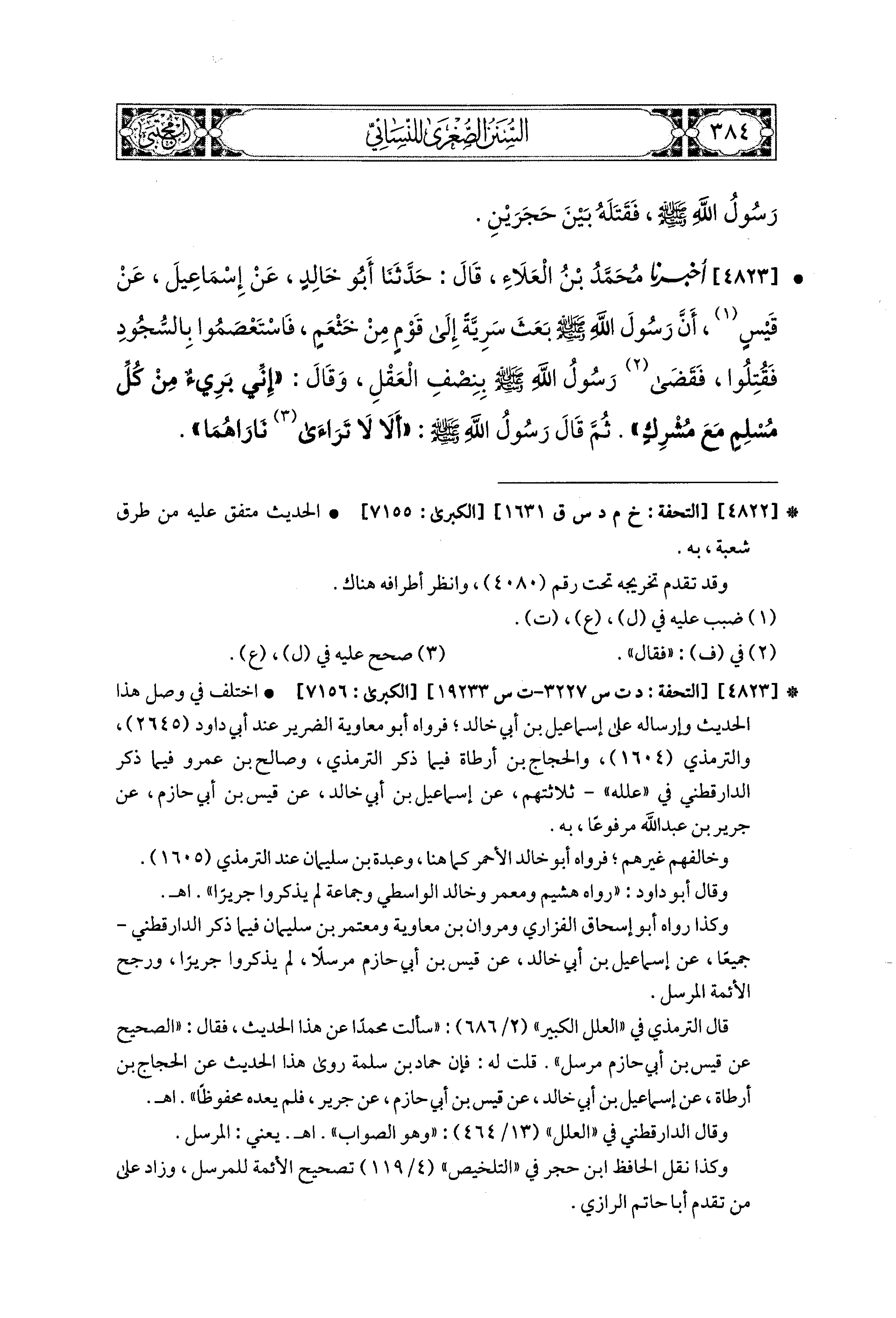 4823- أَخبَرَنا مُحَمد بْنُ العَلاَءِ، قال: حَدثنا أَبو خَالِدٍ، عَن إِسماعِيلَ، عَن قَيْسٍ؛ أَنَّ رَسُولَ اللهِ صَلى الله عَليه وسَلم بَعَثَ سَرِيَّةً إِلَى قَوْمٍ مِنْ خَثْعَمَ، فَاسْتَعْصَمُوا بِالسُّجُودِ، فَقُتِلُوا فَقَضَى رَسُولُ اللهِ صَلى الله عَليه وسَلم بِنِصْفِ العَقْلِ، وَقَالَ: إِنِّي بَرِيءٌ مِنْ كُلِّ مُسْلِمٍ مَعَ مُشْرِكٍ، ثُمَّ قَالَ رَسُولُ اللهِ صَلى الله عَليه وسَلم: أَلاَ لاَ تَرَاءَى نَارَاهُمَا.