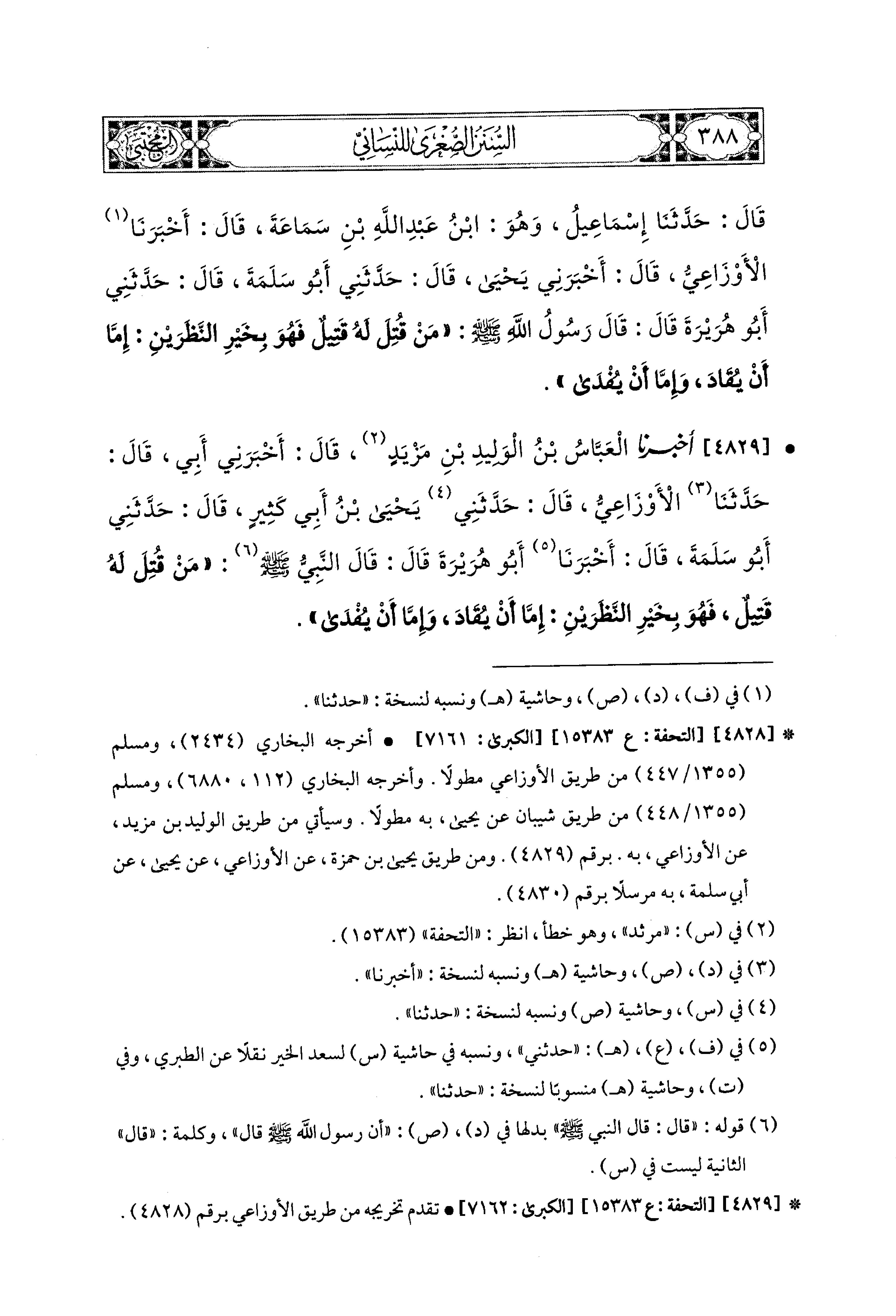 4829- أَخبَرَنا العَبَّاسُ بْنُ الوَلِيدِ بْنِ مَزْيَدَ، قَالَ: أَخْبَرَني أَبِي، قال: حَدثنا الأَوْزَاعِيُّ، قَالَ: حَدَّثَني يَحيَى بْنُ أَبِي كَثِيرٍ، قَالَ: حَدَّثَني أَبو سَلَمَةَ، قال: أَخبَرَنا أَبو هُرَيرَةَ، قَالَ: قَالَ رَسُولُ اللهِ صَلى الله عَليه وسَلم: مَنْ قُتِلَ لَهُ قَتِيلٌ فَهُوَ بِخَيْرِ النَّظَرَيْنِ، إِمَّا أَنْ يُقَادَ وَإِمَّا أَنْ يُفْدَى.