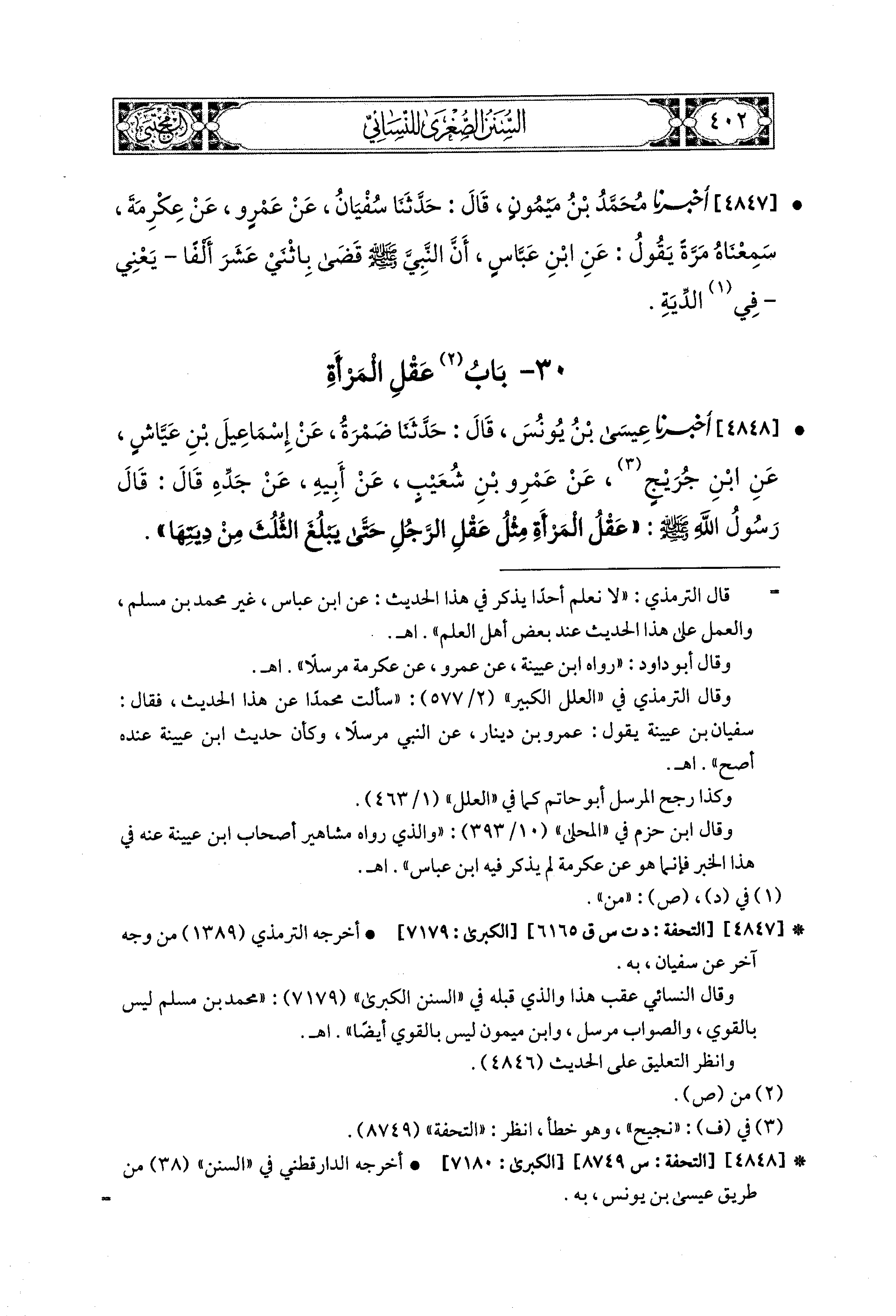 4847- أَخبَرَنا مُحَمد بْنُ مَيْمُونٍ، قال: حَدثنا سُفْيَانُ، عَن عَمْرٍو، عَن عِكْرِمَةَ، سَمِعْنَاهُ مَرَّةً يَقُولُ: عَنِ ابنِ عَبَّاسٍ؛ أَنَّ النَّبيَّ صَلى الله عَليه وسَلم قَضَى بِاثْنَيْ عَشَرَ أَلْفًا، يَعْني فِي الدِّيَةِ.