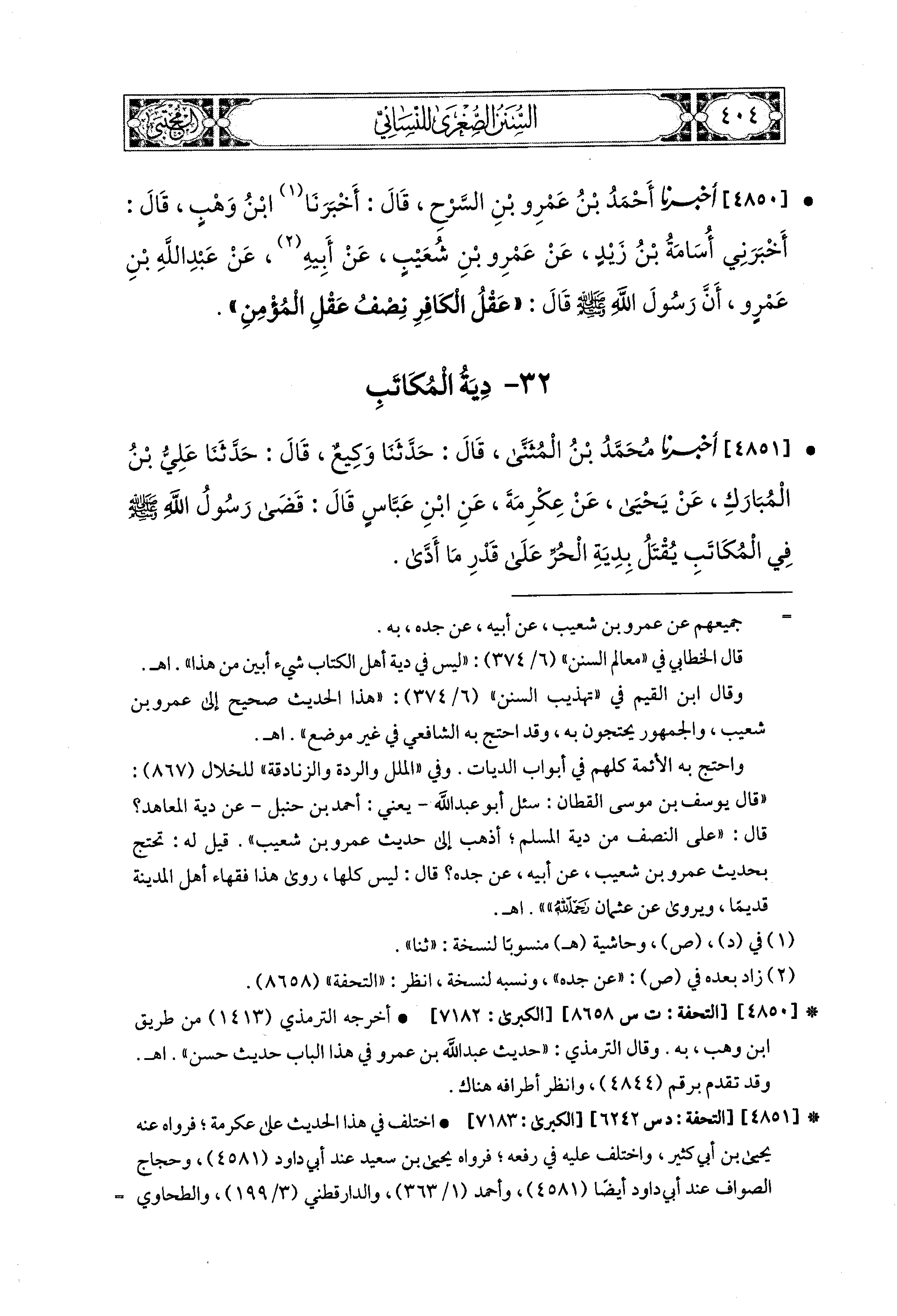 4850- أَخبَرَنا أَحْمَدُ بْنُ عَمْرِو بْنِ السَّرْحِ، قَالَ: أَخبَرنا ابْنُ وَهْبٍ، قَالَ: أَخْبَرَني أُسَامَةُ بْنُ زَيْدٍ، عَن عَمْرِو بْنِ شُعَيبٍ، عَن أَبِيهِ، عَن عَبد اللهِ بن عَمْرٍو، أَنَّ رَسُولَ اللهِ صَلى الله عَليه وسَلم قَالَ: عَقْلُ الكَافِرِ نِصْفُ عَقْلِ المُؤْمِنِ.