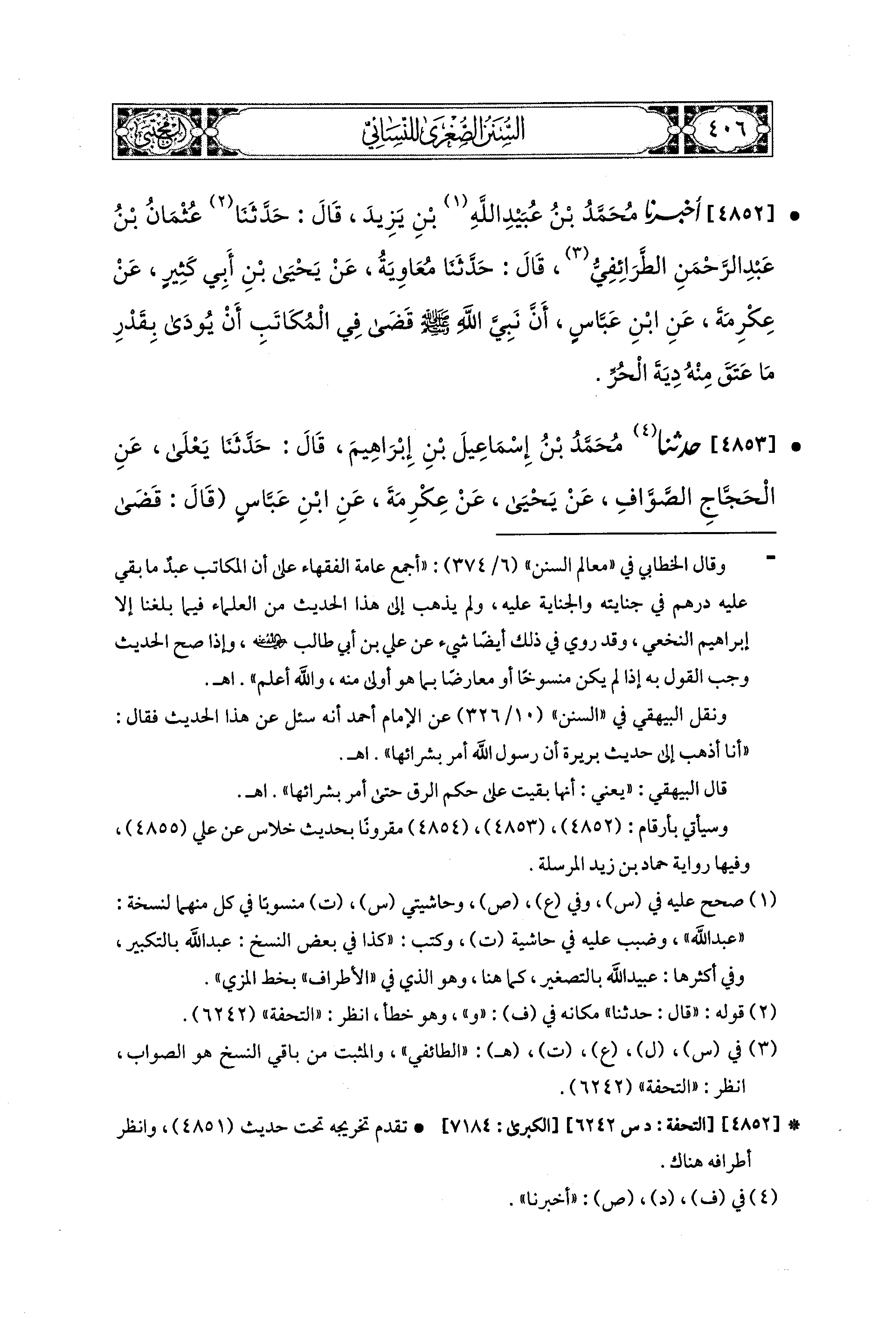 4852- أَخبَرَنا مُحَمد بْنُ عُبَيدِ اللهِ بْنِ يَزِيدَ، قال: حَدثنا عُثمَانُ بْنُ عَبدِ الرَّحمَنِ الطَّرَائِفِيُّ، قال: حَدثنا مُعَاوِيَةُ، عَن يَحيَى بْنِ أَبِي كَثِيرٍ، عَن عِكْرِمَةَ، عَنِ ابنِ عَبَّاسٍ؛ أَنَّ نَبِيَّ اللهِ صَلى الله عَليه وسَلم قَضَى فِي المُكَاتَبِ أَنْ يُودَى بِقَدْرِ مَا عَتَقَ مِنْهُ دِيَةَ الحُرِّ.